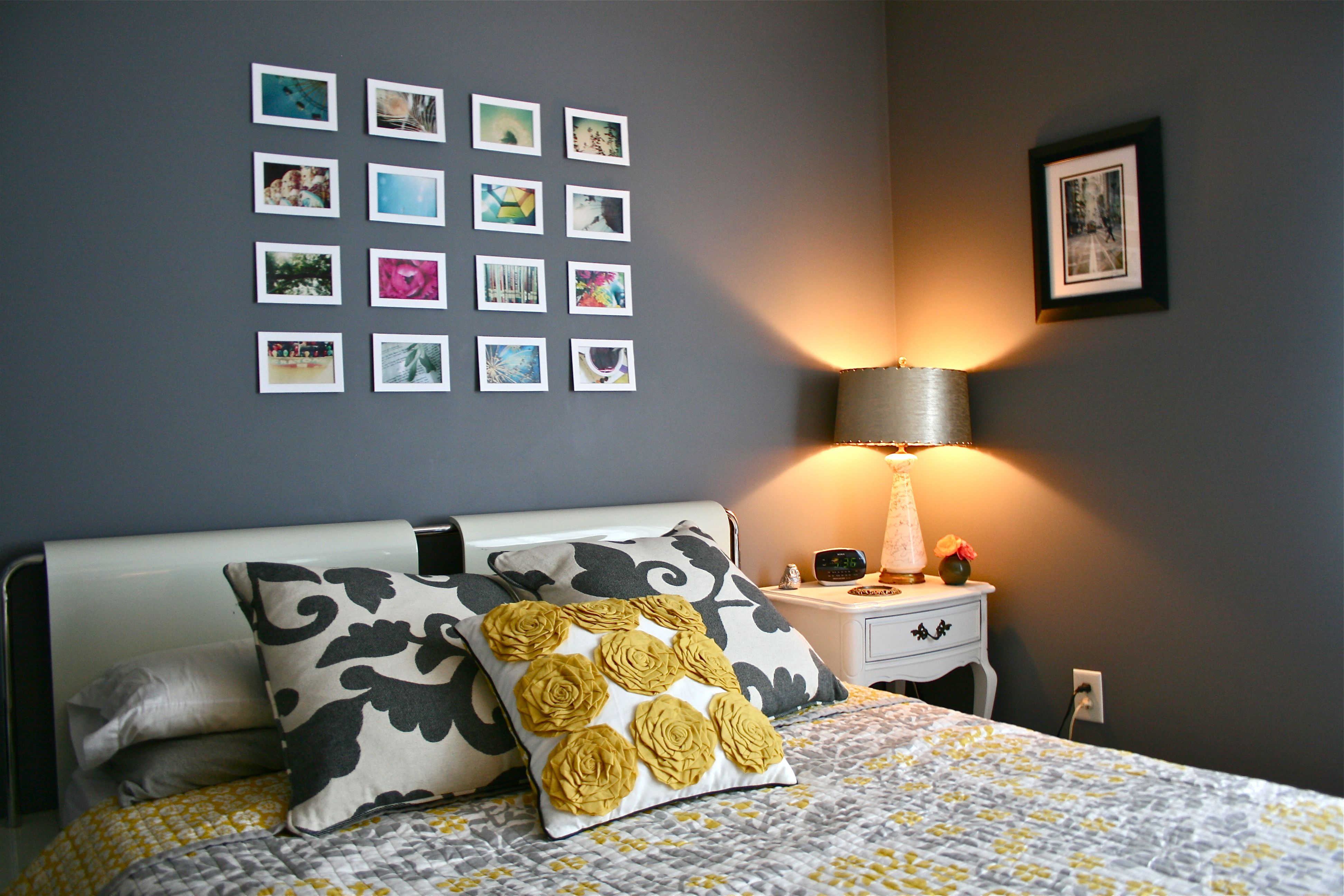 Here are a few wide shots of the room as a whole, now with the new quilt, pillows (the white and gray ones actually came off of the new couch) and restyled night stand: