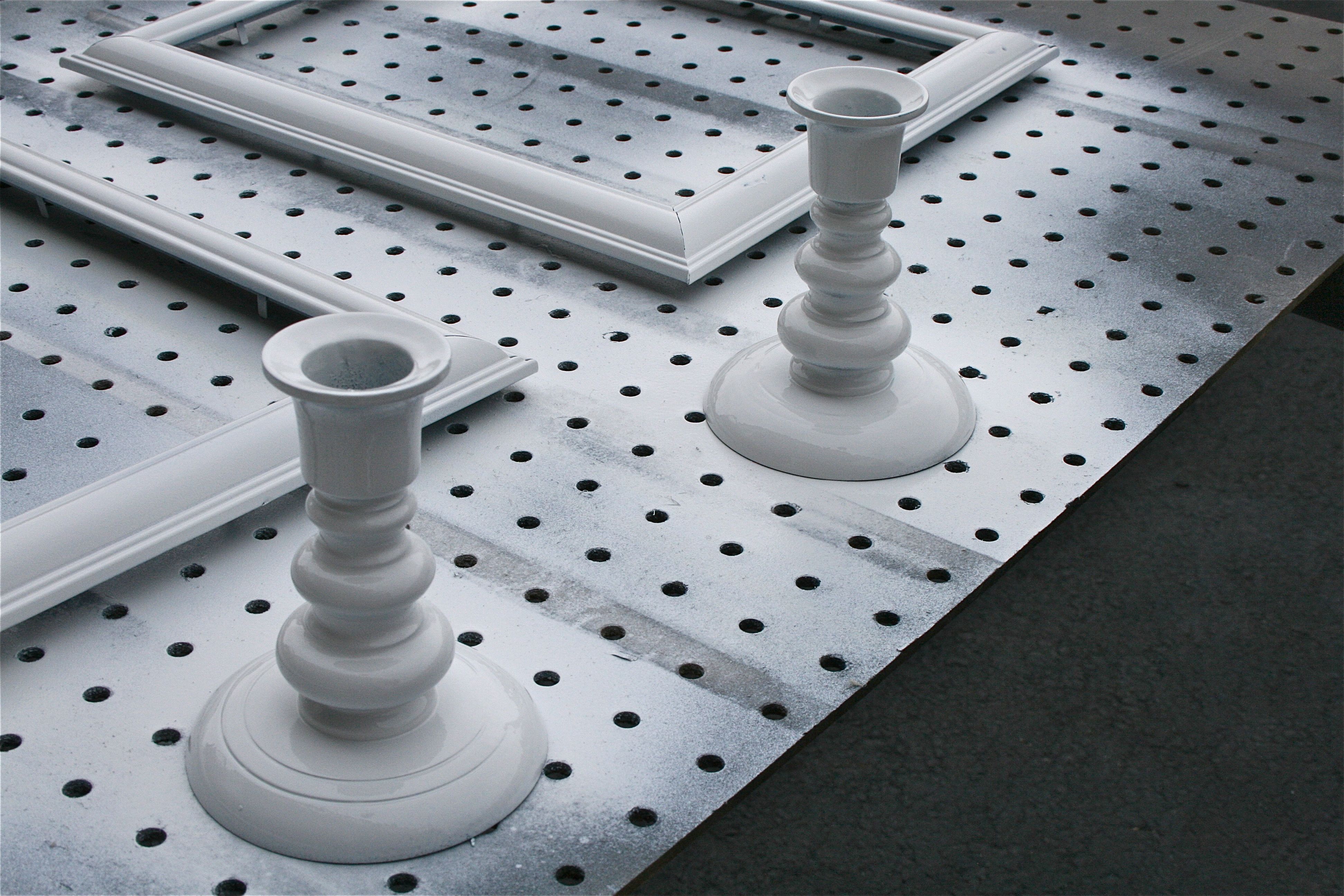 So John helped me by cleaning them up with a bit of rubbing alcohol and then I got to work with a can of white spray paint. As you saw in yesterday’s post, white spray paint can easily modernize an old-looking piece – I’m also a firm believer that it highlights all the unique lines, angles and details of an ornate piece. These two brass candle sticks were screaming for it 🙂