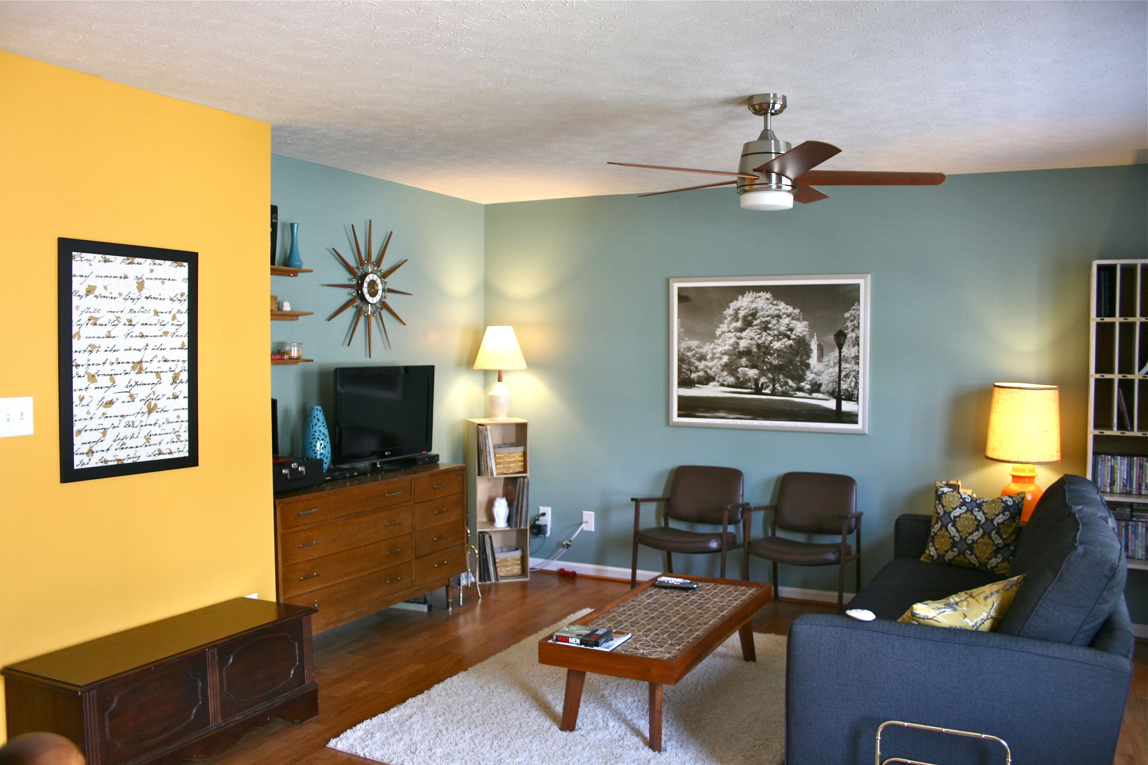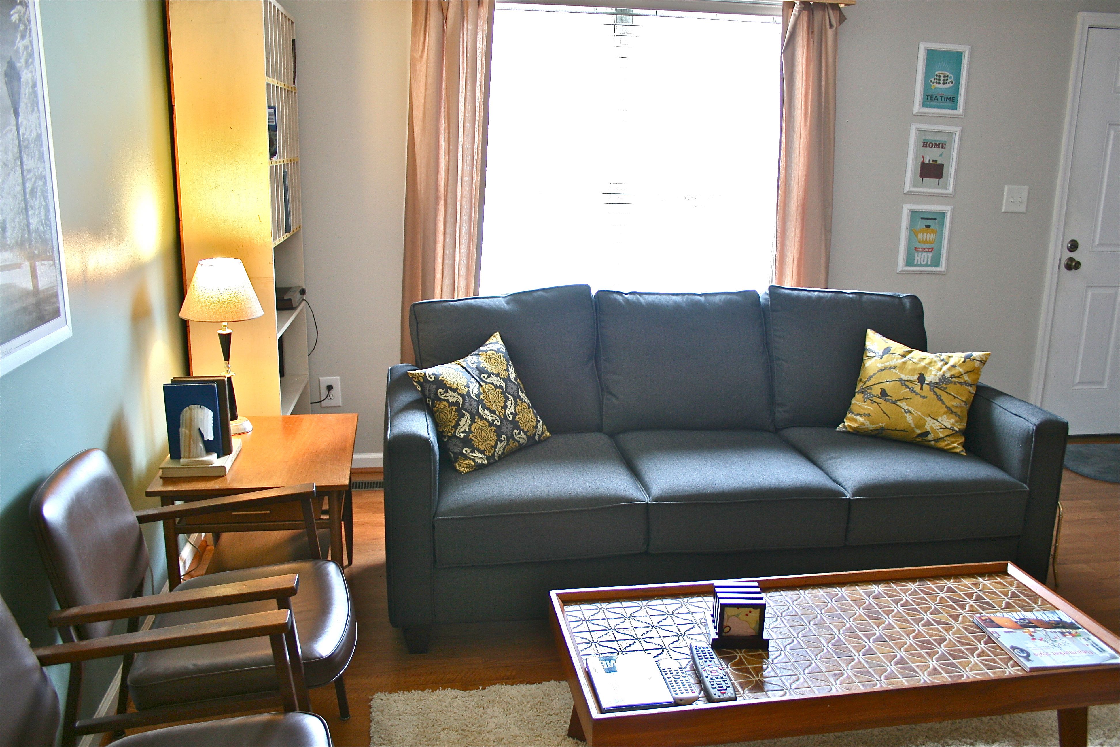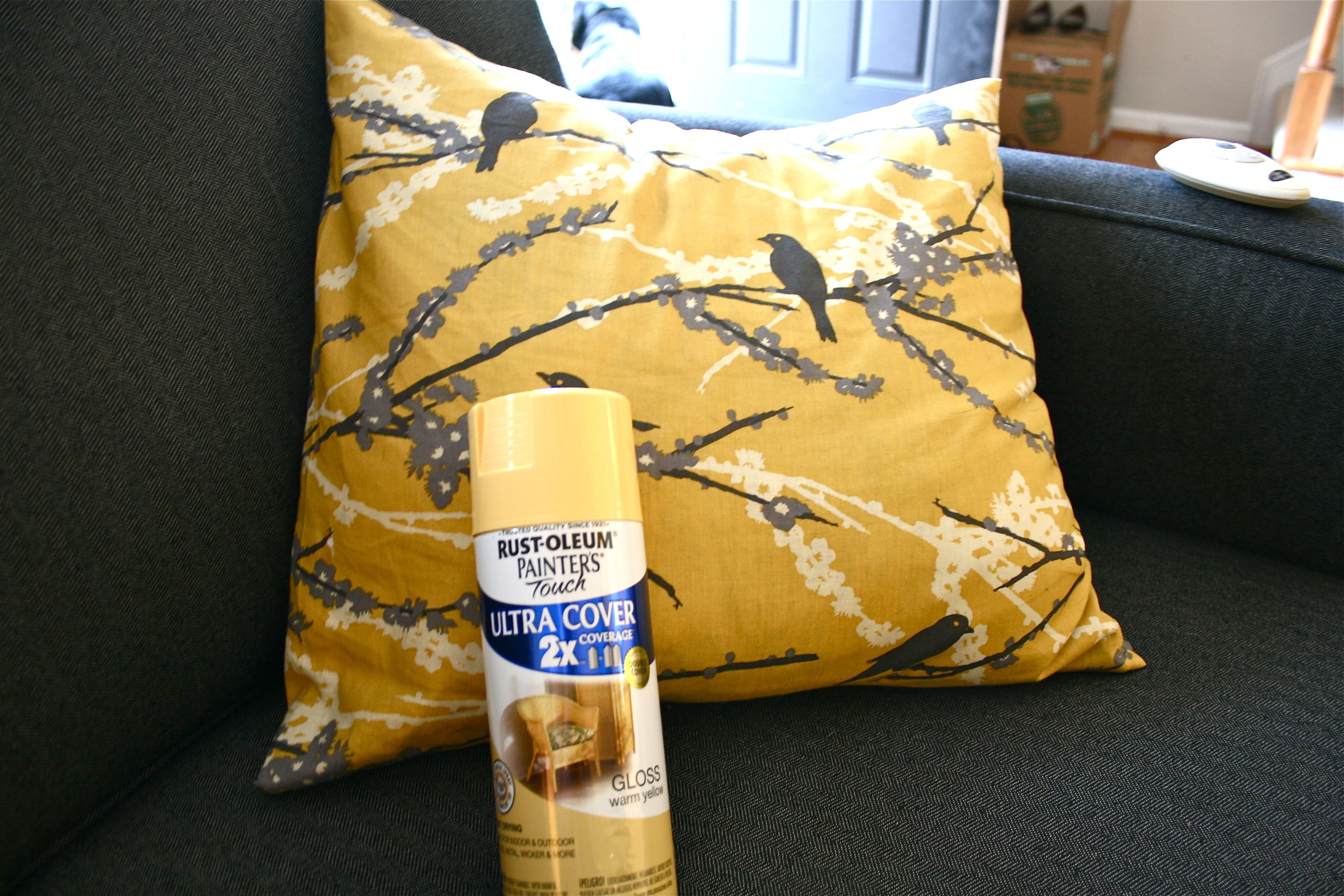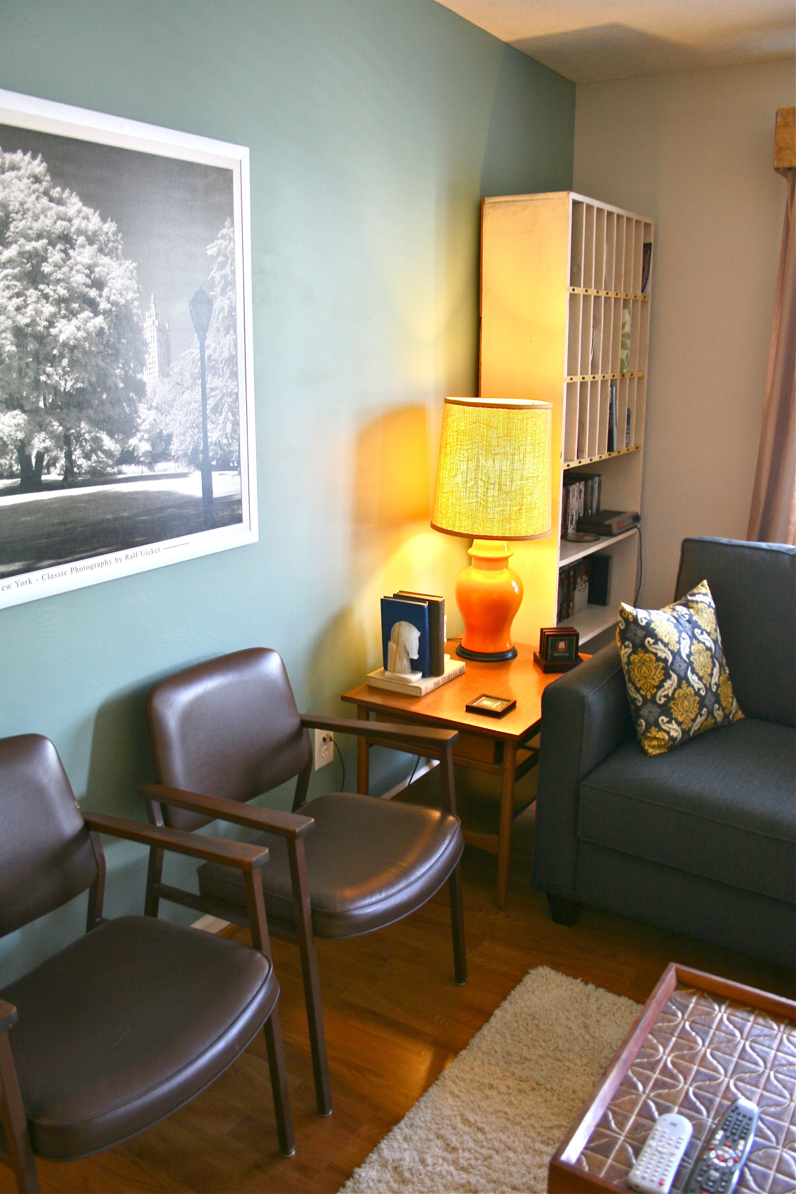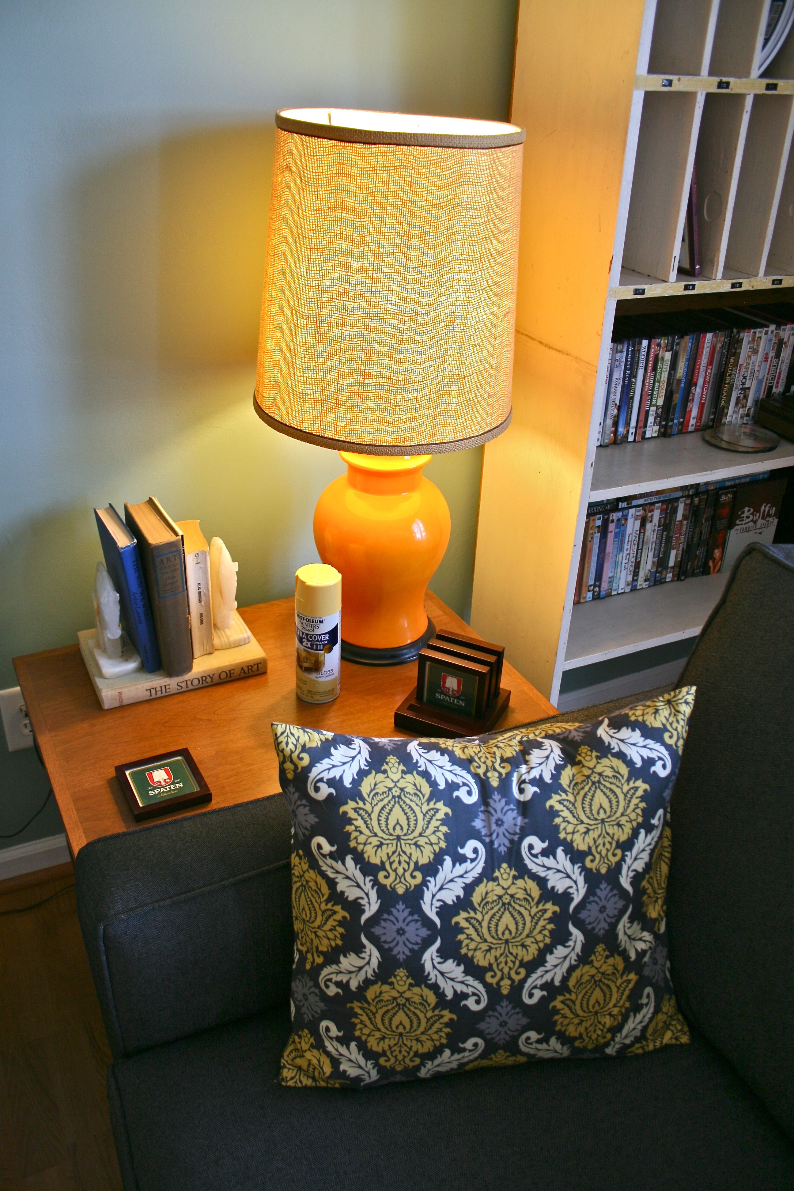 I DID go out and buy some spray paint in the correct shade of yellow to match the living room pillows (see photo below), but I’ve never been one for matchy matchy looks (you should see the outfits I put together) – Therefore, I decided to leave the more-orange-then-yellow lamp alone. It brings a little more dimension to the room and also that 1960’s flair I l-o-v-e.