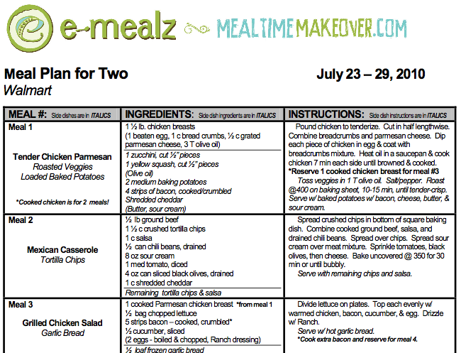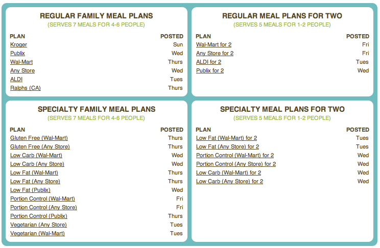 Here’s the low down: First you choose your meal plan. They have several options from 5 meals to 7 meals per week, recipes that serve 1 to 2 people or 4 to 6 people. You can even choose an option that gives you recipes that are low in fat, low in carbs, portion controlled or gluten-free! You also specify your grocery store – I chose Wal-Mart because they have good prices on groceries, but you can do Publix, Kroger or “Any Store” depending on where you shop.
