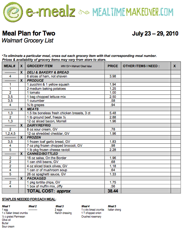 The staples are listed at the bottom to show you what you’ll need for the meals but that you probably already have in your pantry. If you DON’T happen to have bread crumbs or sour cream though, you can simply write it in under the “Other Items I Need” notes section. Oh, and did you check out the projected total cost for all of that stuff? $38.44!!! For a whole week’s worth of dinners!! Not too bad at all…They help you keep costs down by listing shopping items that are generic and don’t cost as much – For example, all the items that have a “GV” next to them mean “Great Value”, which is Wal-Mart’s generic brand. MUCH cheaper than the name brand stuff.