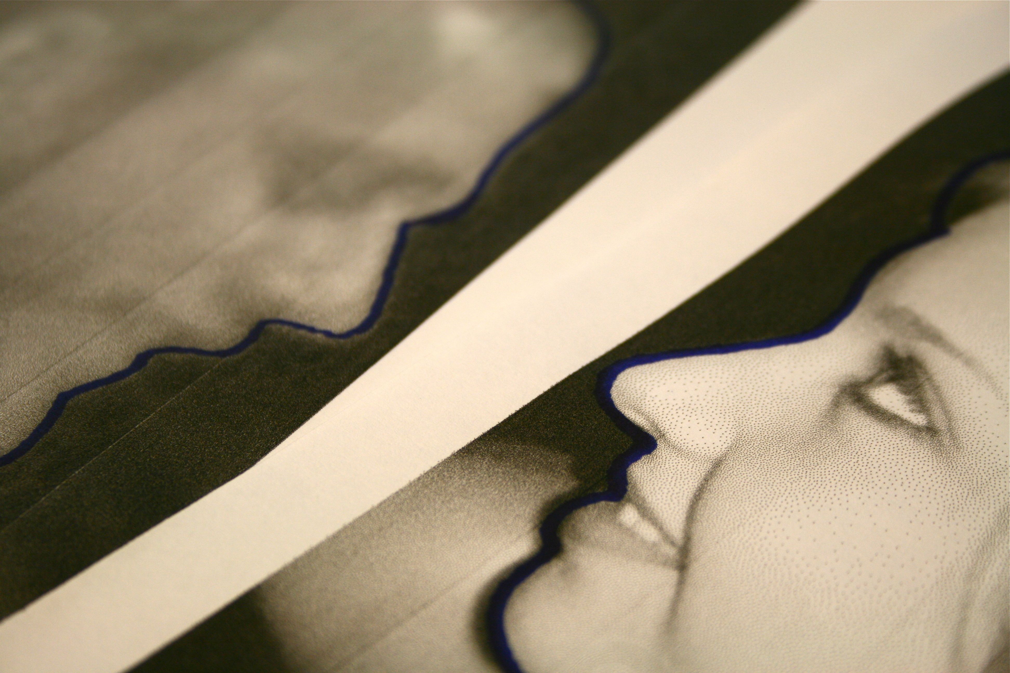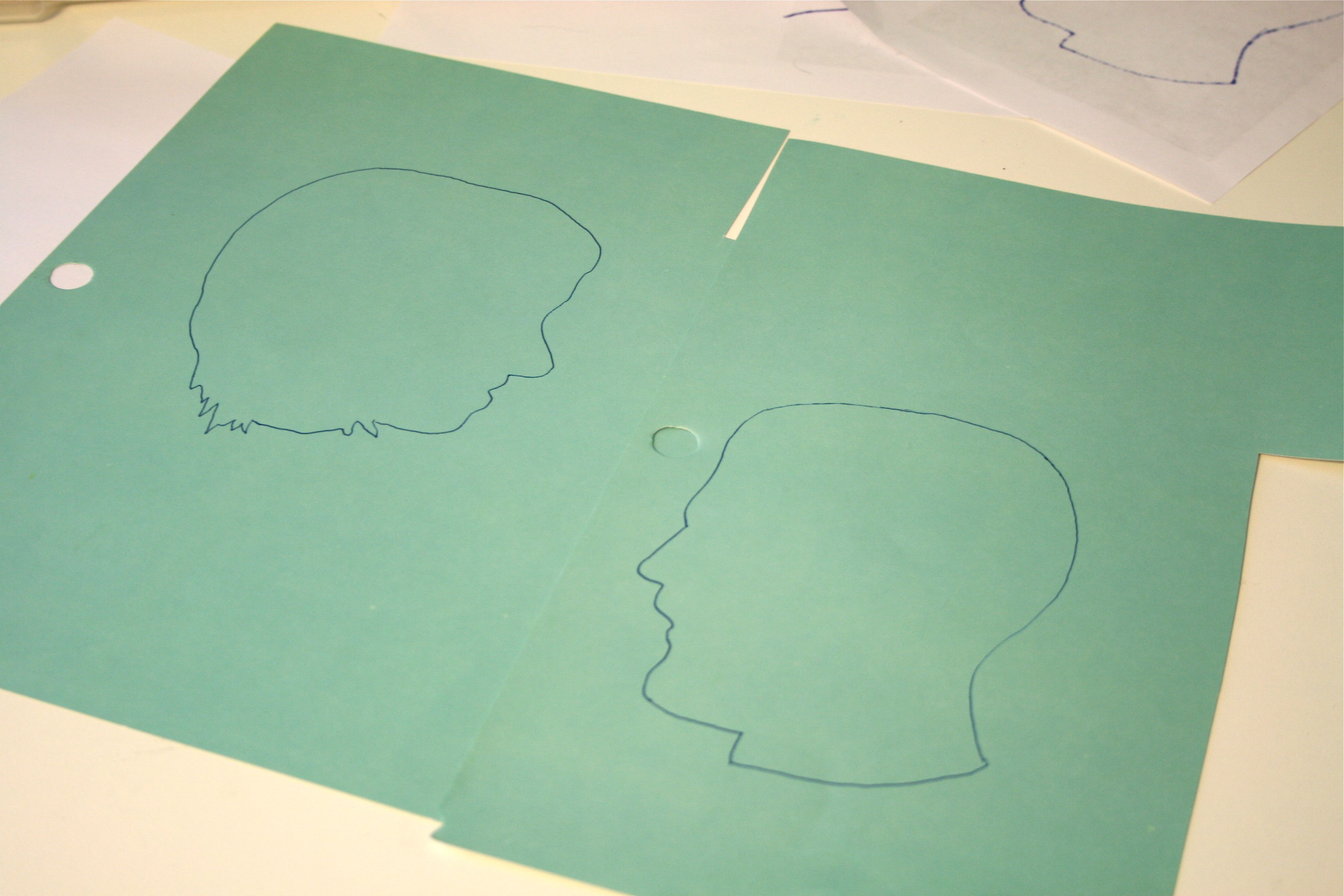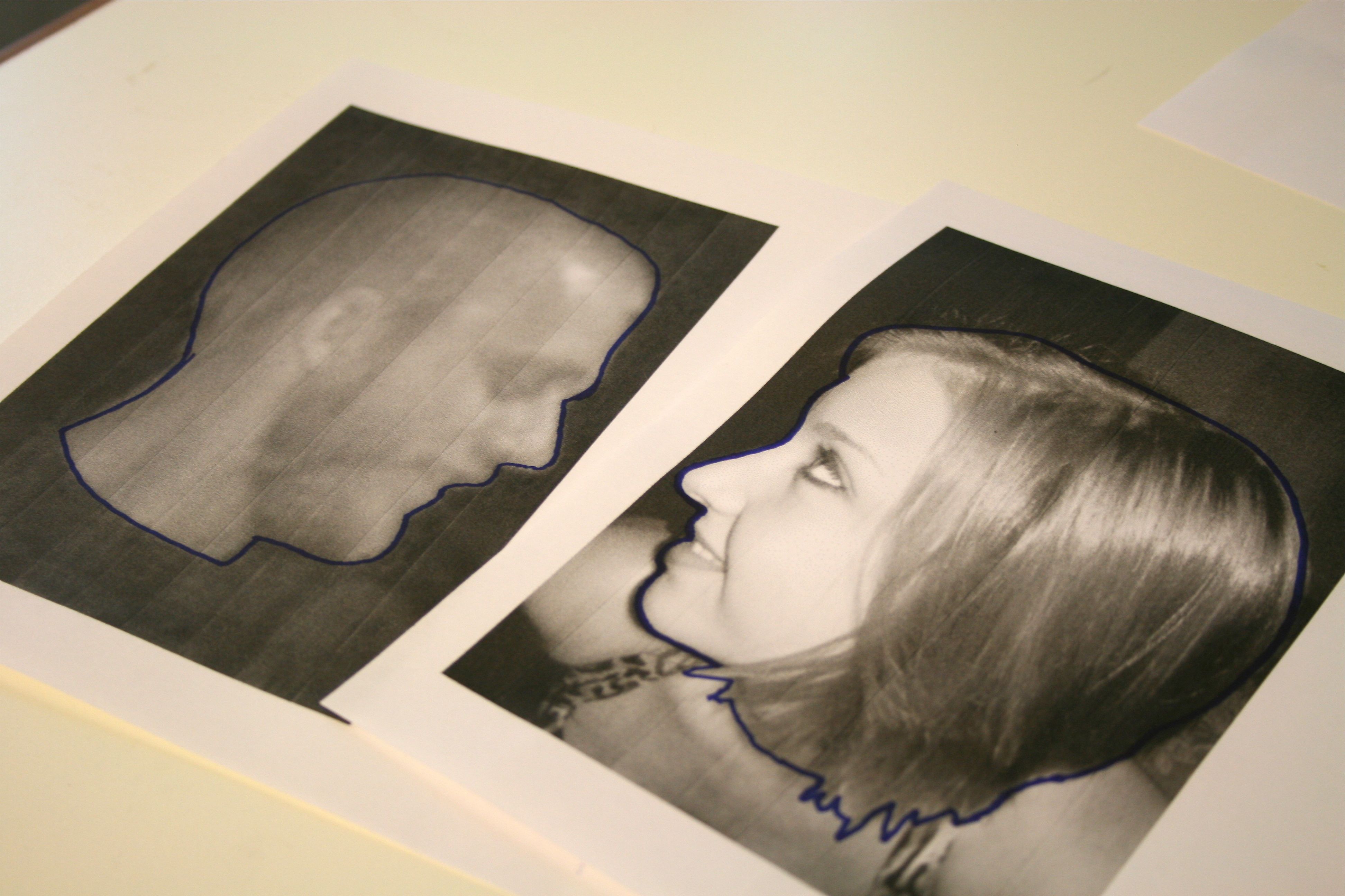 I printed out both photos in black and white (although it wouldn’t have mattered if I printed them in color – I just wasn’t about to waste the ink in my printer for color photos I was going to mark up). Then I grabbed a Sharpie marker and traced around the faces.