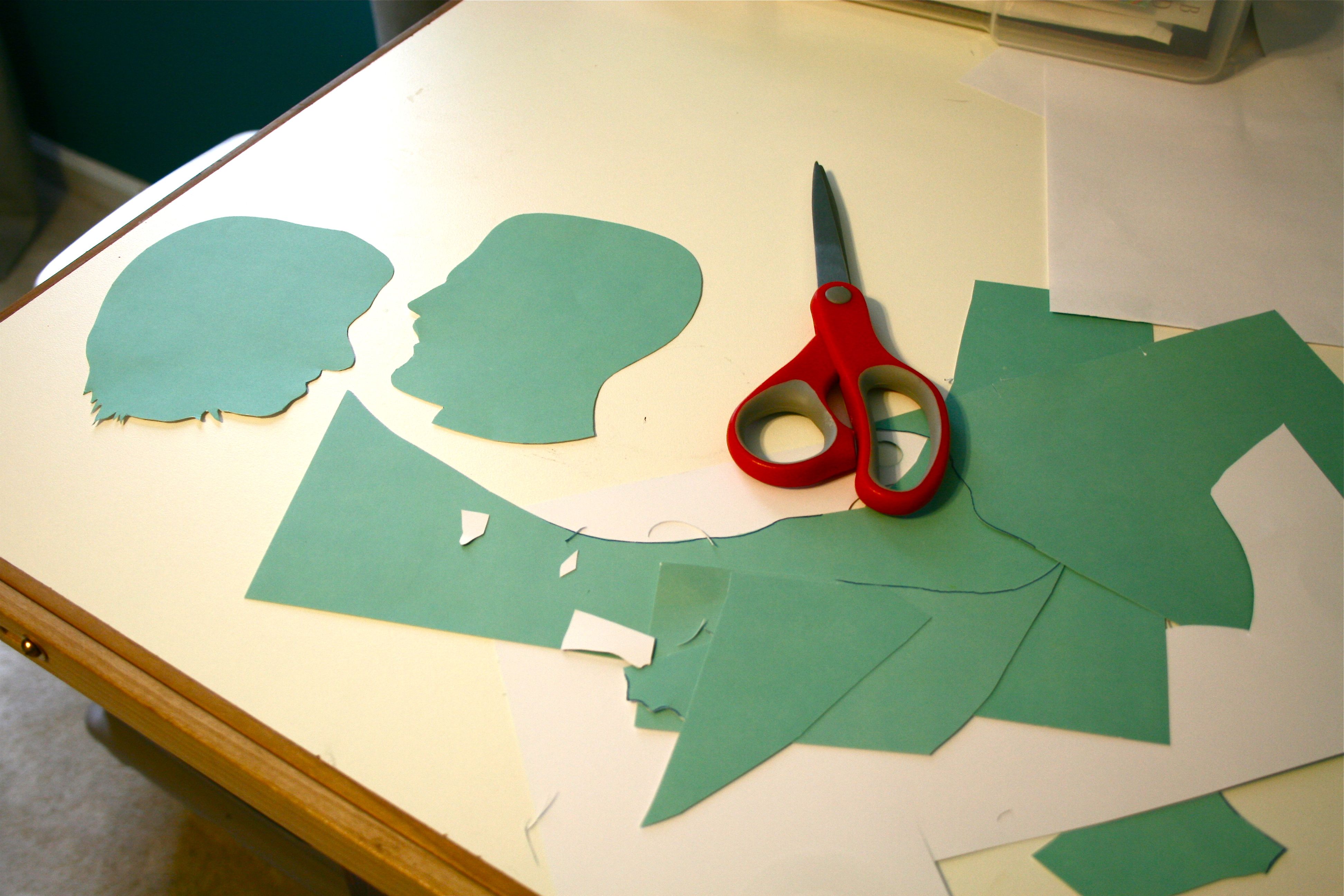 This is where I have to chuckle at my process a bit…Although it was a silly idea, it totally worked! I took my traced photos, held them up to the studio window, layered the teal scrapbook paper on top and drew along the Sharpie line! Easy as pie. Maybe like lions and their natural instinct to hunt, woman are born with the random ability to know how to make a silhouette.