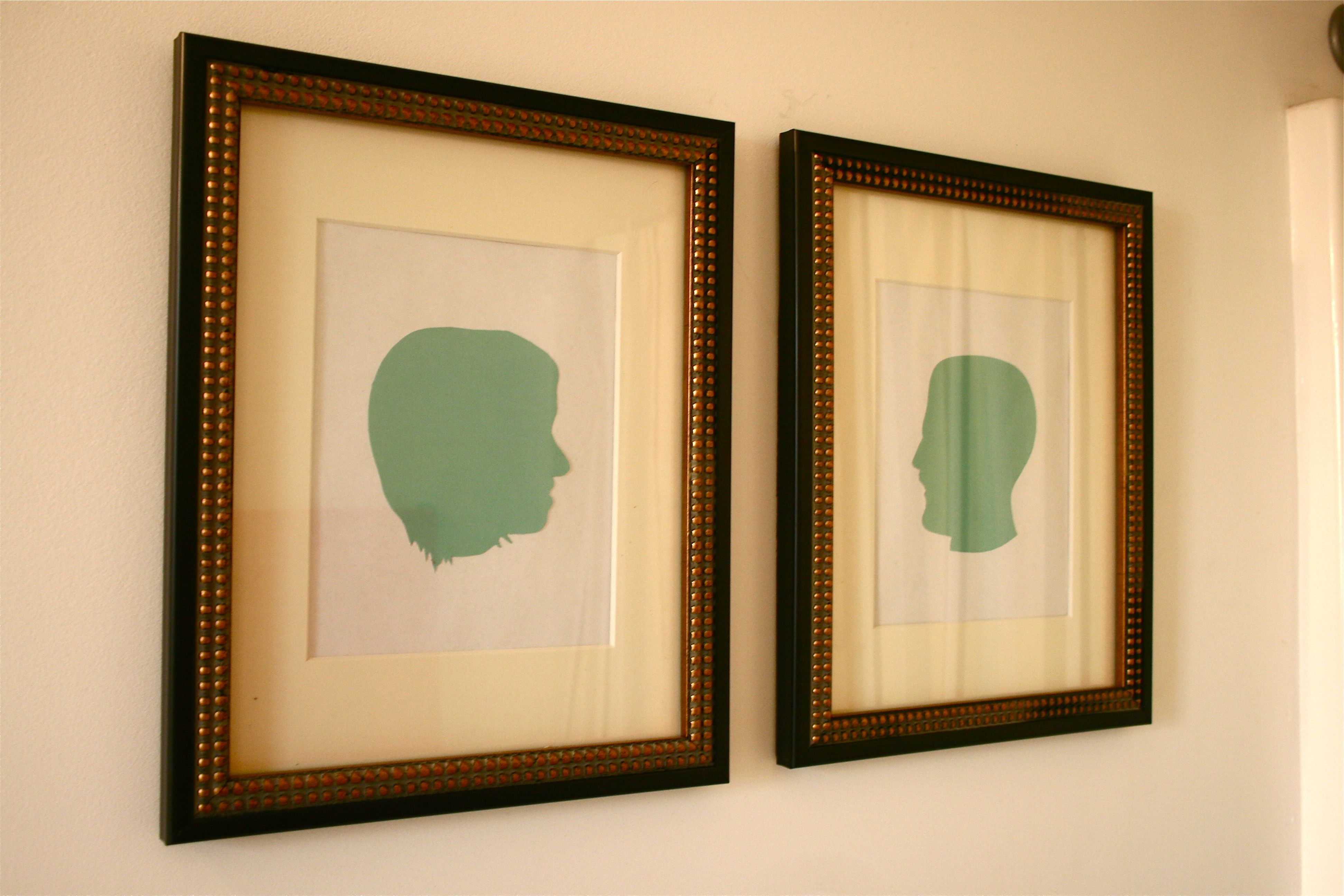 This past weekend though, I finally found a moment to get them their glass homes – I picked up two 11×14 frames at Ross for $8.99. The frames actually came with cream-colored mats, but I figured I’d remove those since I had the silhouettes all done up with the black mats. Once I got them in the frame though with the black, it read a little too dark…So out went the black mats and in went the cream ones again! Here they are in their complete state 🙂