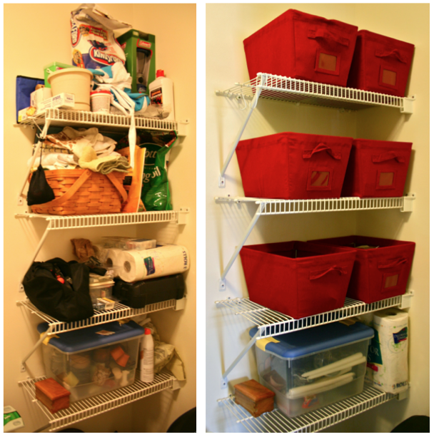 I realized afterwards that I needed two more of the red canvas boxes, and I still need to type up labels for the convenient little plastic inserts so we know what’s in each box, but it’s already SOOOOOOOOOOOOOOO much better…Speaking of, I think this calls for a side-by-side comparison.