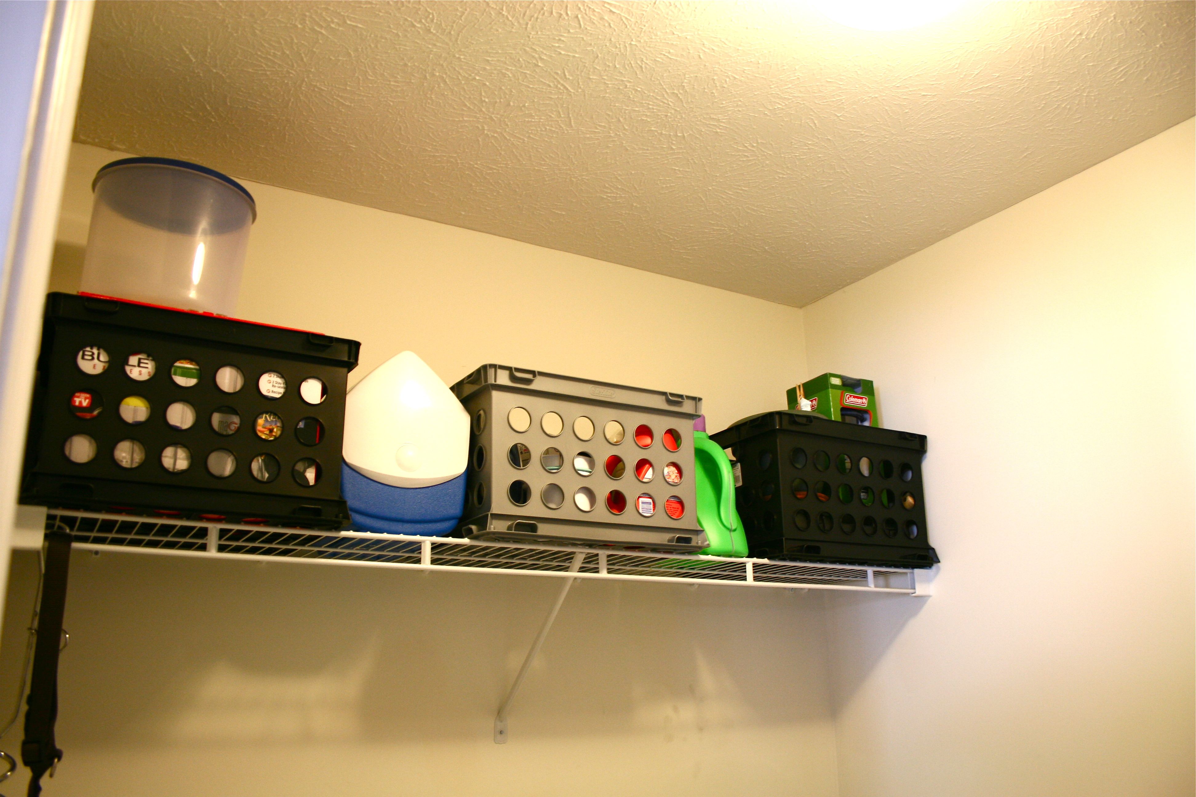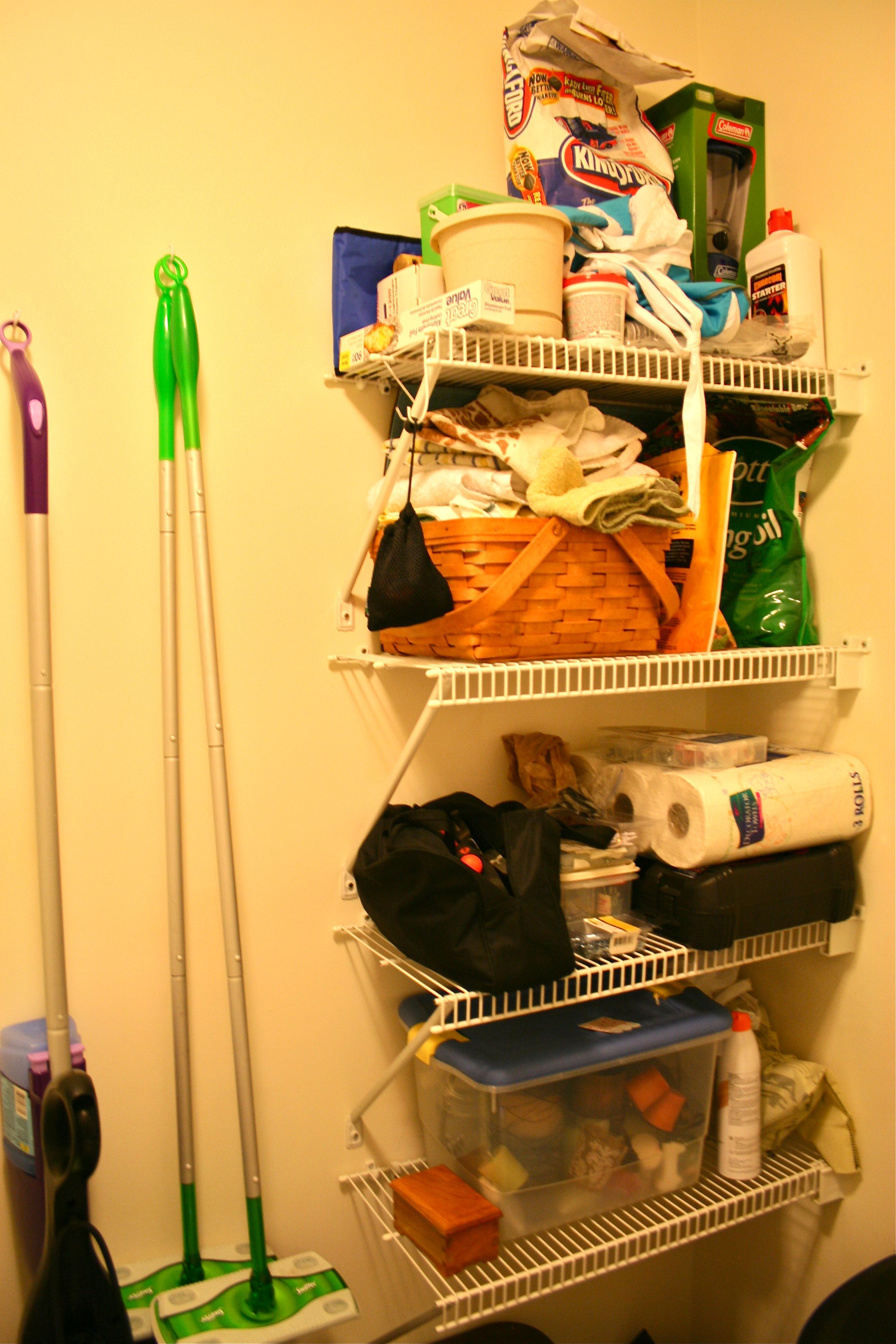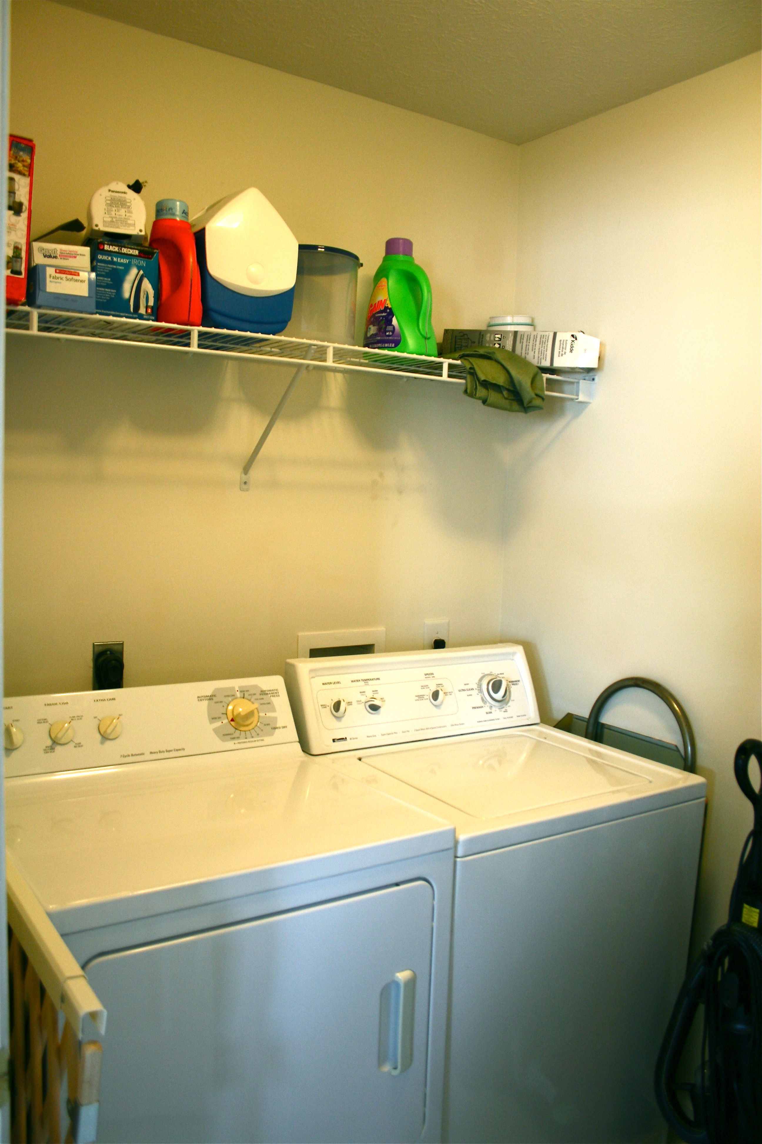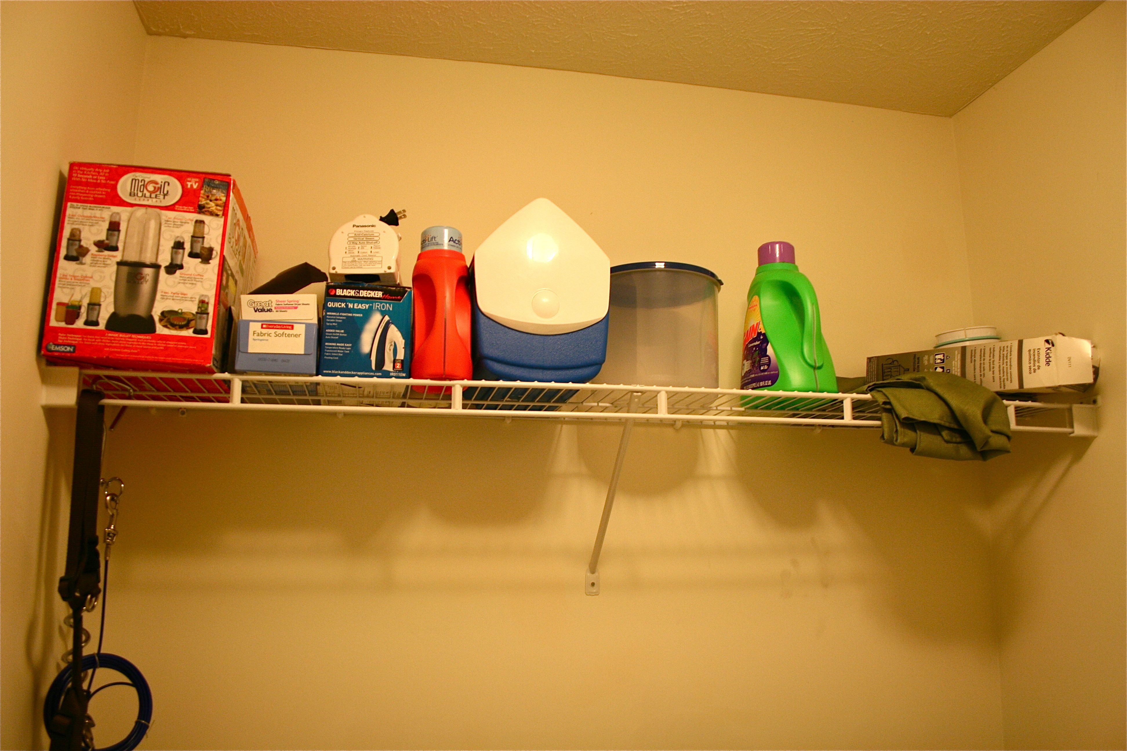 Oh my GOSH, I’m so embarrassed to show you that…You know how sometimes you don’t realize how bad that too-tight pair of jeans looks on you until you see a picture of yourself and you’re like “HOLY CRAP! That’s how I look in those?!” – An objective perspective on things can really be a kick in the gut. I had no idea until just this very moment how bad our laundry room looked until I saw this picture – Especially those top two shelves. I guess since we can get to all the stuff we really need to get to, I never really noticed how the rest of the shelves looked…