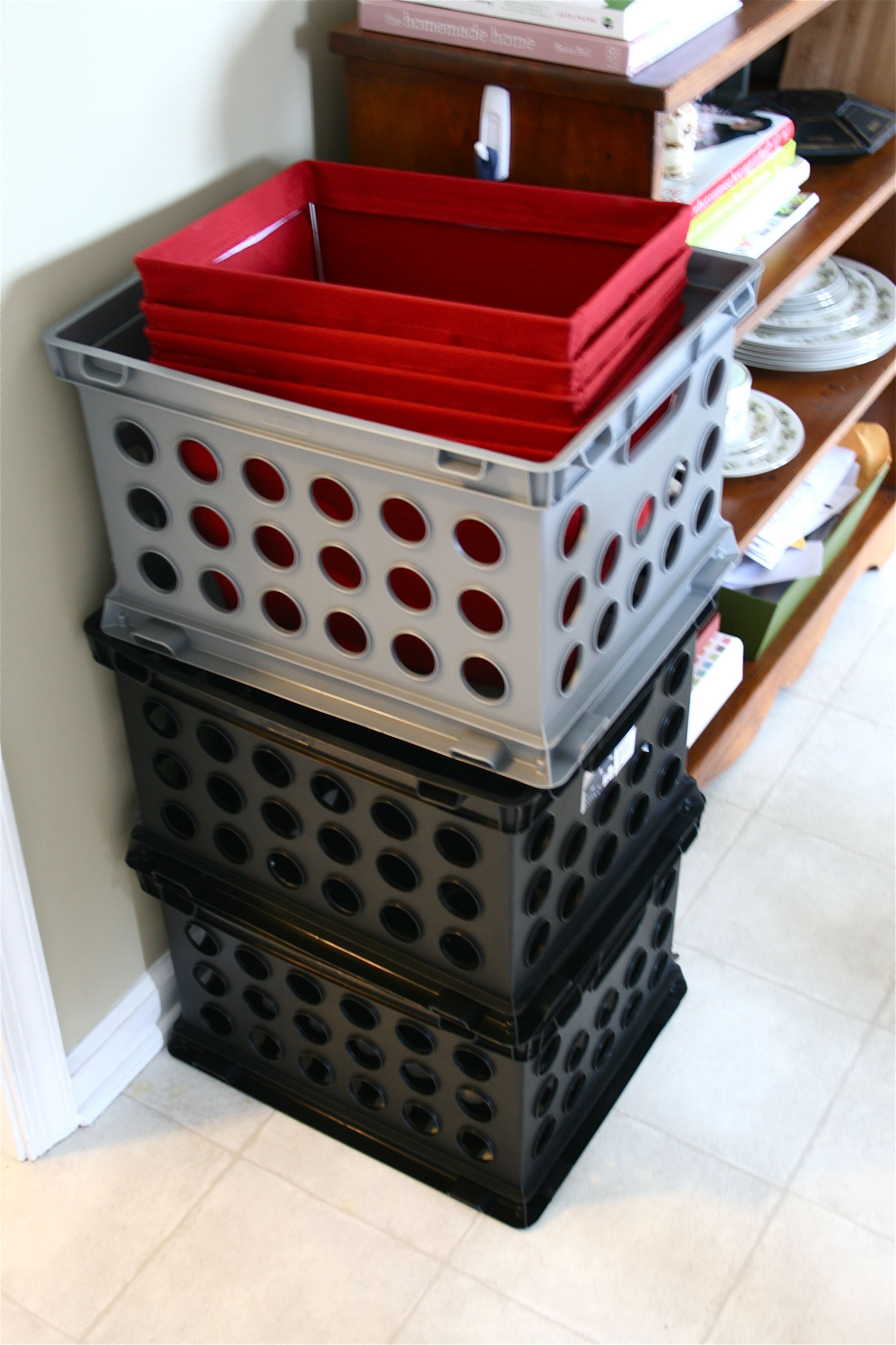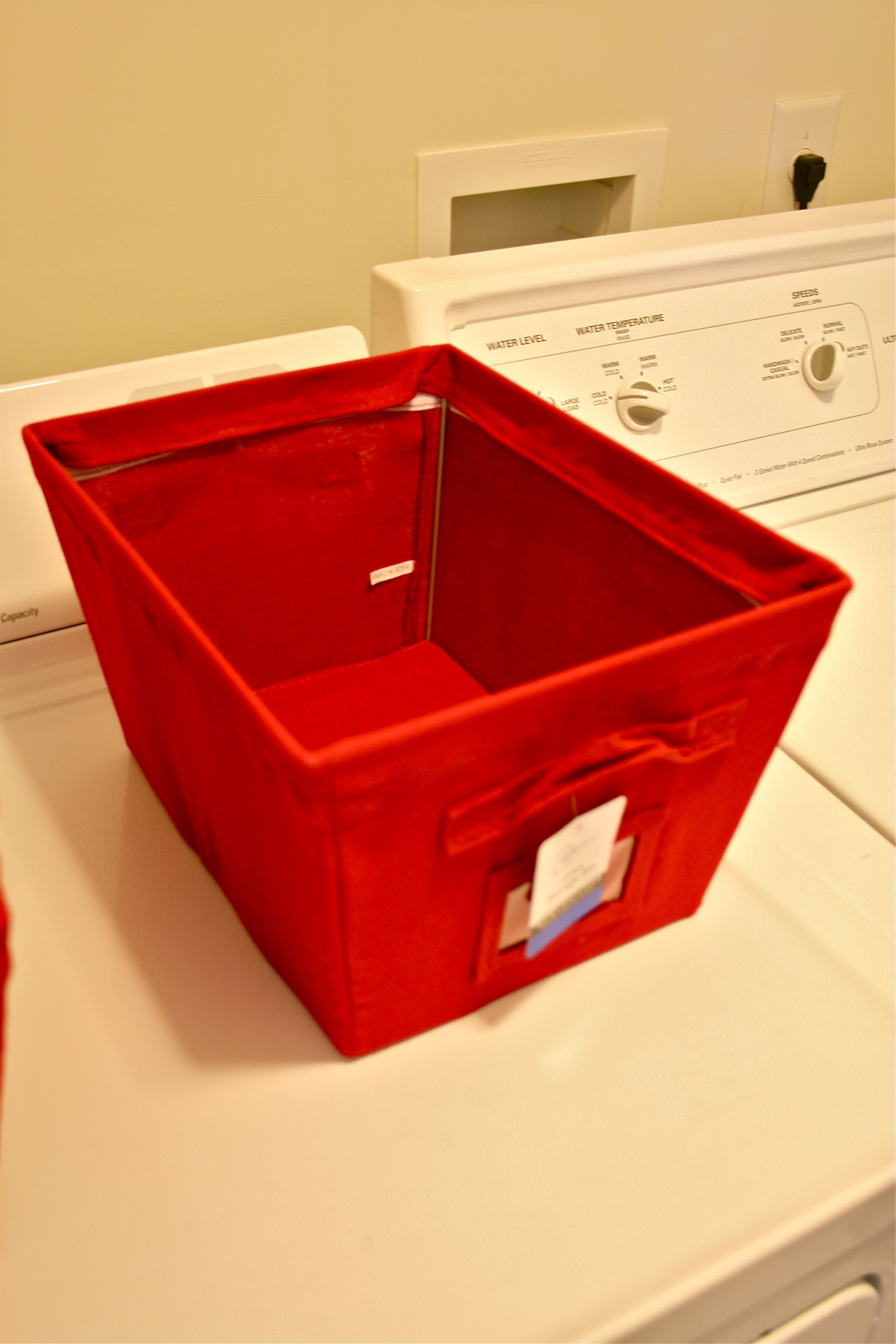So at one of our weekly Sunday trips to Wal Mart, I wandered over to the storage aisle and picked up a large stack of clutter-killing boxes. I really wanted to go with a bright sky blue color in terms of accessories for this room, but all they had were dark red, dark green and dark blue…I figured the brightest color we could do was the red, so I tossed six of the canvas boxes into our cart. I also bought some plastic, hard-shelled boxes that were a tad bigger and could hold more on the high shelves above the washing machine and dryer. They didn’t have red, but I figured black and grey went well enough – Although, now our laundry room is the exact colors of my high school…Not sure if I like that or not.