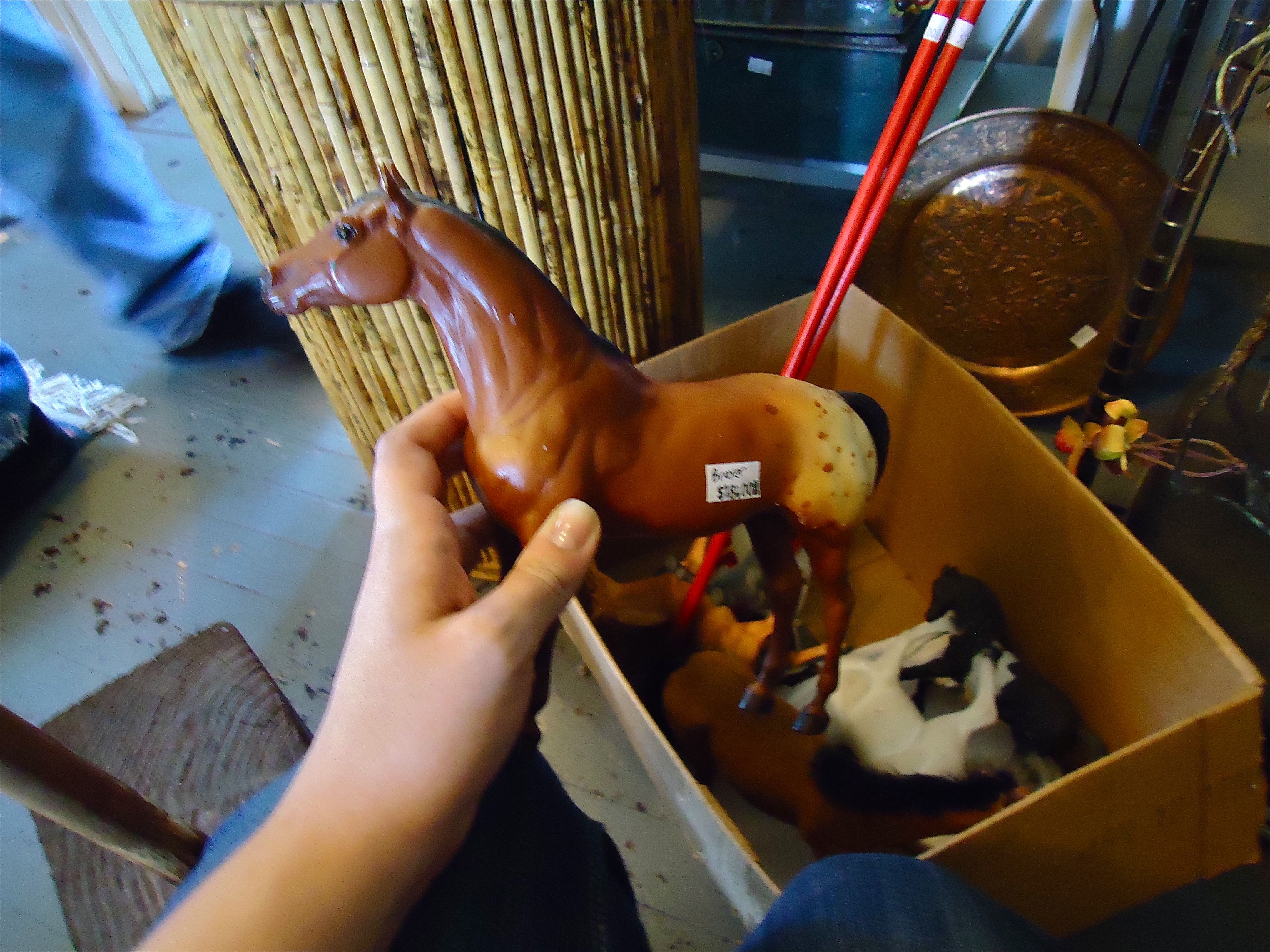 Up on the second floor, we saw a few interesting things. John found a gigantic beer glass and some comics, and I found a box of Breyer horses. They were $18 each though…Apparently my really old banged up toys are still worth a little something!