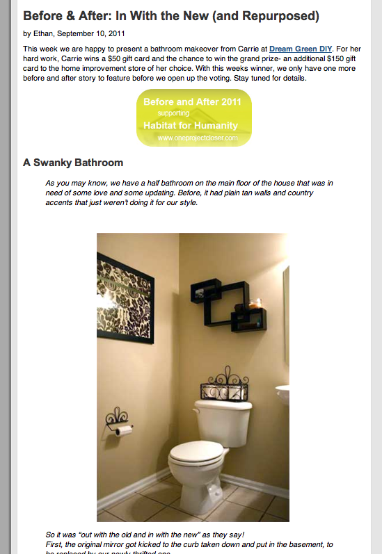 But one more thing before I go…I don’t know if you guys follow me on Twitter (if you don’t, you definitely should! Hint: look for a link on the sidebar to the right), but while at the beach I received the wonderful news that one of our DreamGreenDIY projects has made the cut over at “One Project Closer”!!! I had submitted my makeover to the project months ago, not thinking anything would actually come of it – But it was miraculously chosen and, as you can see below, was published on their AWESOME blog for all to see! So honored to have been given a spot amongst all of the other incredible makeovers featured on the blog…I also won a $50 gift card to Amazon for being chosen! I am planning on using it on another home makeover I’ve got up my sleeve, so stay tuned for that…