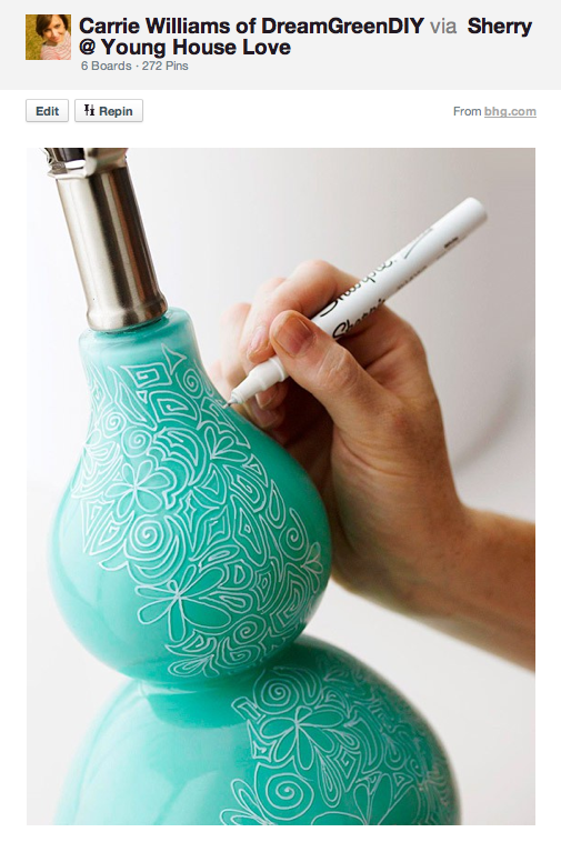 I actually saw this project in a BH&G magazine a while back and have wanted to try it ever since – The idea of using a white marker to add some graphic appeal to a solid colored surface is so fun to me! I think it brings me back to my middle school days of doodling all day long in the margins of tests or notes. Now I only need to find this special white sharpie they used…