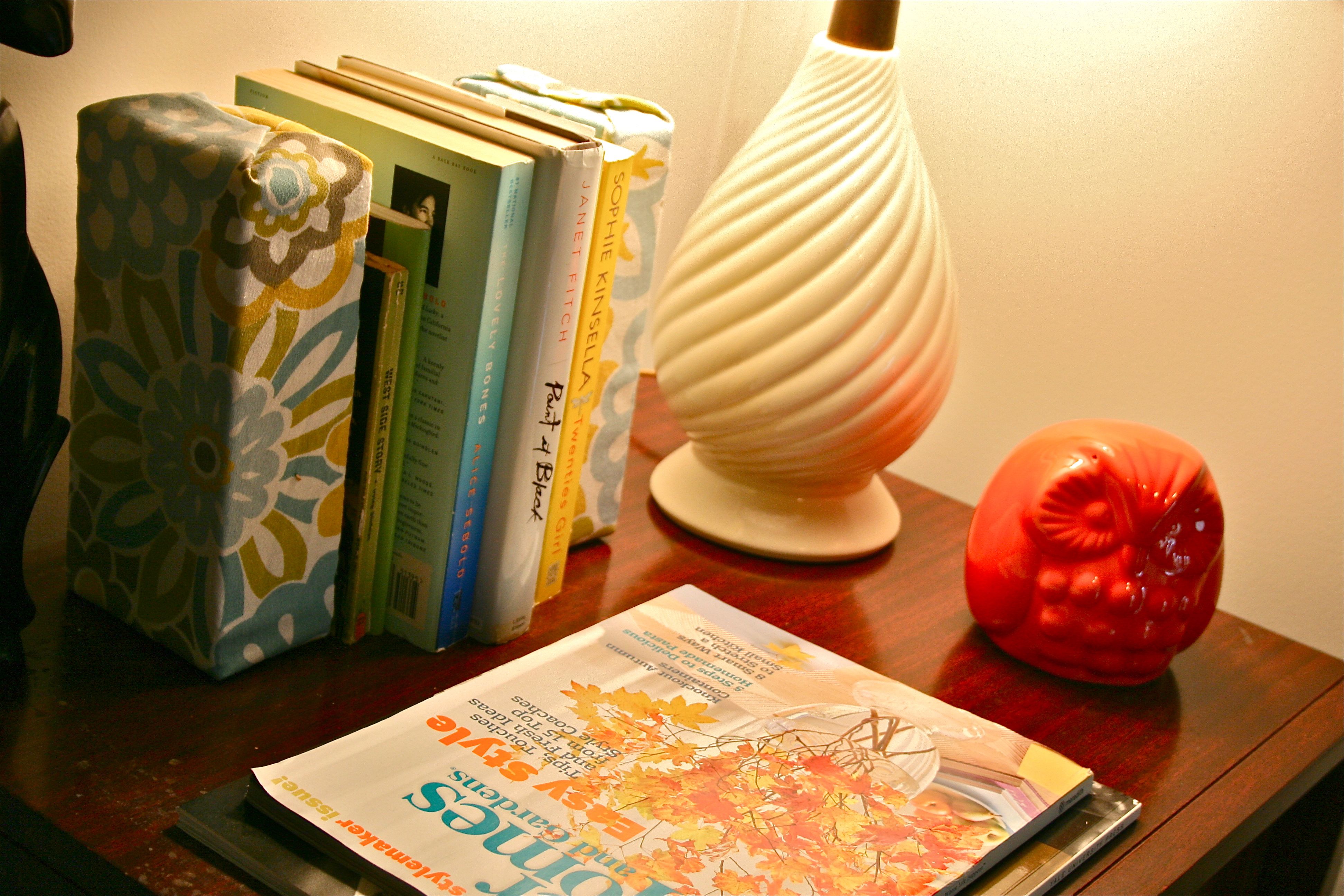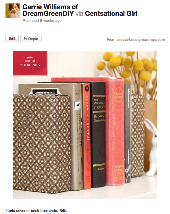 After a bit of random lazy-around-the-house activities (mentioned previously), I decided to do something productive and got to work on a Pinterest project I had been wanting to try. The idea was to wrap a pair of bricks in pretty fabric to create bookends. Genius!