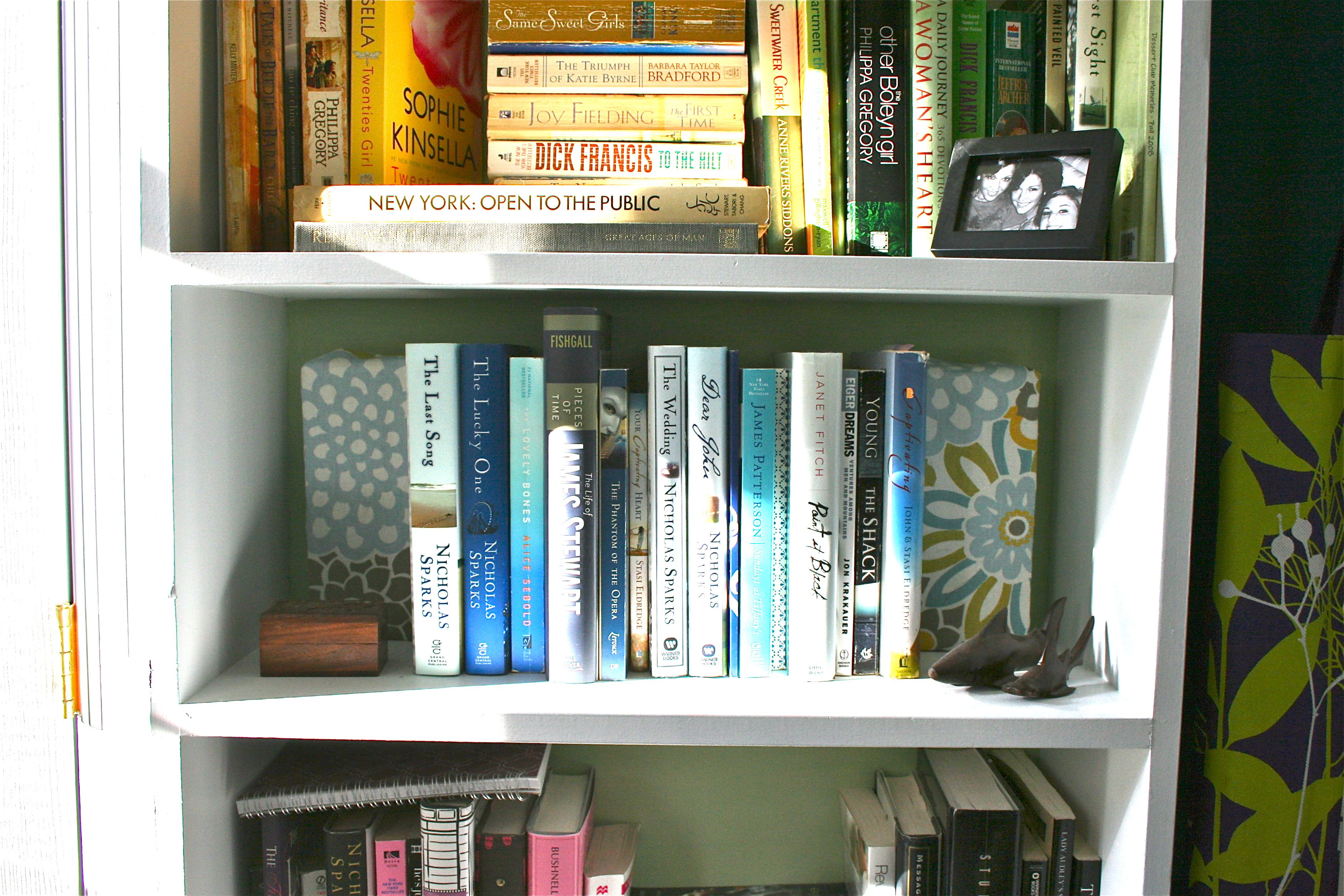 I love how, when out in the open, the fabric pattern wraps around the brick. And of course I picked books off the shelf in the same color scheme as the fabric (blue, white, yellow and green) – Gotta be consistent!!!