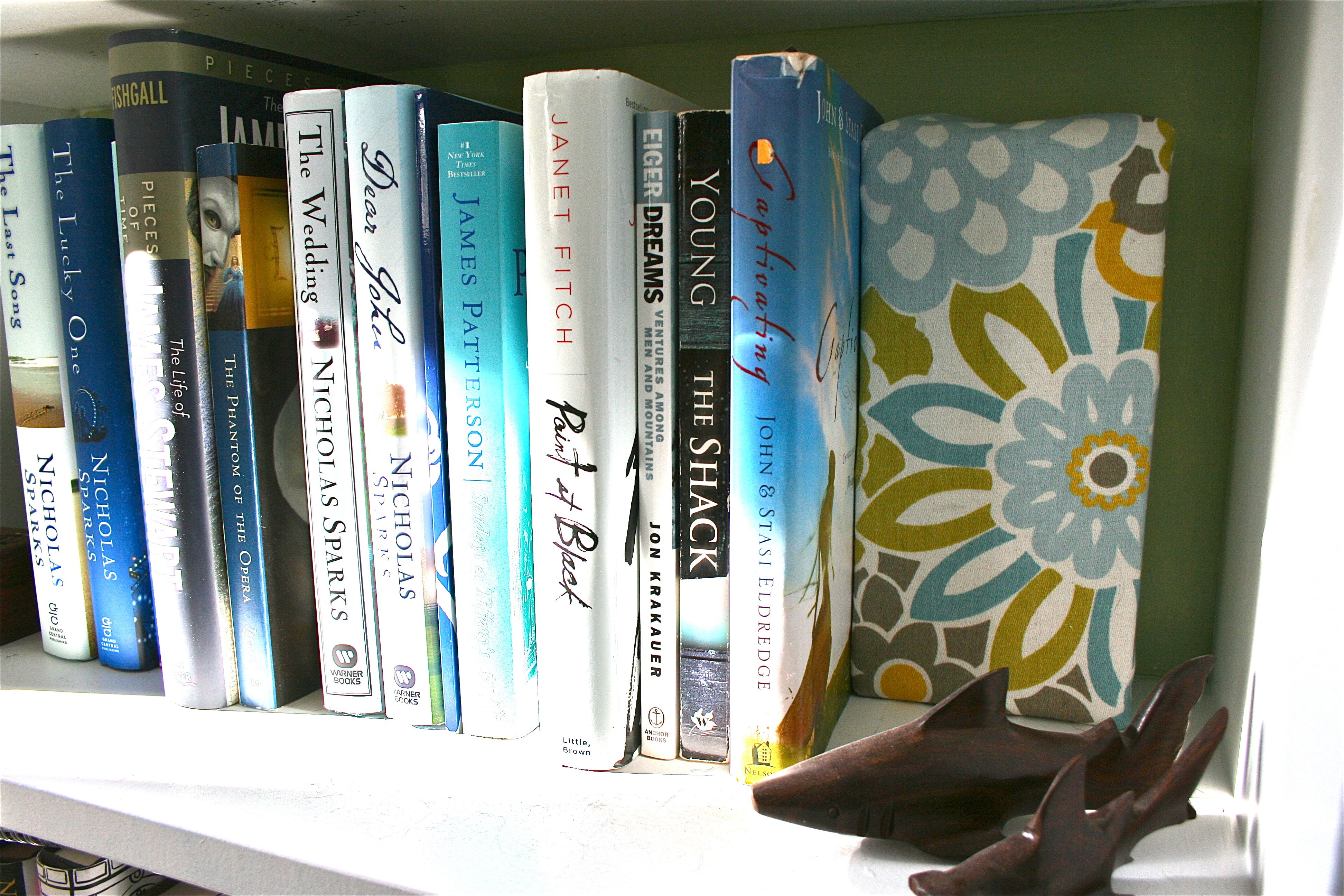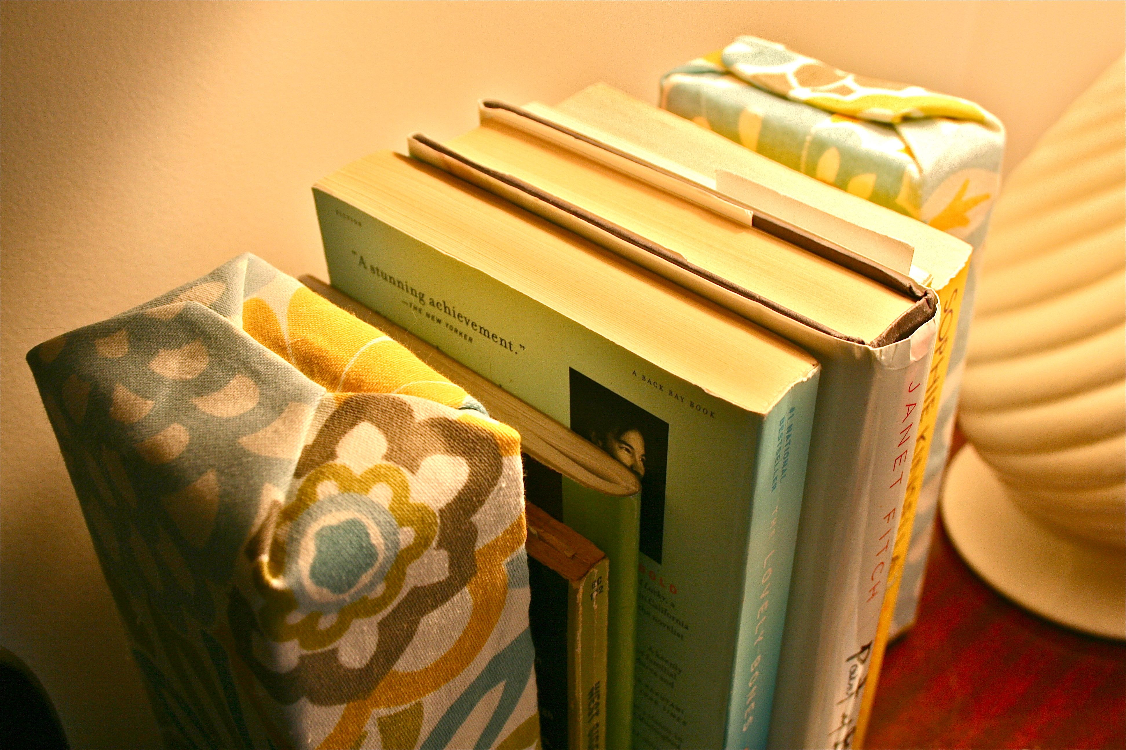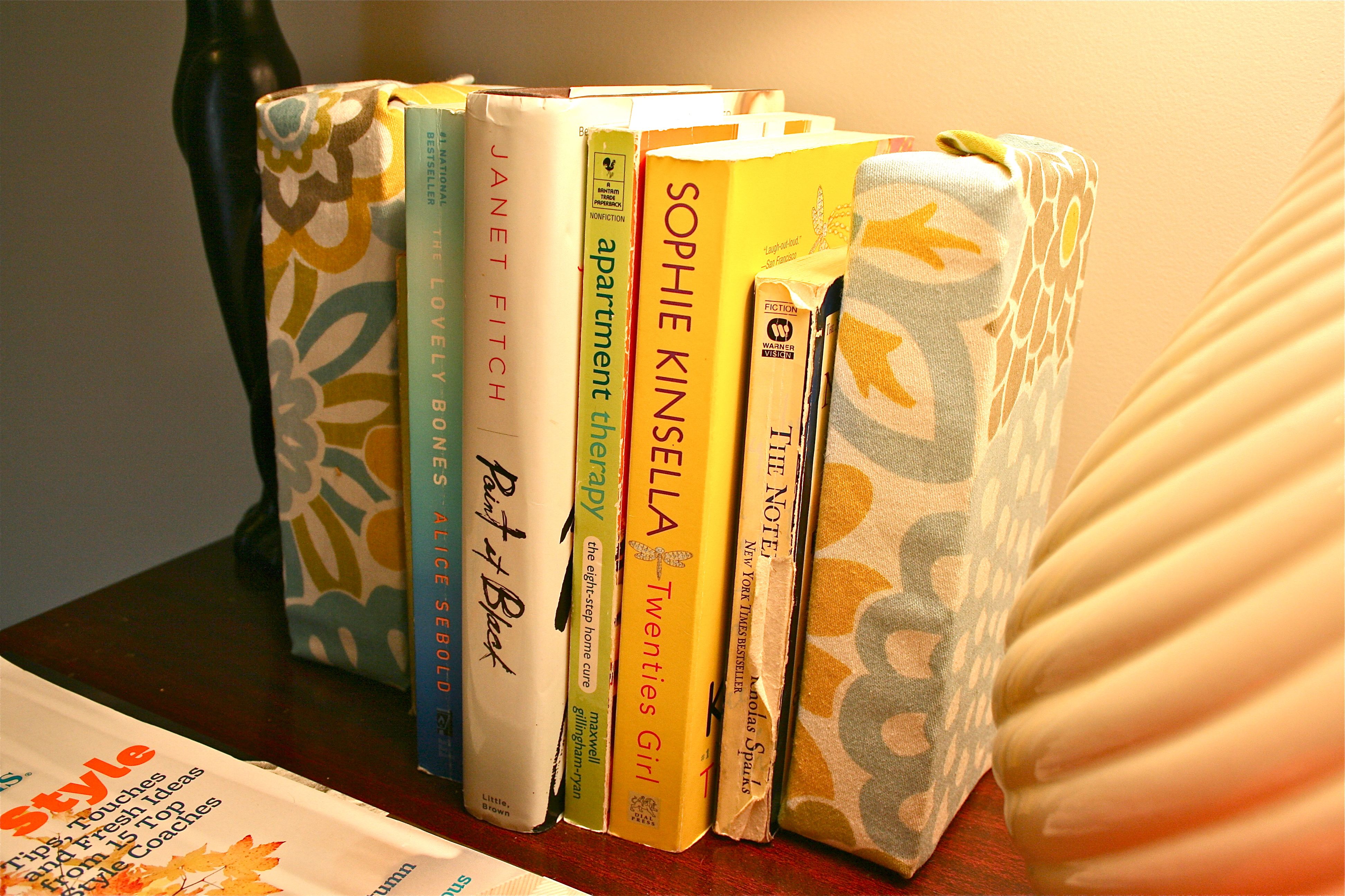 One thing I have to mention is that the hot glue and extra folds of fabric on the ends of the brick make them a bit wobbly…But once they sandwich some books and have something to lean on, physics (or something…) takes over and all is in tip top shape and balance.