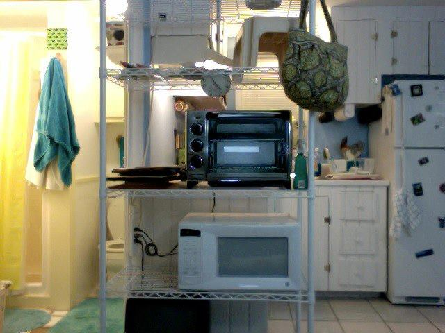“I just moved into my first place, and it was a total fix up. The whole thing, top to bottom, was painted this horrible flesh color—not one single other color. There was a hole in the roof, holes in the wall, windows missing, etc. but it looks pretty good now! I am all moved in, and just having fun with the nesting part and trying to look less like a dorm room and starting to edge towards more adult decorating (still love my Beatles poster though!). Anyway, it is basically two rooms stacked on top of each other (less than 400 sq. ft.), so for any kitchen space I had to get an industrial-looking shelving unit for my microwave, blender, table top oven, TV, etc. It does not look like a nice homey thing, and I was wondering if you had ANY ideas on how to make it look nicer but still be functional. I was considering getting totes for the top two empty shelves, but I’m not sure…Any ideas would be great! —Josefine”