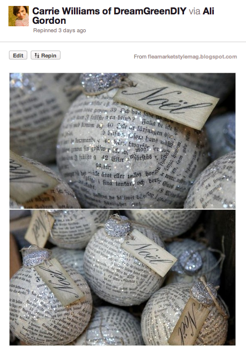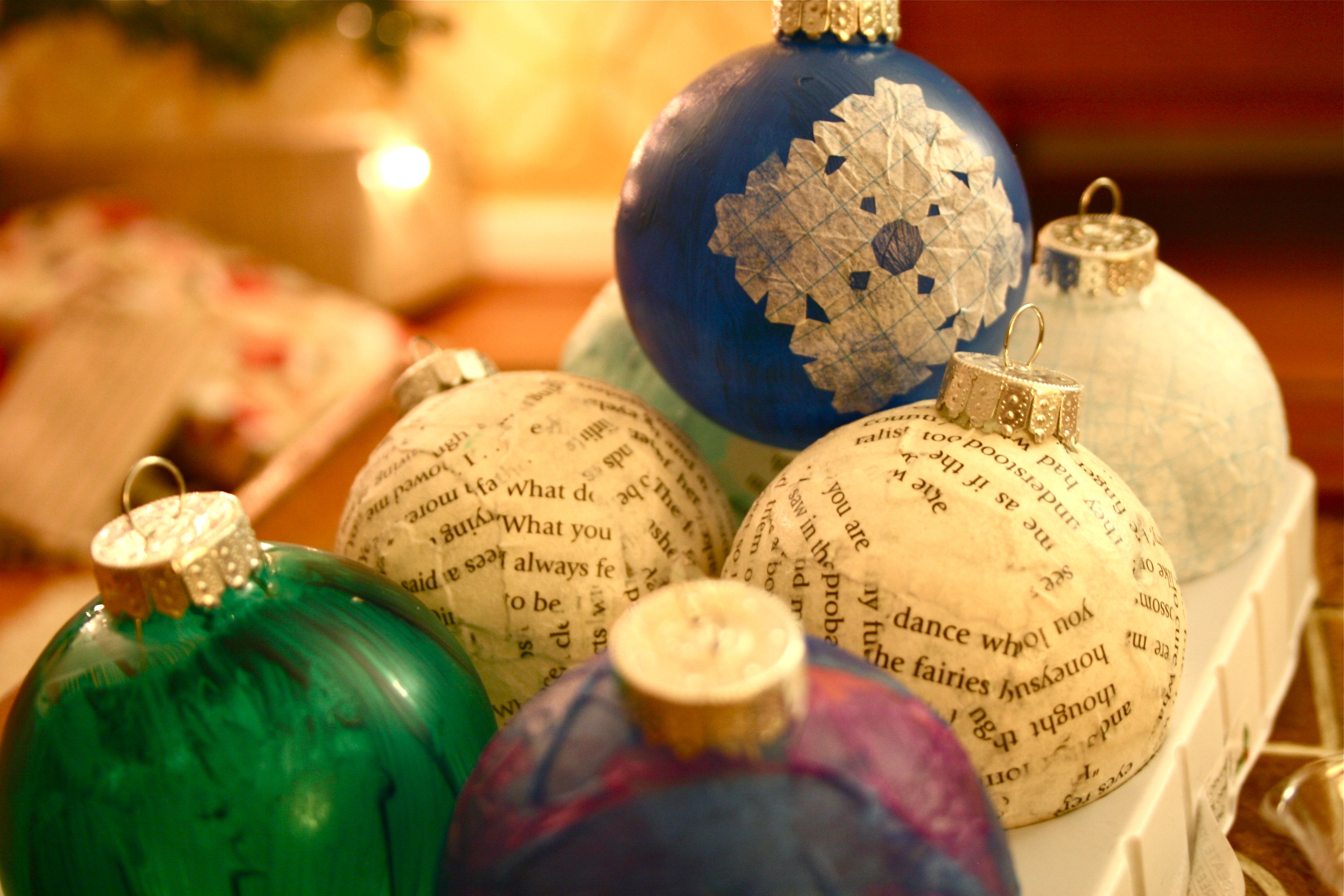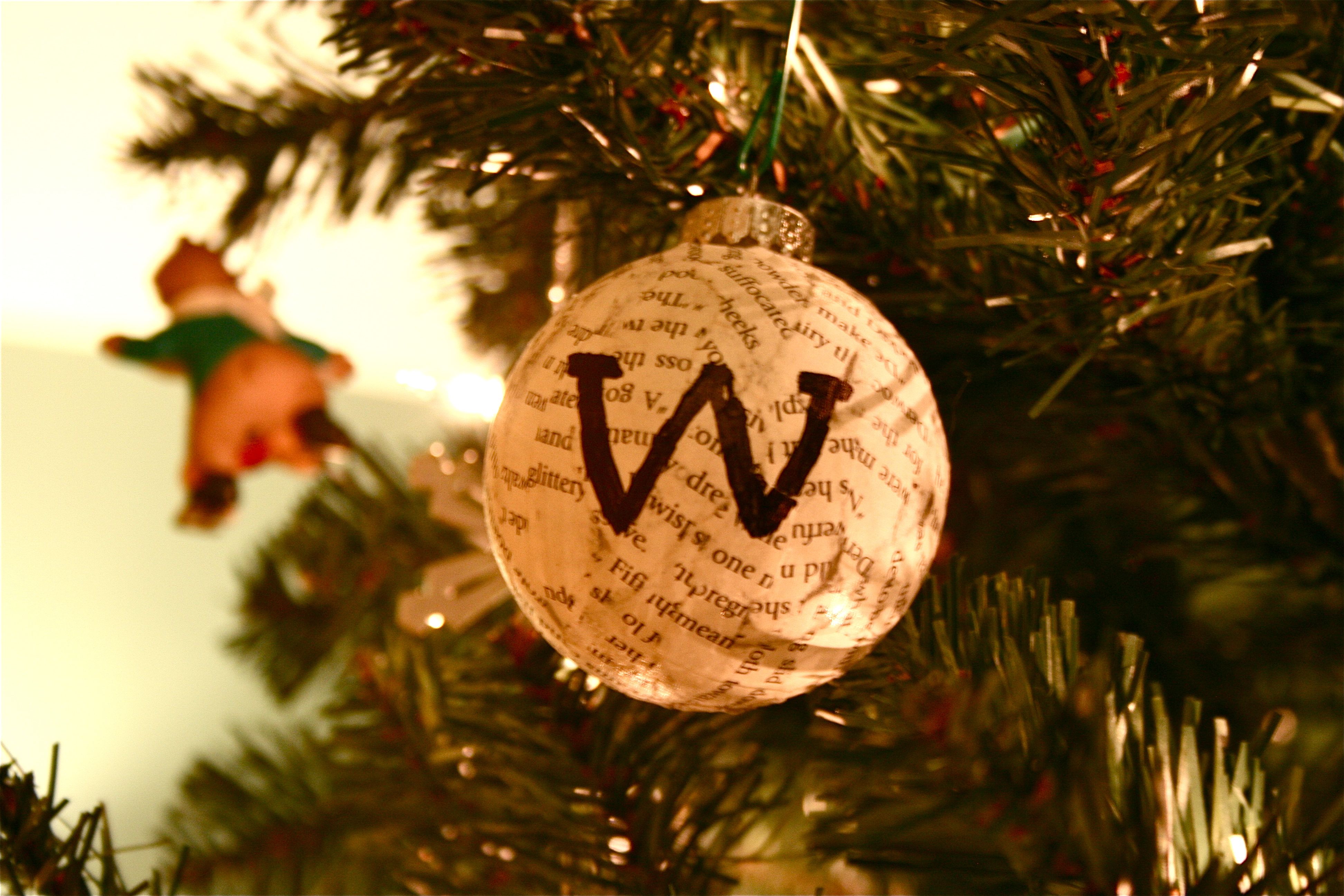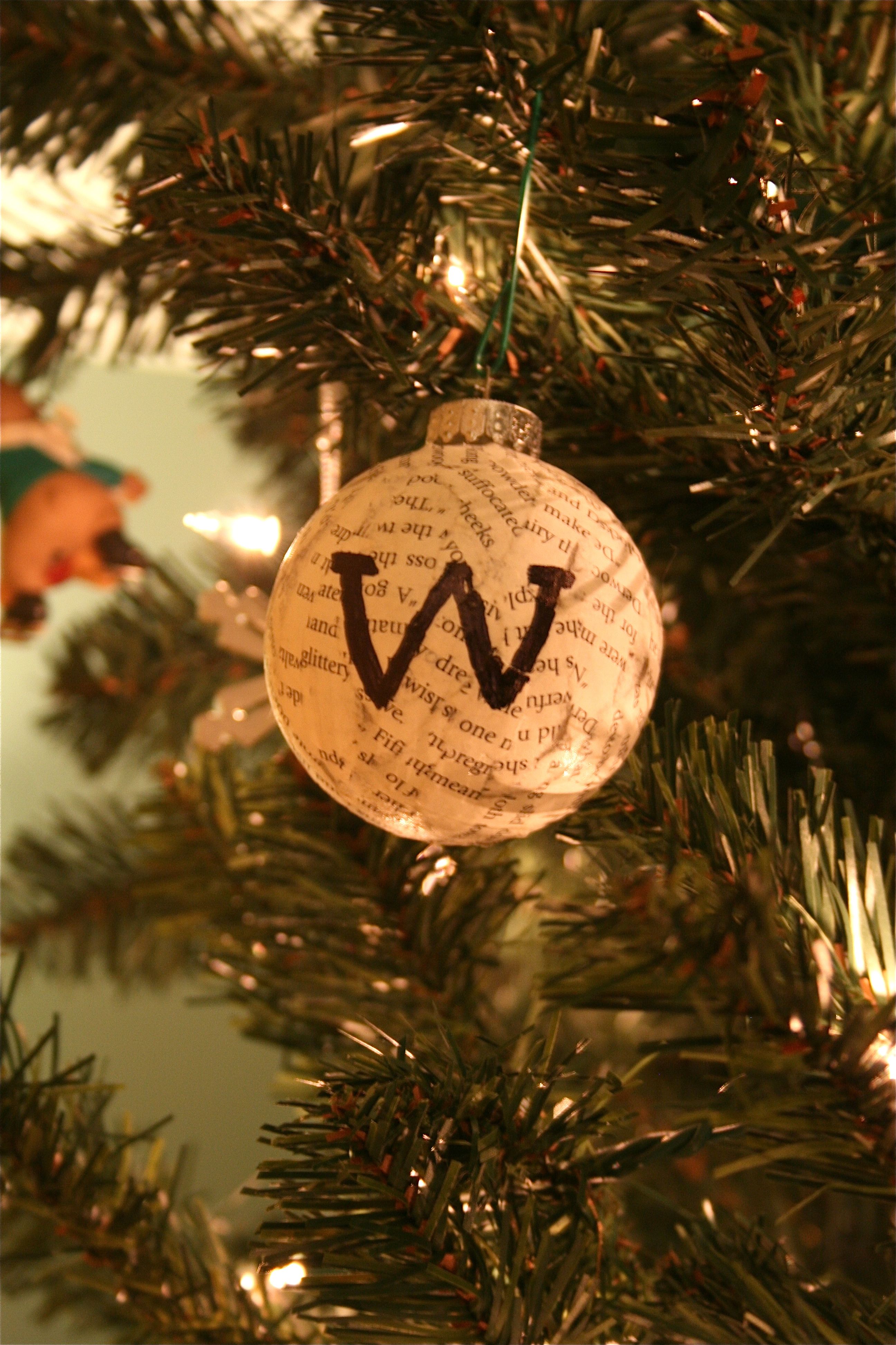 For my last ornament, I combined the other two Pinspiration images of the monogramed one and the one with decoupaged pages from a book. I just ripped a few sheets of paper from an old book I knew I wasn’t going to reread and then layered on small pieces with the glue solution. Then, I took a black Sharpie marker and penned on a “W” for our family name (John’s last name is Waller and mine is still Williams until we get married in April, so I don’t have to change my initial!).
