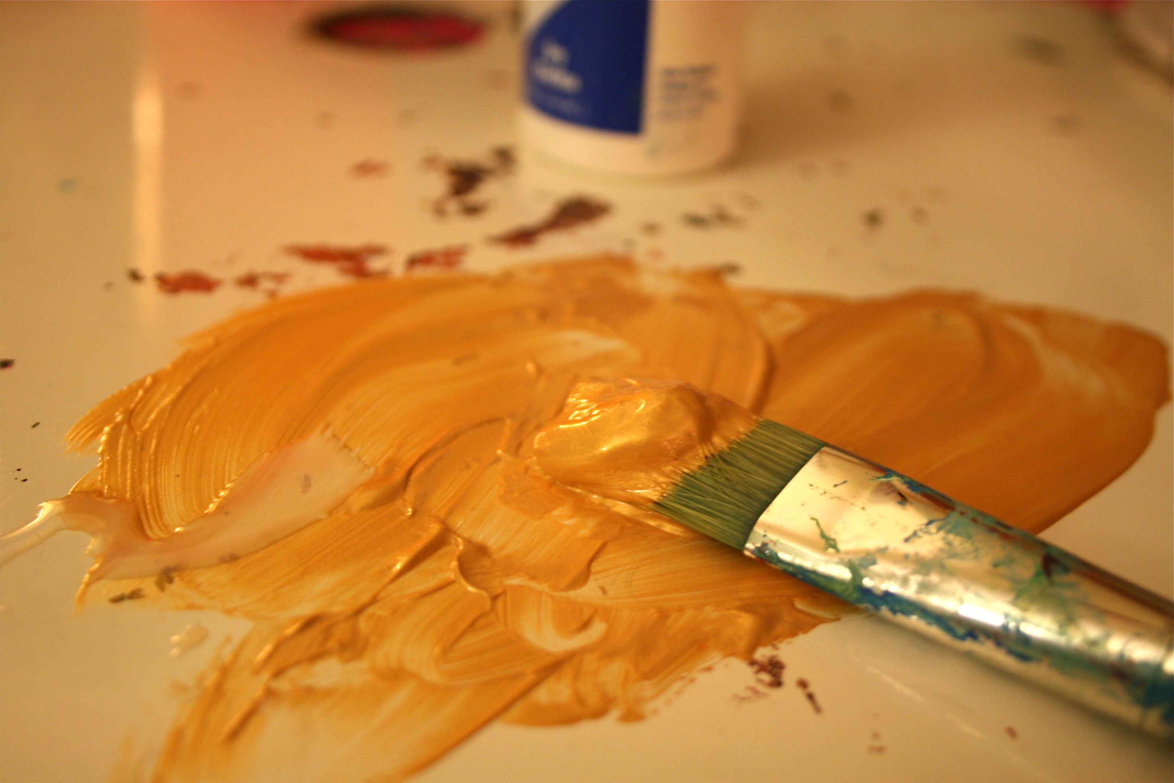 First, I spread out an old sheet to protect the coffee table in the living room, and then set out twelve clear craft-store-bought ornaments and some paint and paper supplies – Once all of the ladies arrived for the party, I just explained some of the inspiration images I had dancing around in my head and they took it from there!