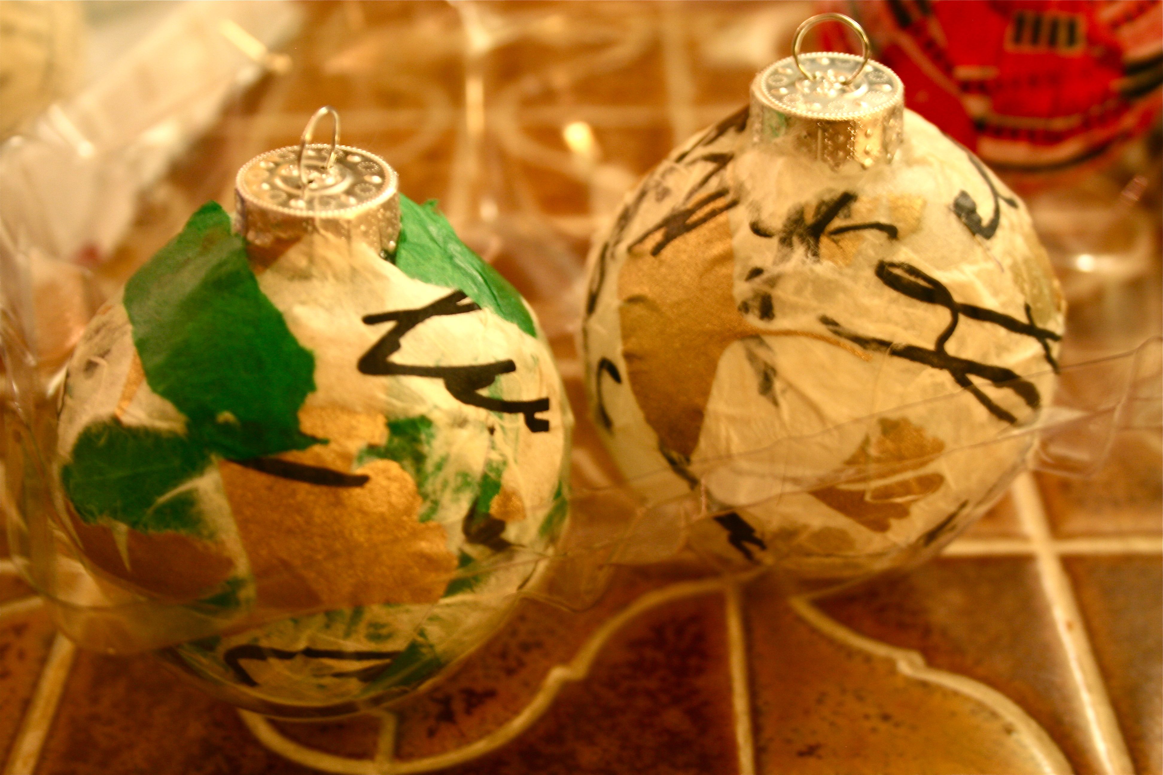 That one actually ended up being the only one we DIDN’T decoupage! For those of you not familiar with decoupage, I just diluted a few squeezes of white craft glue with a teaspoon or so of water to make it runny. After that, I coated the ornament with the glue solution before layering on torn paper and more of the watered-down glue mixture. This technique turned out to be a big hit and everyone made a few to take home.