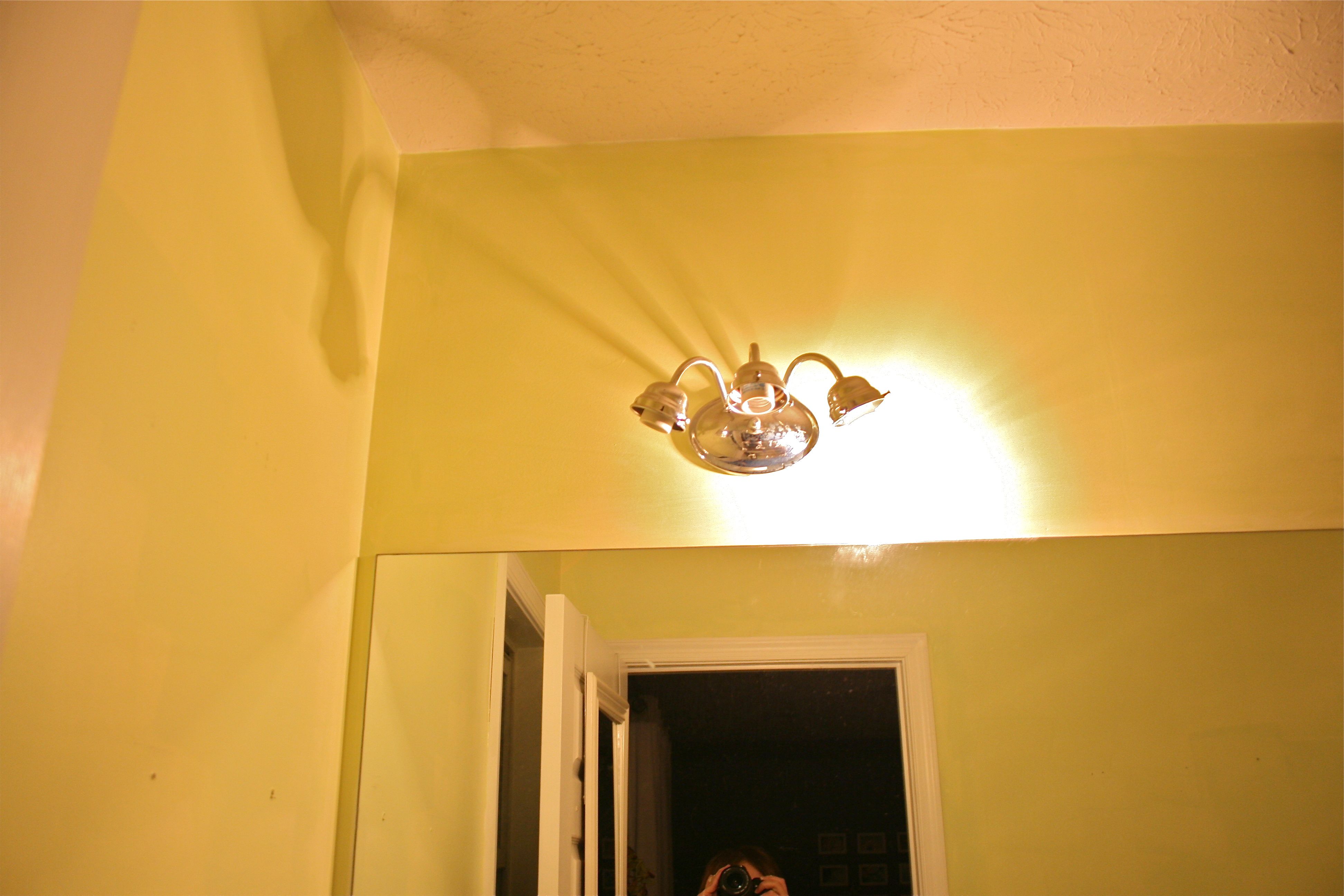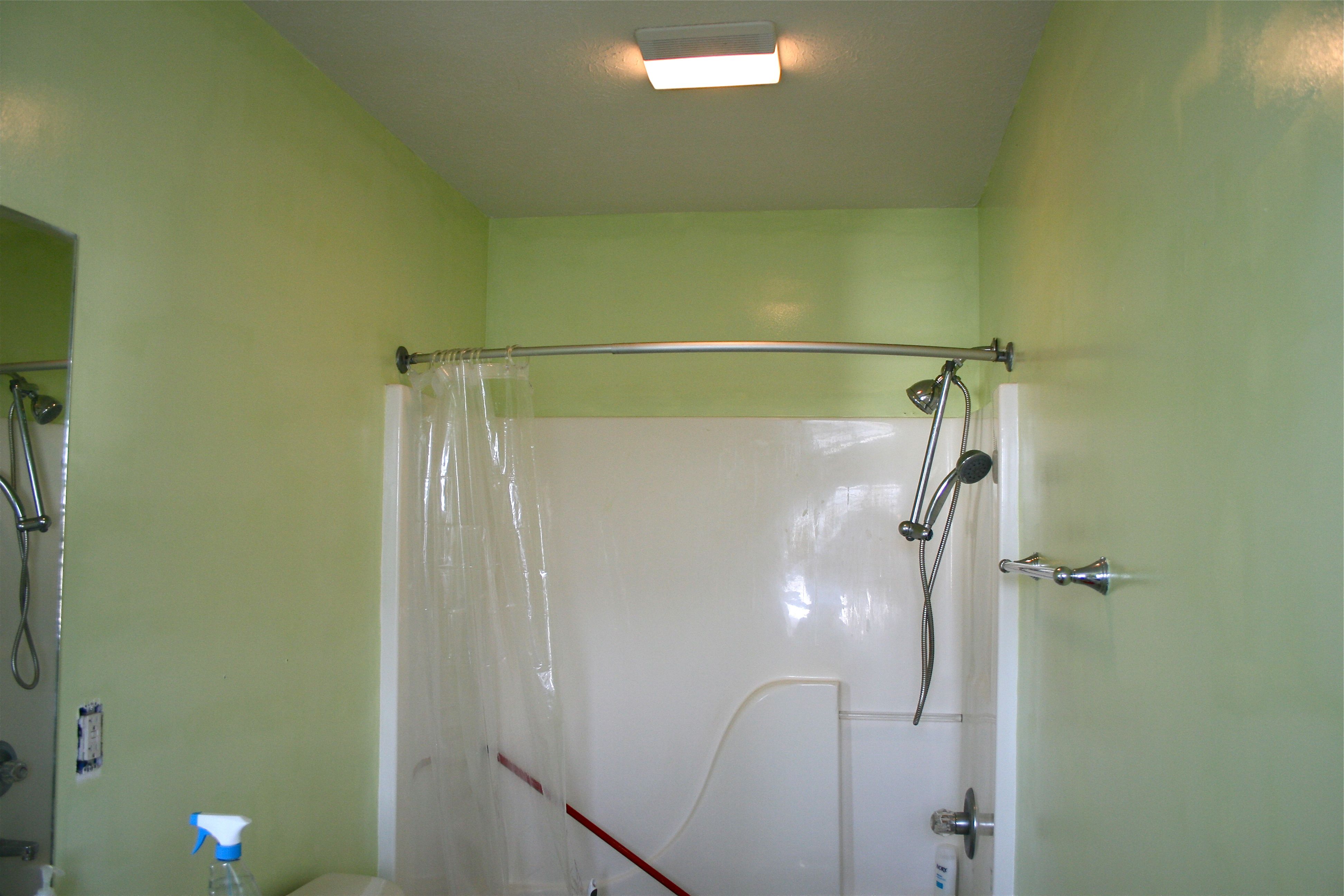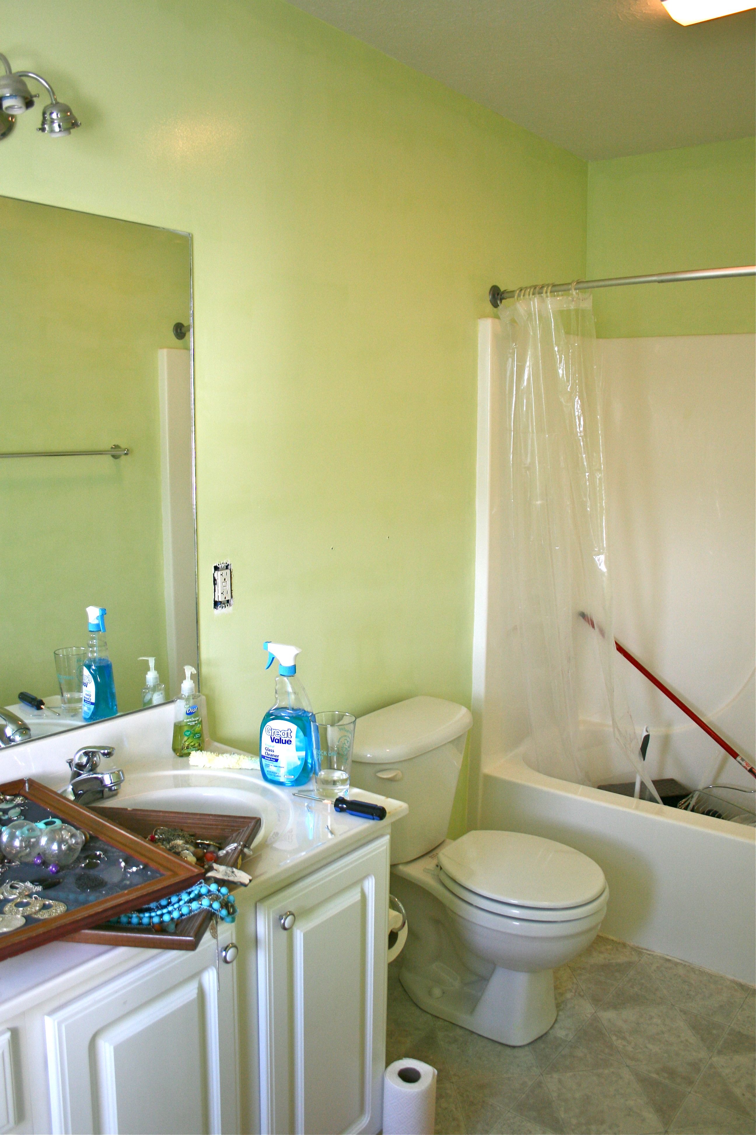 But back to the walls…I woke up early yesterday morning to roll on the second and final coat and then went out shopping with John for a new shower curtain and some green hand towels to coordinate. By mid afternoon upon further inspection, I quickly realized that what I thought was a “final” coat was definitely NOT. You may be able to see the splotches and uneven color below…