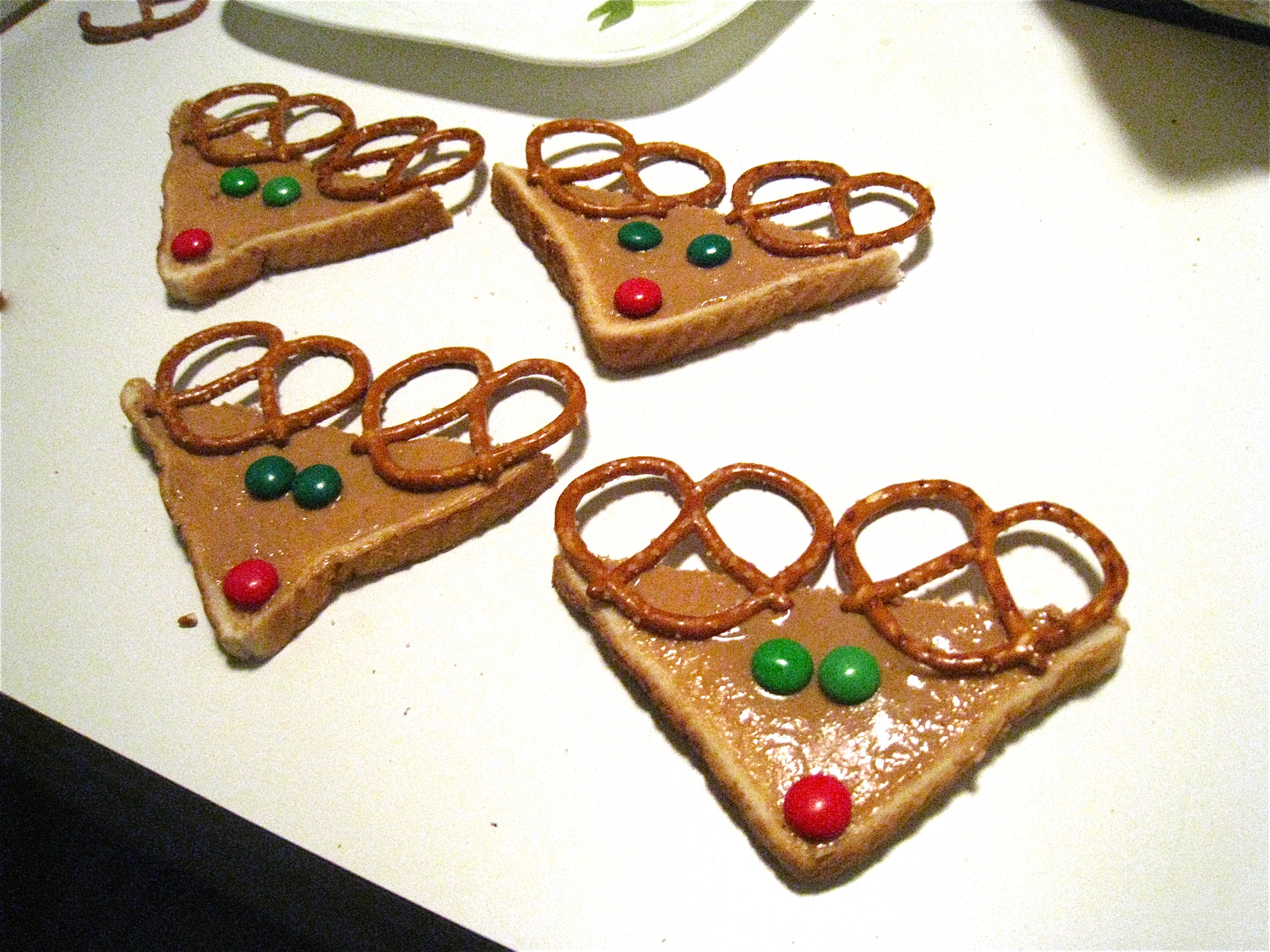 Cover the bread with peanut butter and then slice into triangles. Put two mini pretzels at the top of the “long” side to make the antlers. Then make two eyes and a nose with M&M’s. Admire the extreme cuteness and then enjoy!