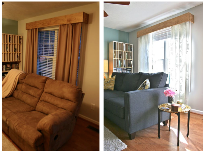Oh, and want to see what they looked like before? I am going to take you WAYYYYY back to when we still had John’s bachelor-days couch upstairs…These photos were taken in the evening so there’s not nearly as much light to contend with, but take my word that these drab, tabbed, tan curtains weren’t doing anything for the space whether there was light behind them or not.