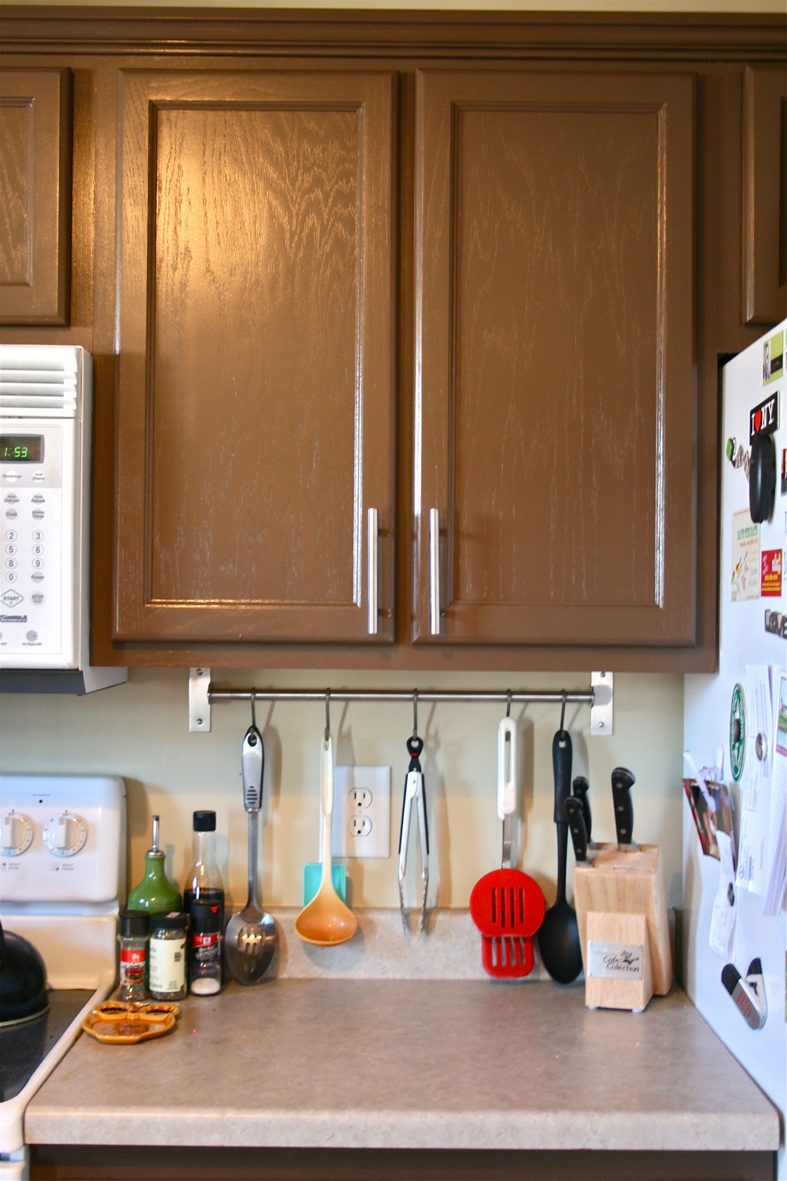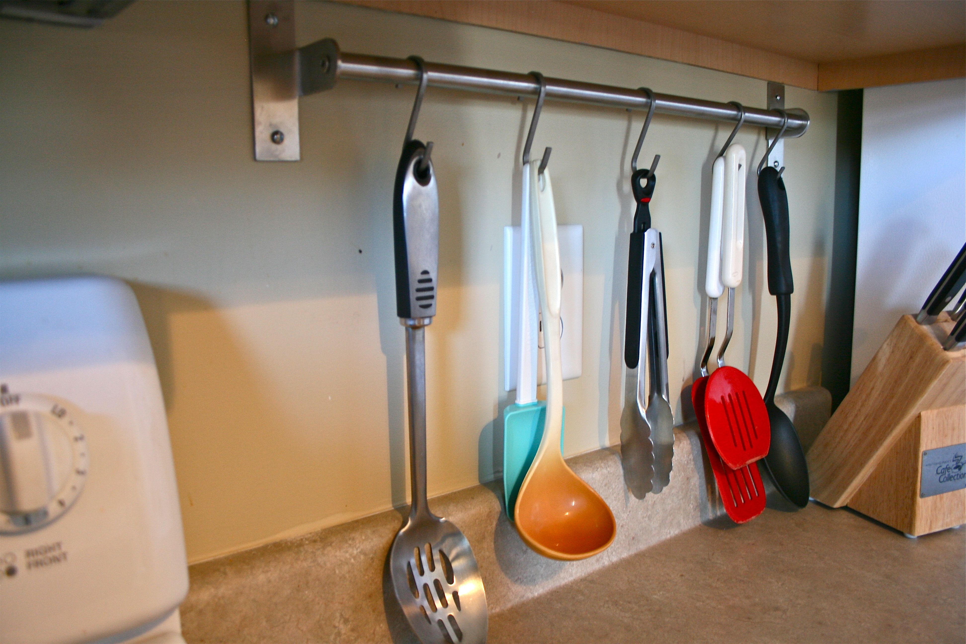 4. Metal rod and hooks for kitchen utensils: After seeing just how awesome these systems work in my friend, Bonnie’s house (as seen in this house tour of yore) I couldn’t wait to snag some for our house. We don’t really have much wall space in our kitchen, but I figured we could fit one of the rods under the cabinet by the stove. It worked out really well and I was excited to clear up just a little more cabinet space. As you’ll soon see, it looks like we should have picked up another 5-pack of the hooks, but it’s on my list of things to grab in NC before our honeymoon.