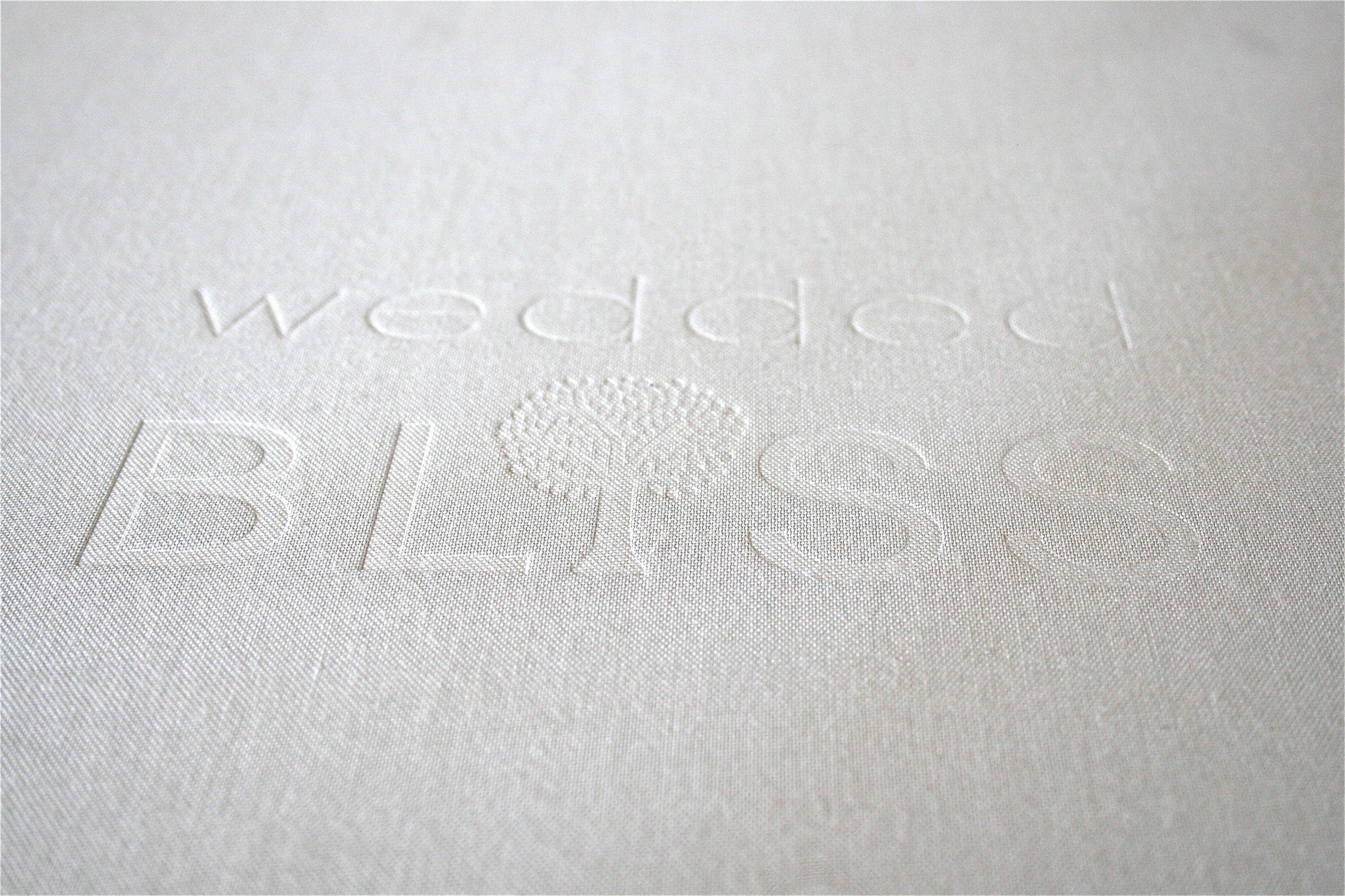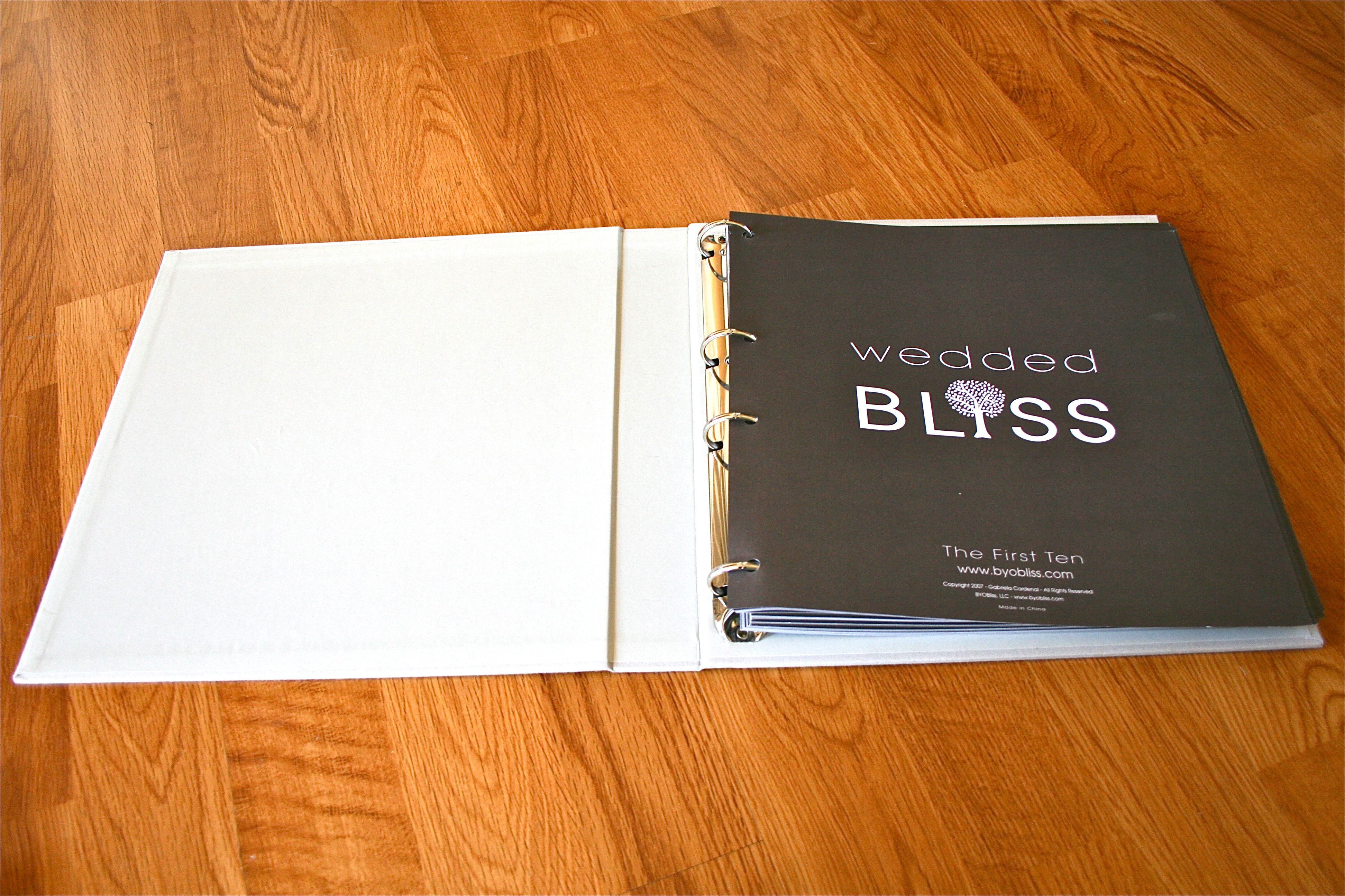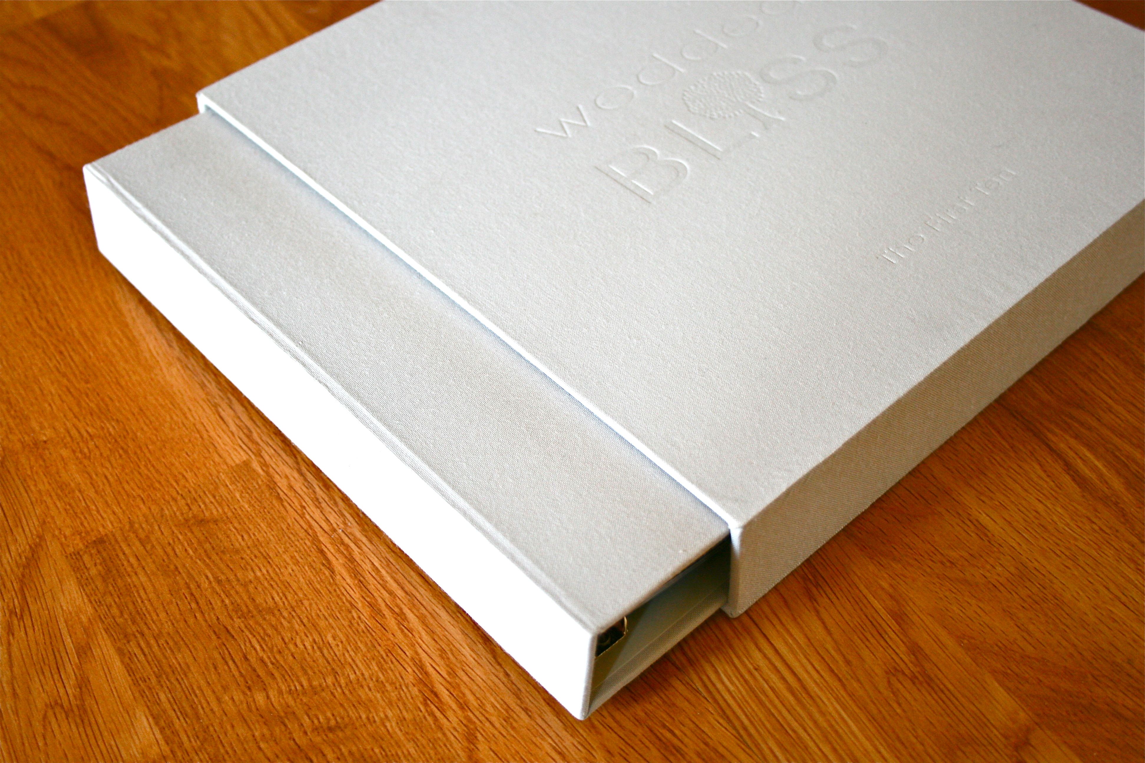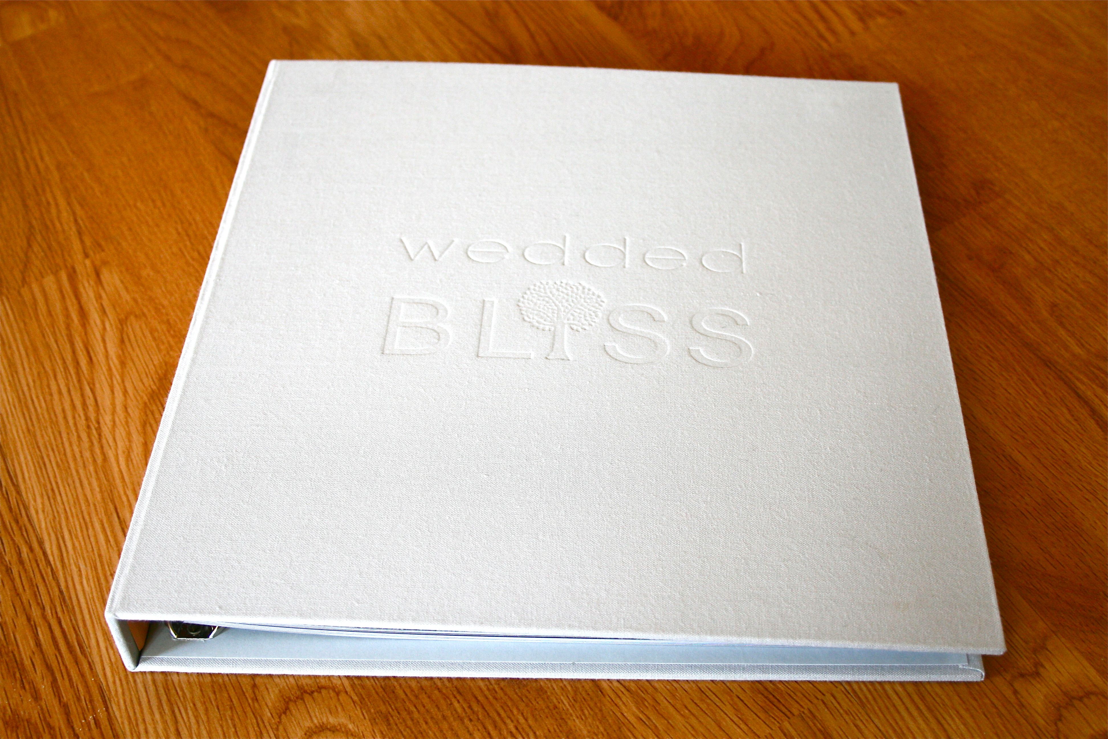 This beautiful canvas-wrapped box stores a matching canvas-wrapped binder with the same letter-pressed writing: “Wedded Bliss” and “The First Ten.”