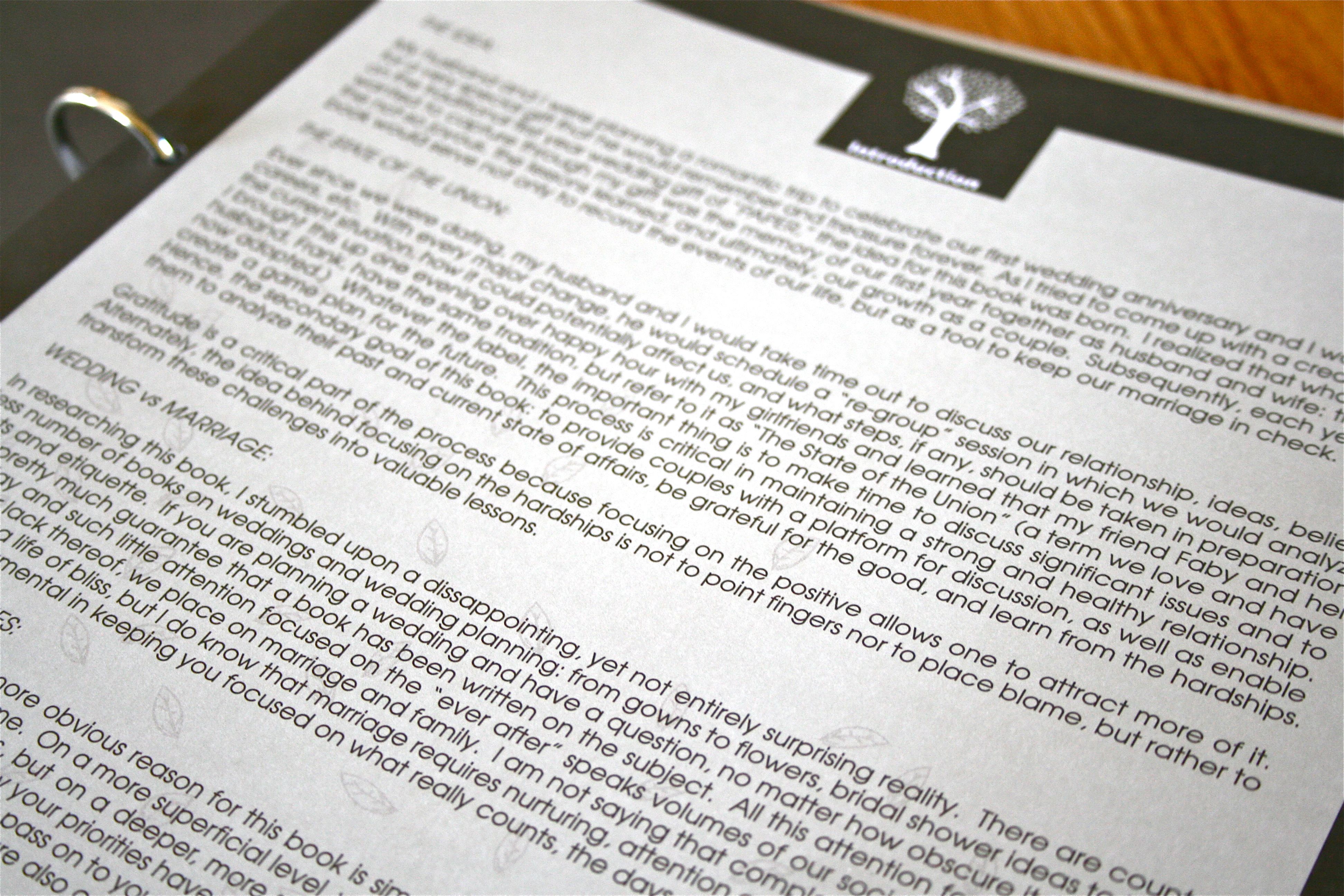 When I slipped the binder out and flipped it open to the first page, I was met with a lengthy, but well-written and sweet introduction from the creator of the book. I read the entire thing and thought it was a great start to perusing the rest of the book. The author talks about how there are ample amounts of wedding planning books out there for brides to utilize, but not quite as many resources for the marriage itself. Her hope through creating the Wedded Bliss memory book was to get couples talking and communicating with one another, and to have a designated keepsake spot to document the highs and lows of a marriage. After skimming the lines of the intro, I was pumped to see the rest.
