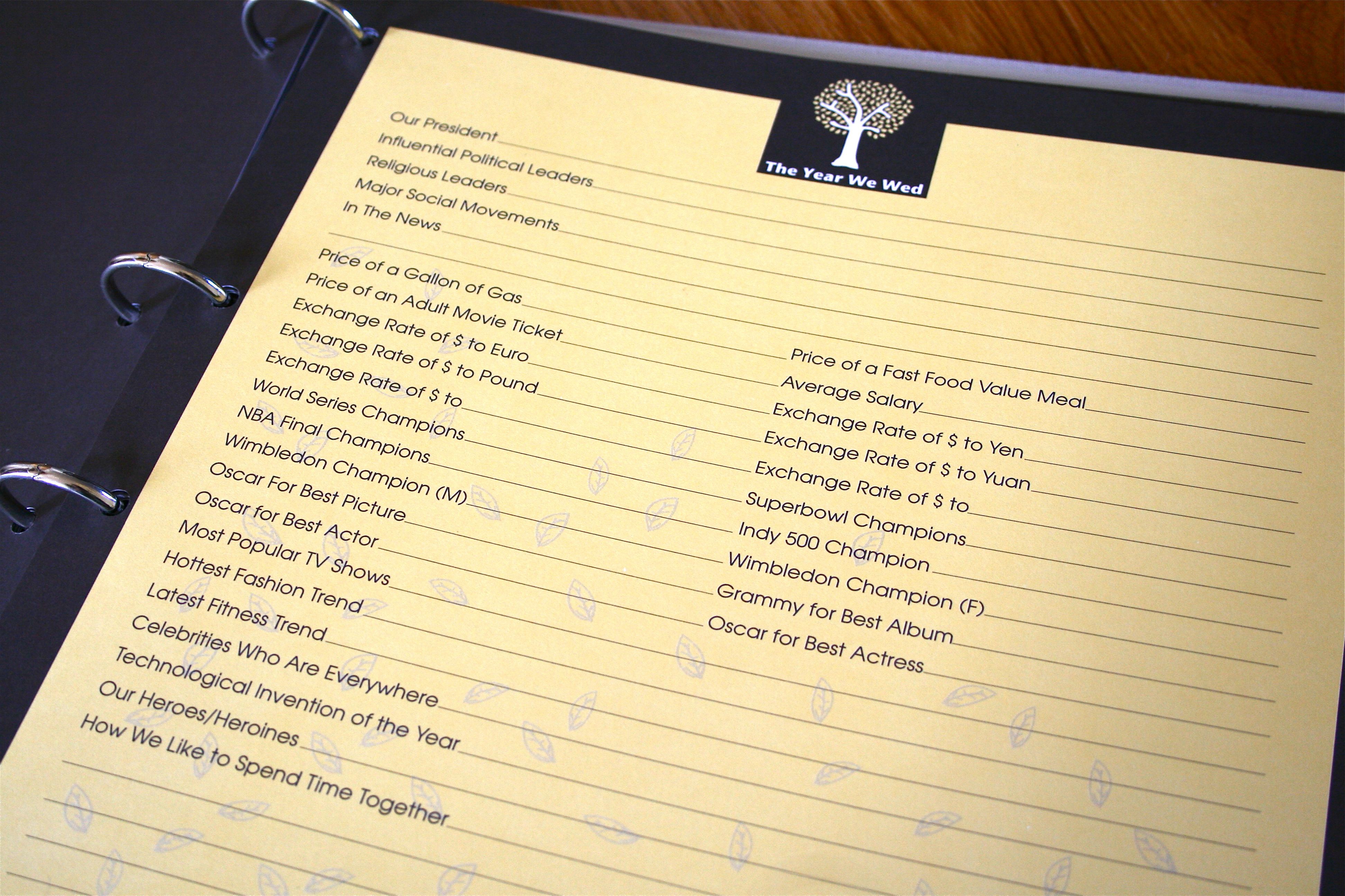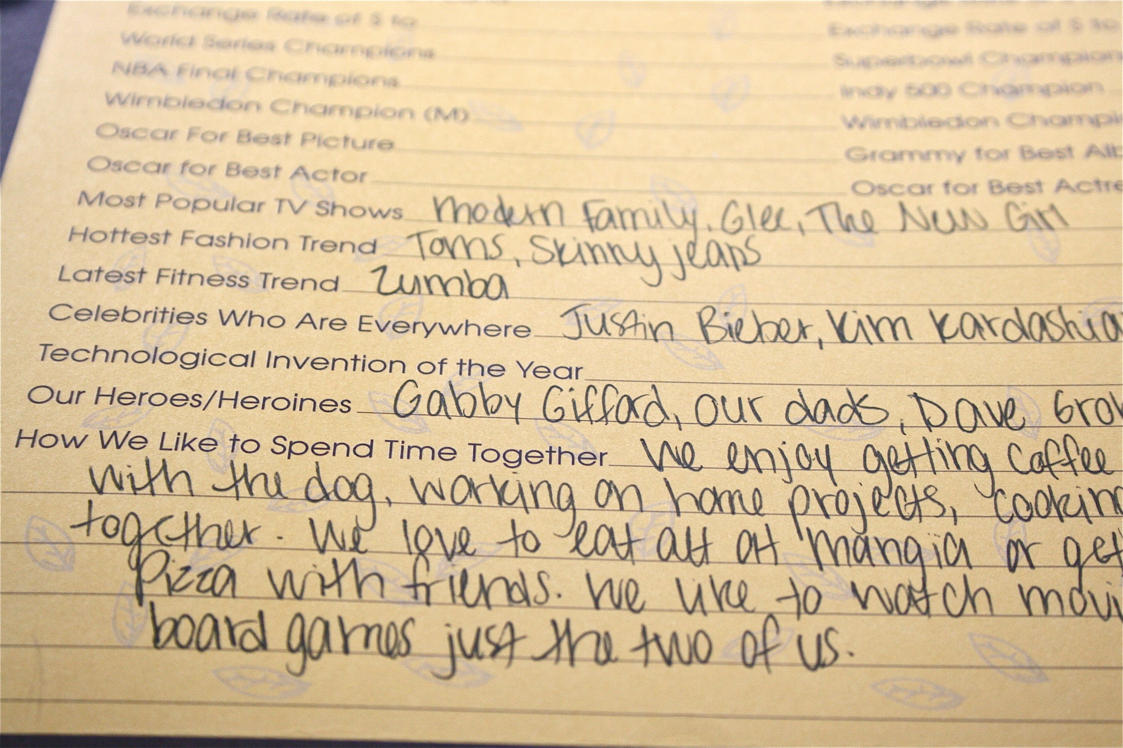 The first page is kind of fun (although it definitely reminds me of my senior book from high school) – It’s one of those questionnaires where you record things like the current president, the price of gas, who won the Oscar for best actress, etc. It’s a little silly, but I’m sure that it will be fun to look back on in several years.