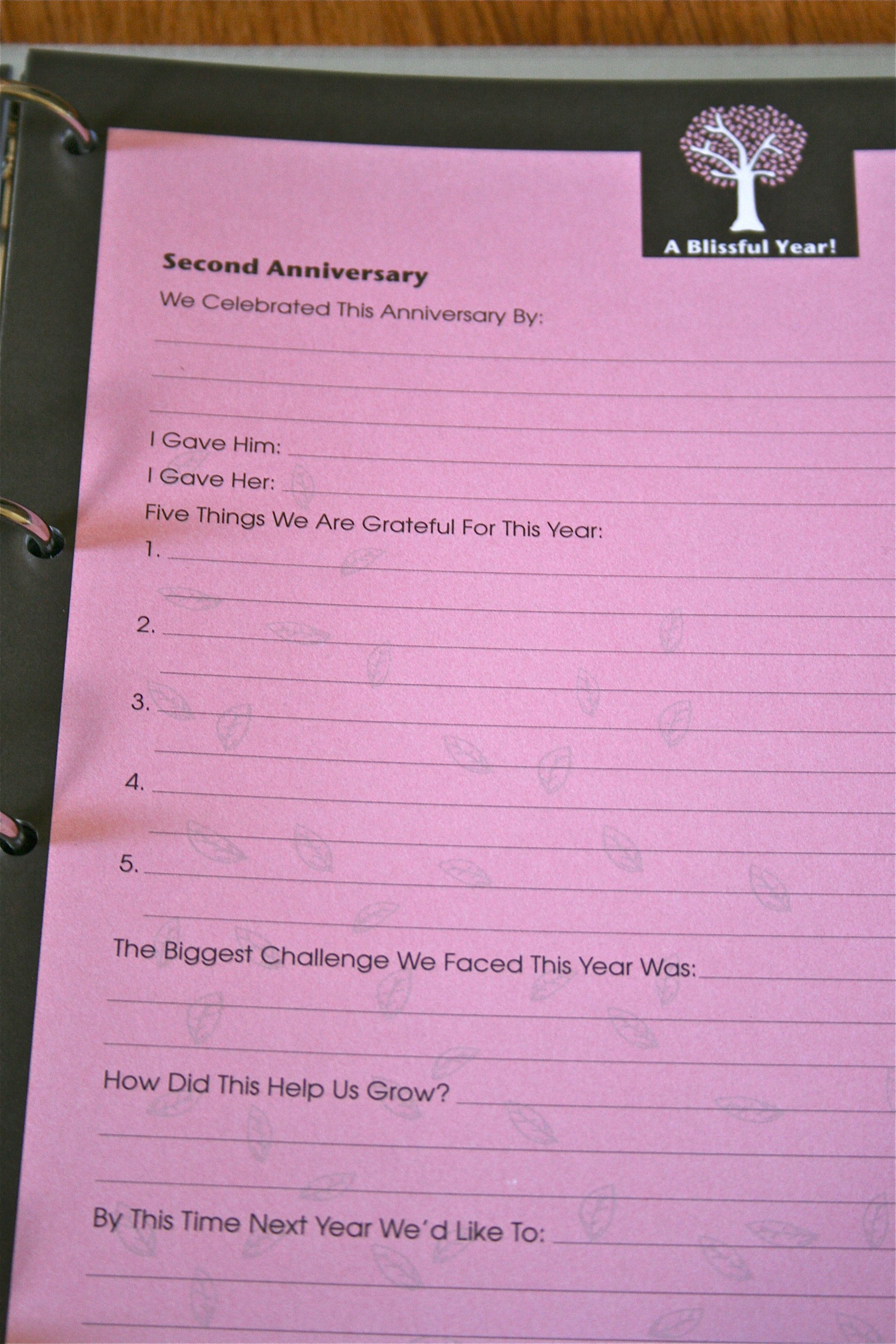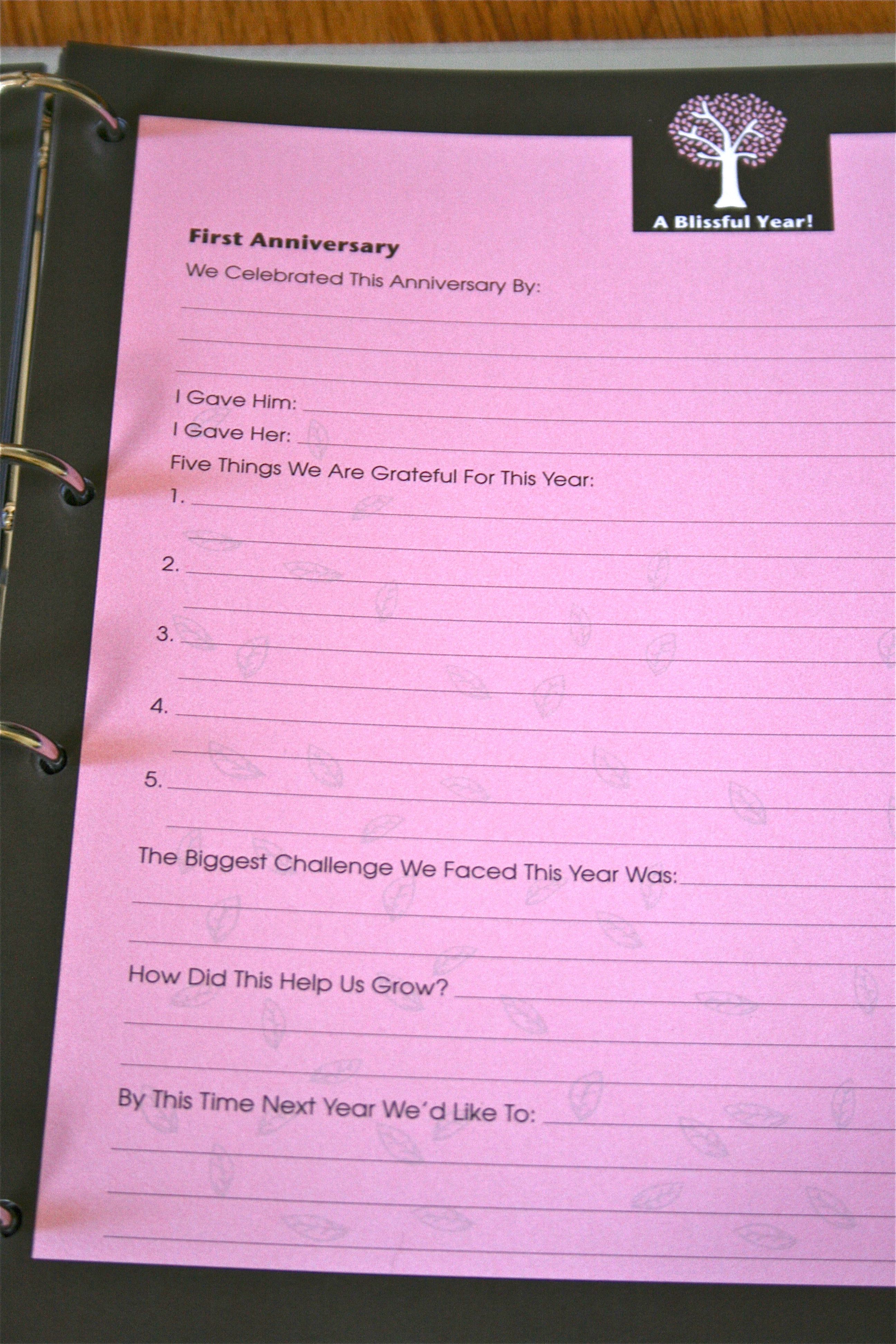 Then there are ten pages dedicated to notating the joys and challenges of each year up to our tenth anniversary. I can see us making a tradition of this each year – A glass of wine or a mug of coffee, a blanket, binder and pen on the couch in the living room. There aren’t a million questions, so it’s not too overwhelming to keep up with and I think it will be fun to lead us in a conversation to look back on years gone by.