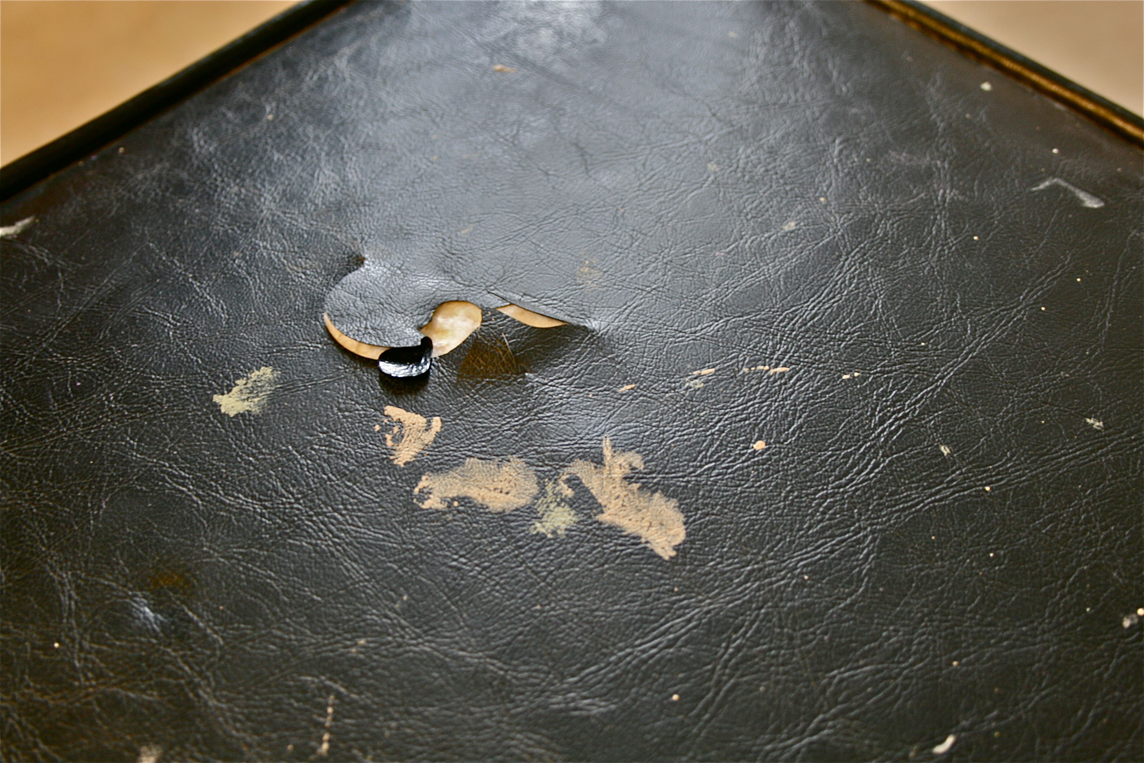 We’ve had this mid century ottoman for as long as I can remember – As you can see it’s had a pretty hard life. Complete with the tell-tale markings of a toss around project helper with torn leather and paint splatters across the top and legs.