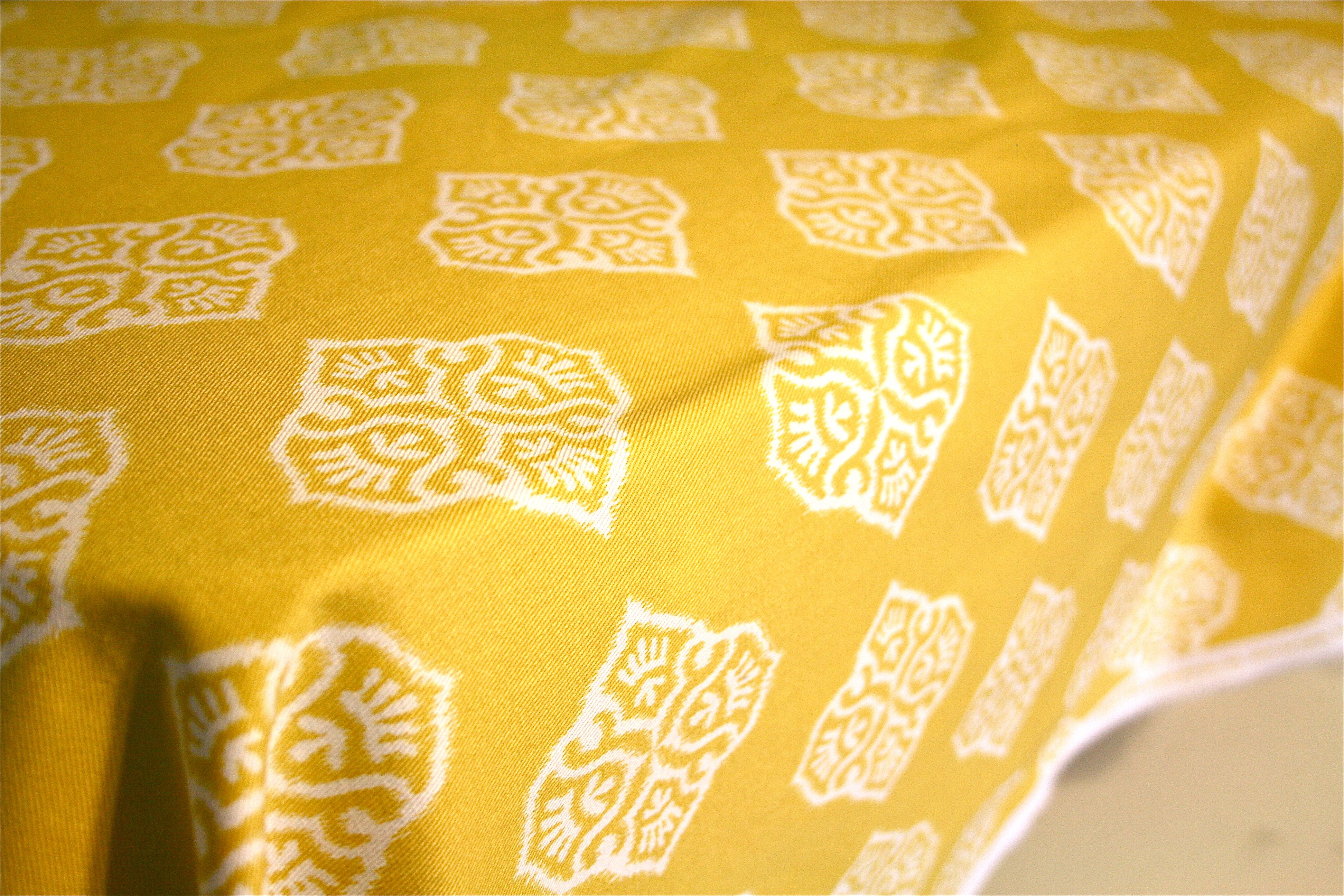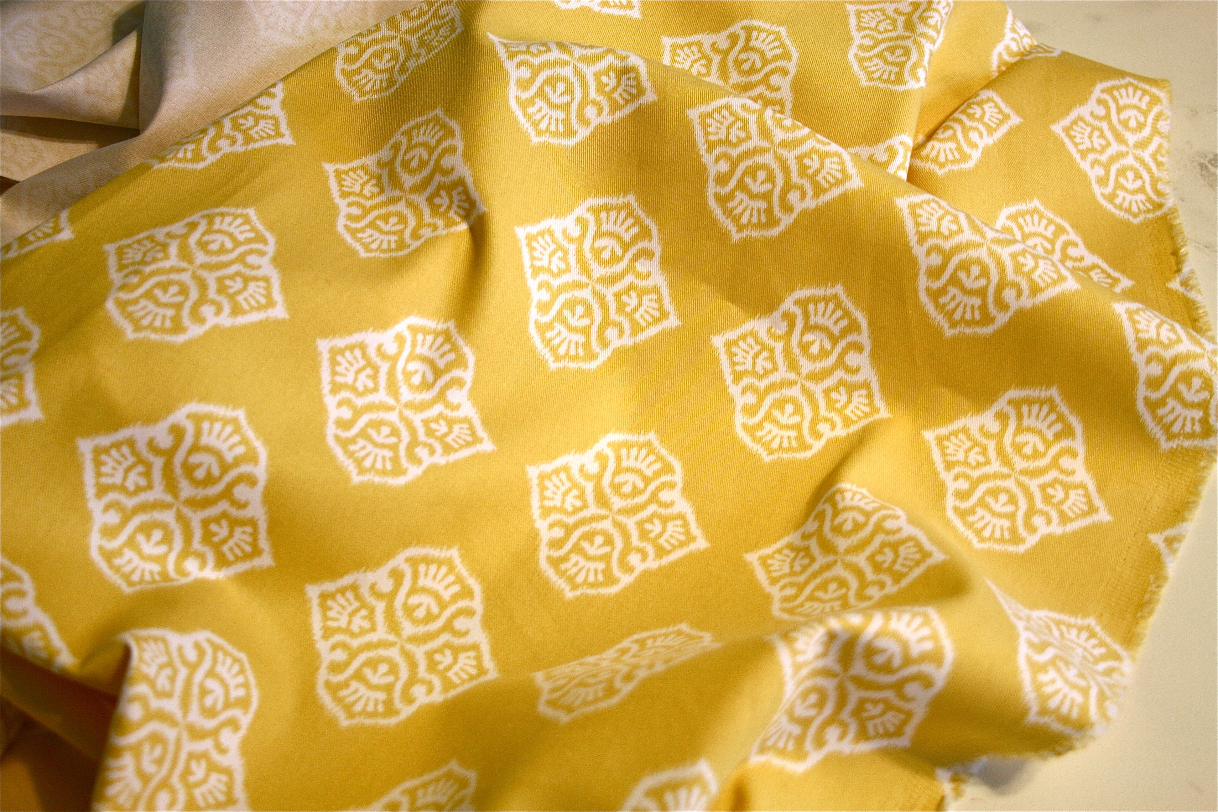 It actually sat for quite a while in my studio, waiting for just the right fabric to recover it with. Finally, after several weeks, I made it to the fabric store. My quest was to find something yellow with a modern vibe, preferably an ikat pattern – The only contenders though were at the back of the shop in the expensive designer section ($20+/yard). As we turned to go empty handed, I almost walked right by our fabric but managed to spot it at the last moment. Vaguely ikat, definitely modern and absolutely the bright, cheery yellow I was hoping for.