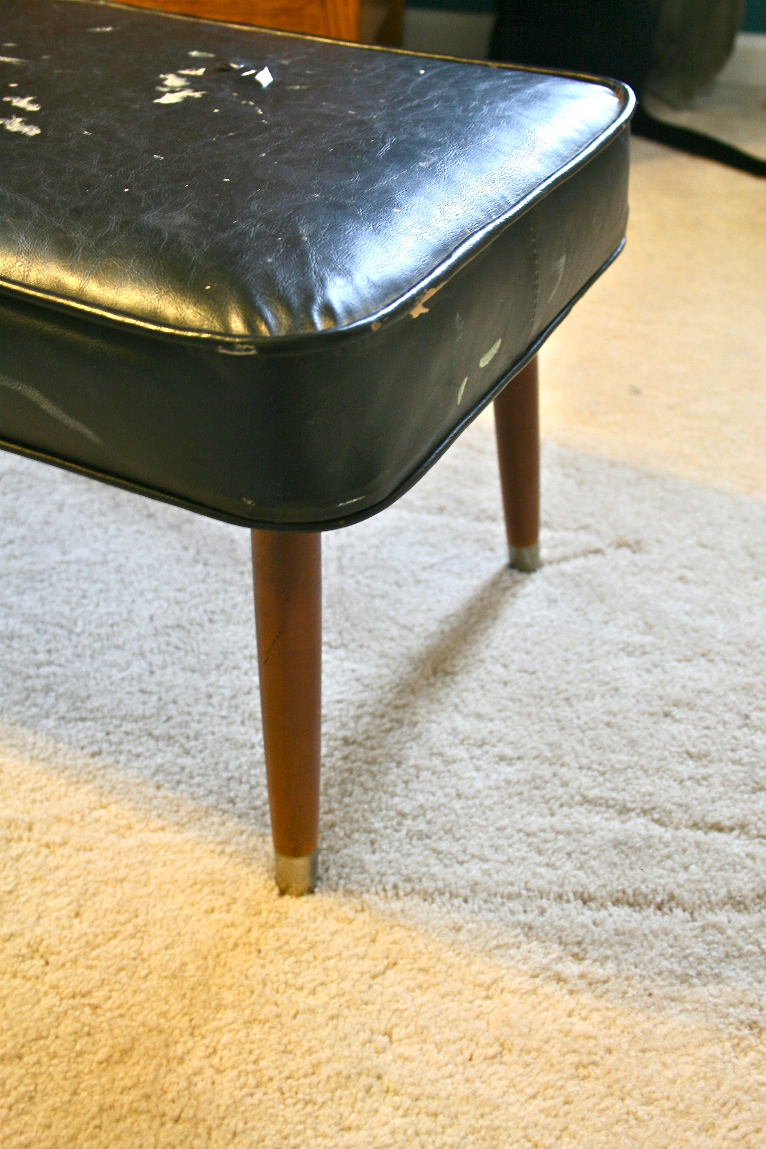 We’ve had this mid century ottoman for as long as I can remember – As you can see it’s had a pretty hard life. Complete with the tell-tale markings of a toss around project helper with torn leather and paint splatters across the top and legs.