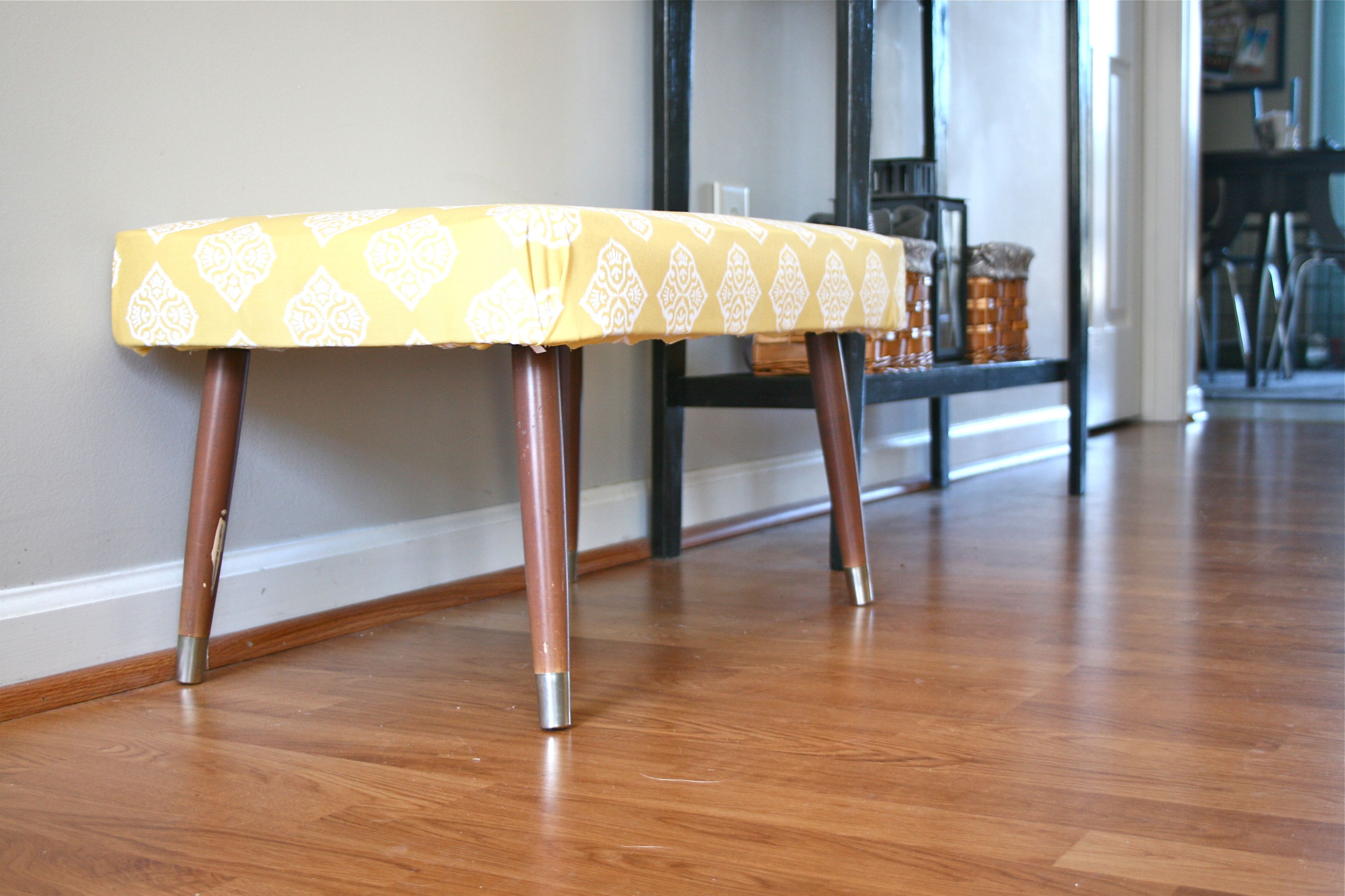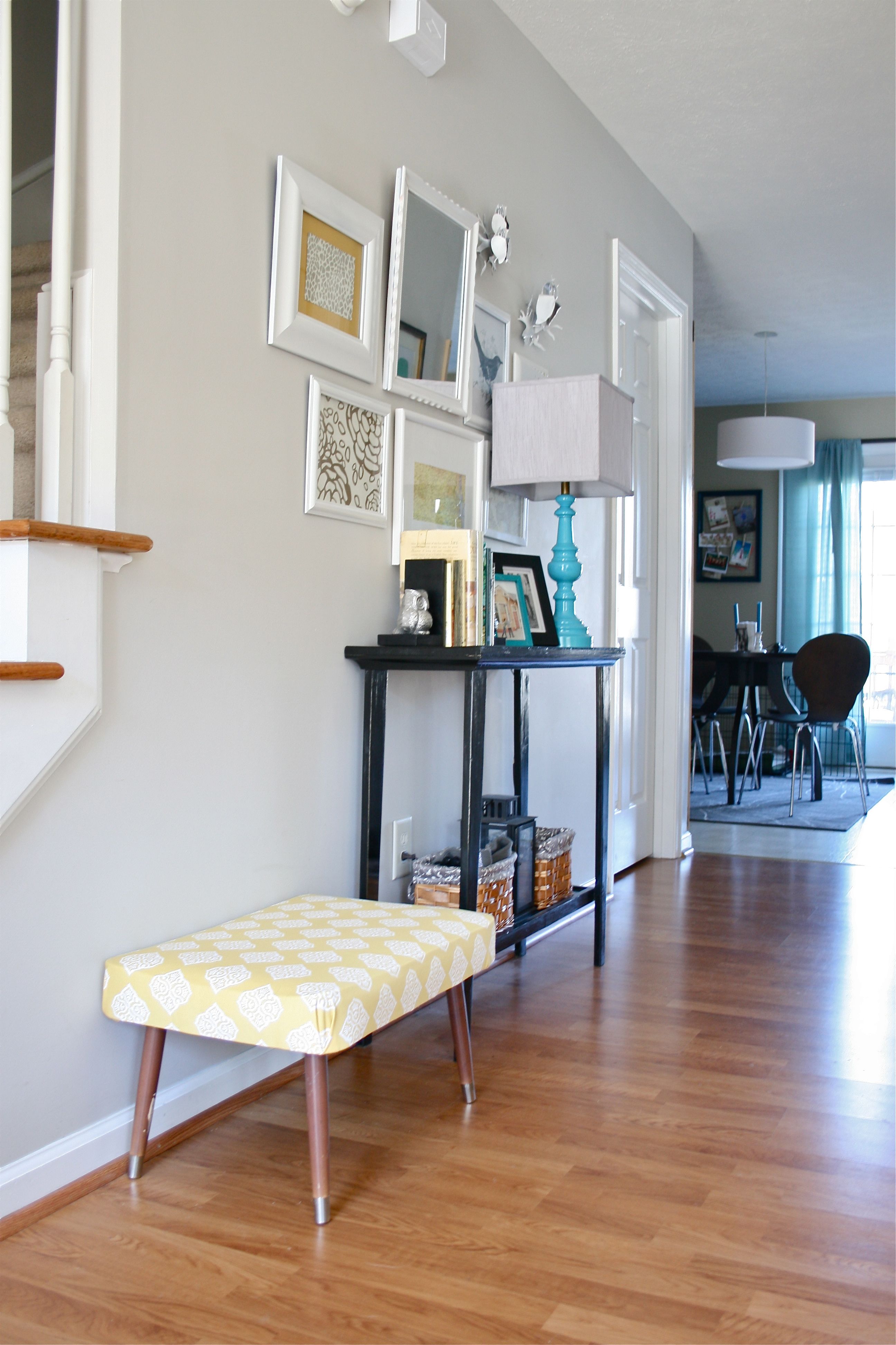 For now, I’ve put our newly refreshed stool in the entry way by the front door. The yellow goes well with our teal and sunny-hued living room, so it only made sense.