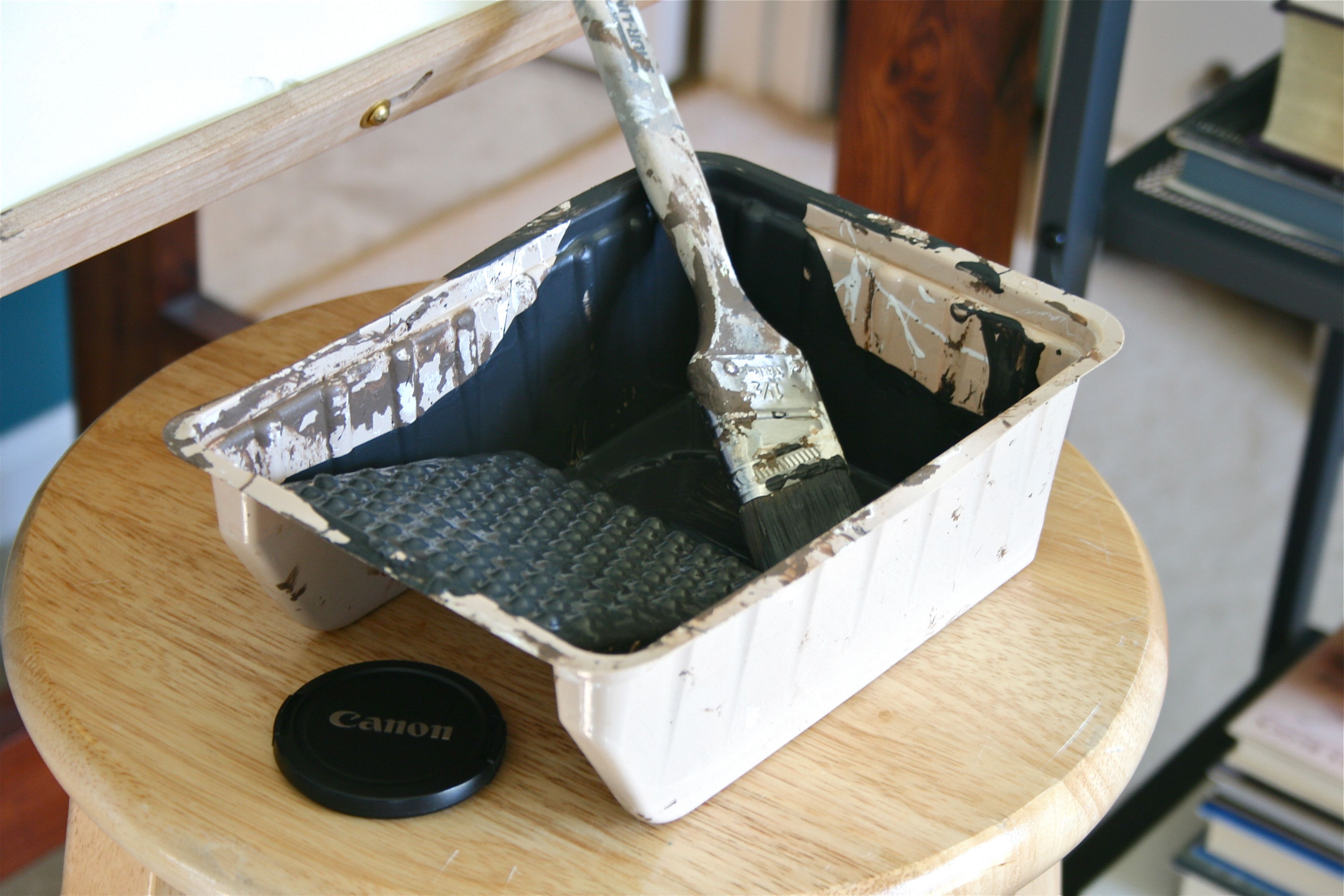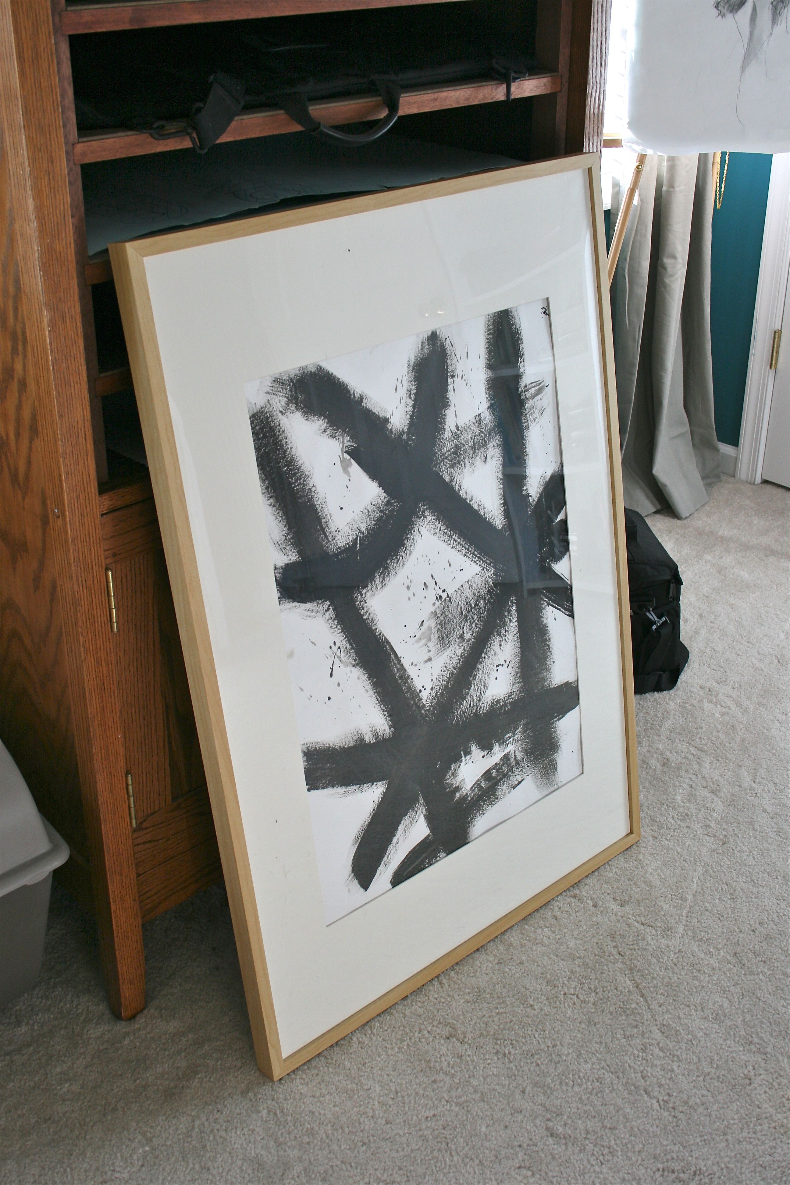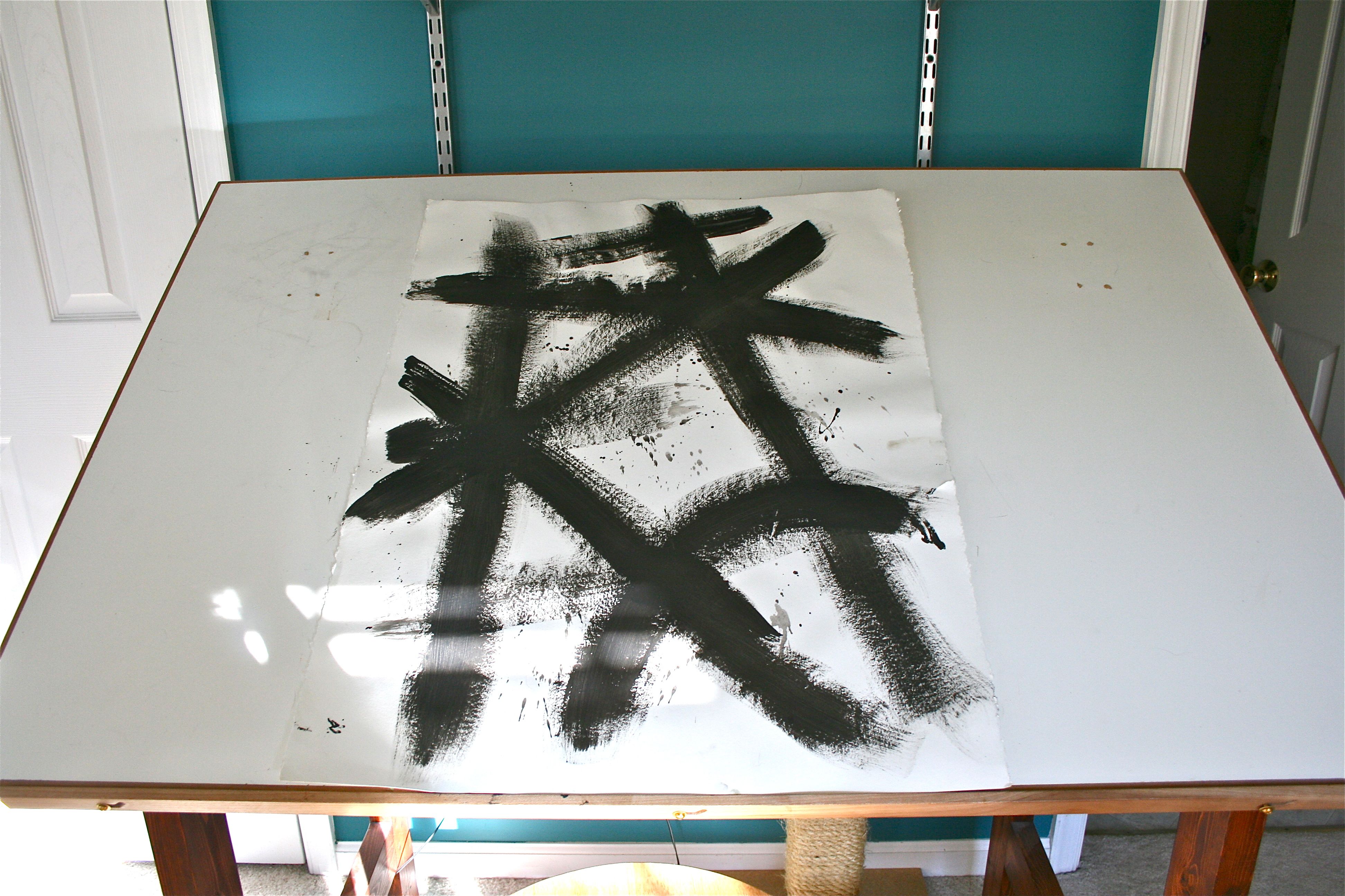 I already had black paint out along with a big paint brush, so in between coats on the feature wall, I grabbed a large piece of printmaking paper from my supply, set it on my drafting table and slathered jagged lines of black across it. I didn’t think about it, I just sort of hit it with whatever line I was feeling at the moment. I even decided to add a few splatters of paint this time by watering down the paint and fanning the brush hairs in the direction of the paper.