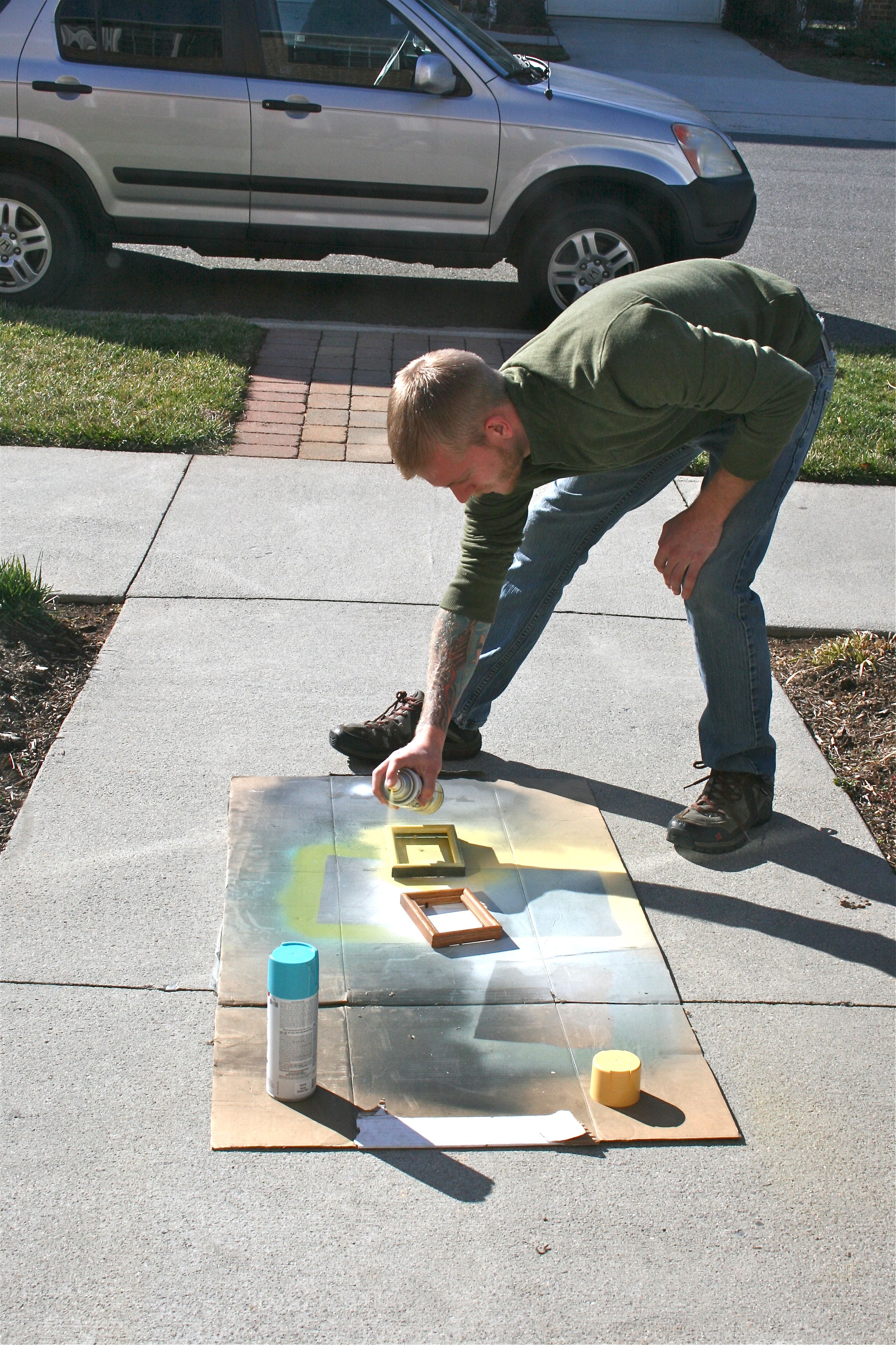 Time for their fashion-forward makeovers! I removed their “fillings” of glass and backing board and then put them out on the front sidewalk on top of some cardboard. Then my sweet and accommodating fiance did the rest – Spray painting each with either a pop of neon teal or canary yellow. We don’t actually have any specific color scheme for the wedding since we are using colorful mismatched vintage china in place of rented serving ware, and we are also just using whatever wildflowers are in season for the centerpieces, so I simply chose two of my favorite spray paint colors that we had in stock in the garage.