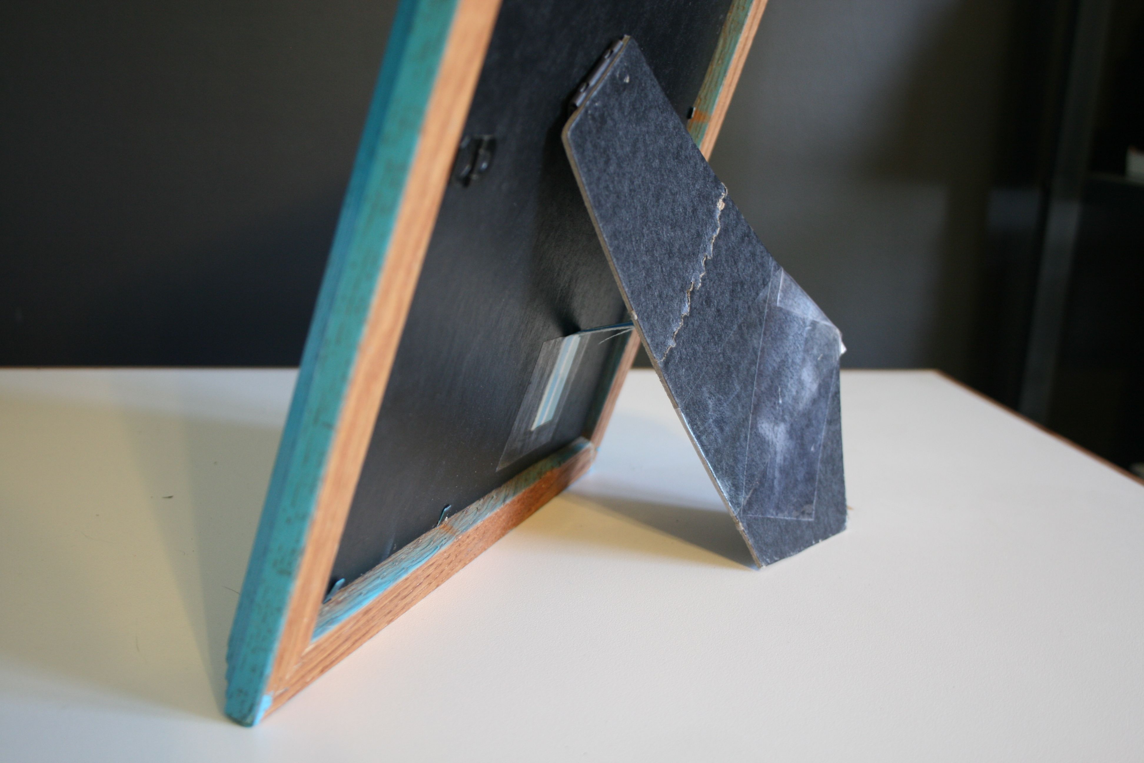 I debated reinforcing it was a dowel rod, but in the end I went with a piece of ribbon and some tape. I cut the ribbon to the length of the distance I wanted the frame arm to swing out (with a little extra on the front and tail of the ribbon). After it was cut to size, I taped one end of the ribbon to the frame’s backing board and then the other end to the arm. This meant that the arm could swing out only so far from the frame, steadying it on whatever surface it sat on.