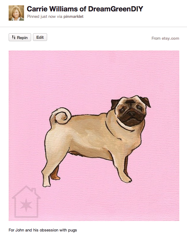 In the meantime, Kim also sells inexpensive art prints on her Etsy page. When I saw Mr. Pug Man, I knew I had finally found the perfect way to not only celebrate my soon-to-be hubby and his love of pugs, but also to own a little piece of art from a blogger I respect and admire.