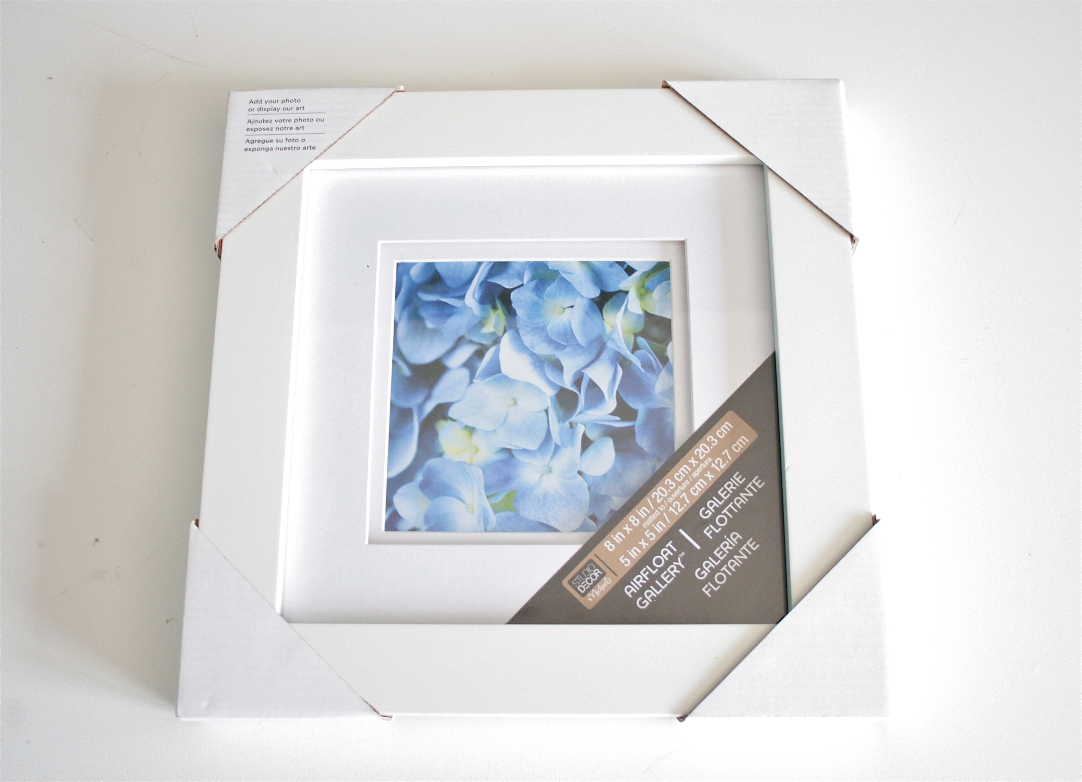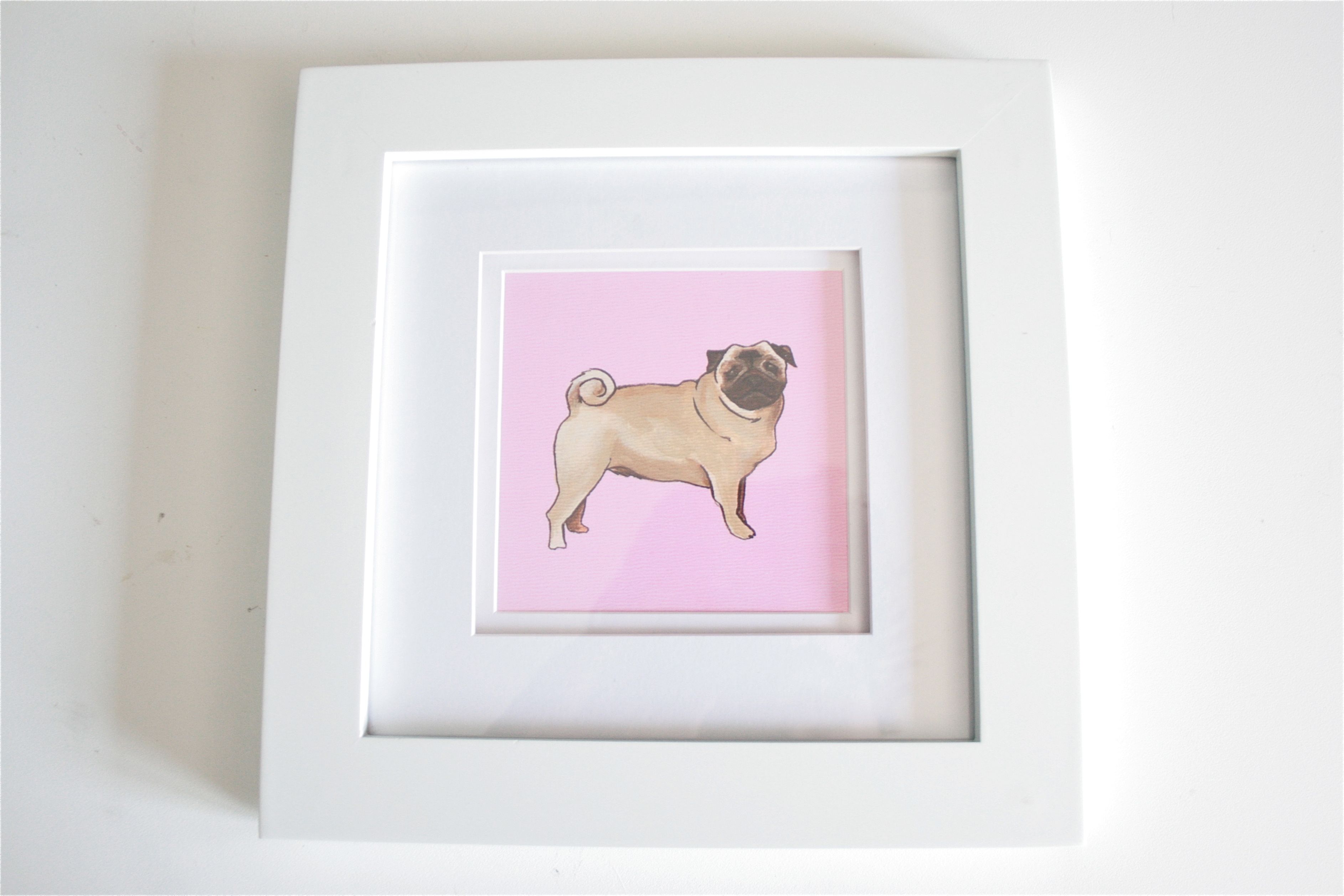 Now we needed a frame…The print is 5×5, so I needed to find a square frame/mat to go with it. Off to Michael’s craft store we went, where I picked up this already-matted crisp white frame. Why white? I wanted the pink background of the print to do all the schnazzy talking this time, and the white seemed like the perfect way to let it do just that. We lucked out with a 40% off sale on the $14.99 frame, so it came home with us for under $10.