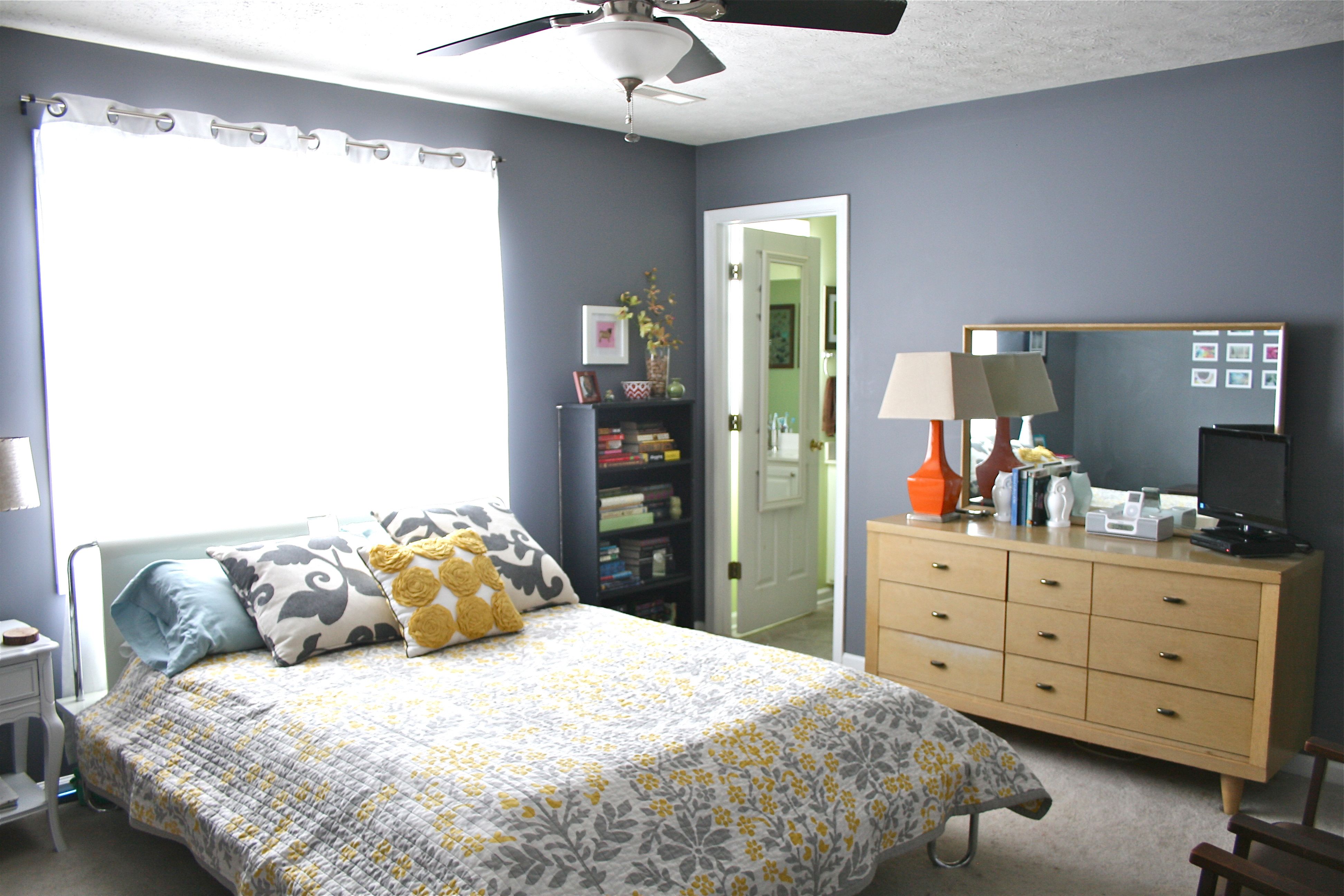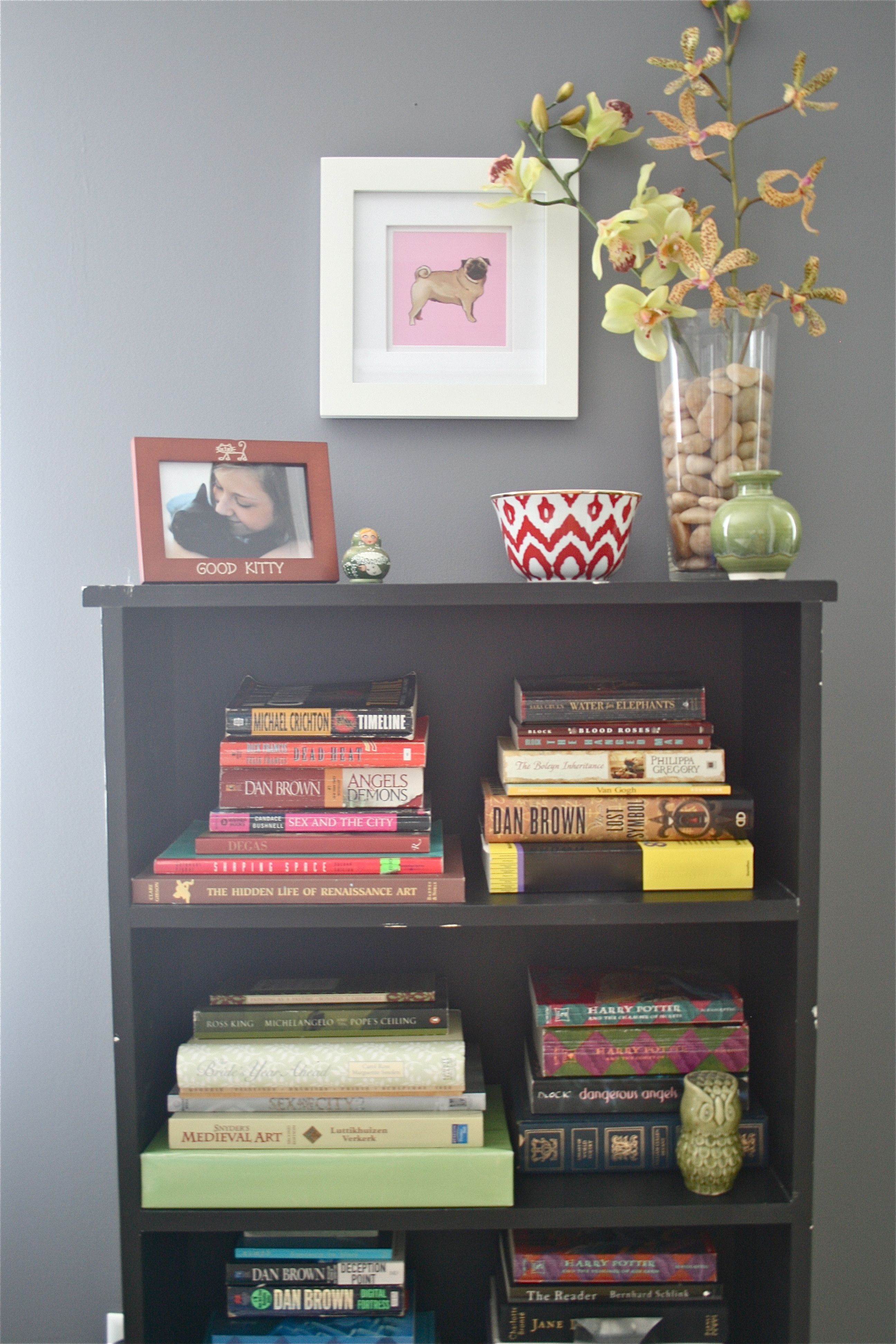As I mentioned before, I decided to hang it up on John’s side of the bed over our bookshelf. You can see it towards the center of the photo below. I think I am going to paint that bookshelf one weekend soon – The black worked in my old apartments, but now I’m thinking of it in a crisp white instead. What do you guys think? Maybe something bolder? Yellow?
