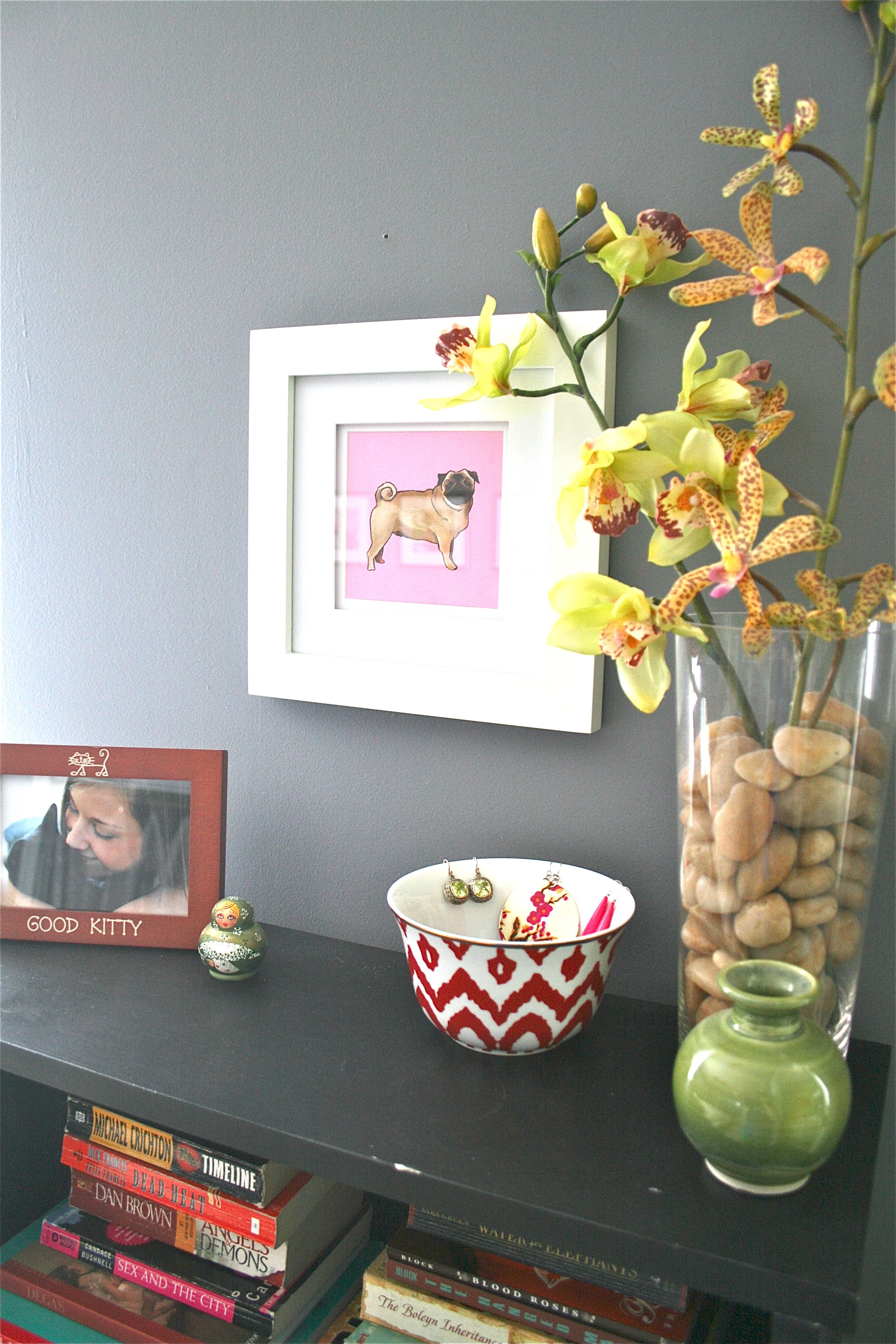 Mr. Pug Man, as he has now affectionately been dubbed (my apologies to the artist if this is actually a Mrs. Pug Lady), has now happily graced our lives – John gets a kick out of having a pug hung proudly on his side of the bed, and I get a kick out of his reaction.