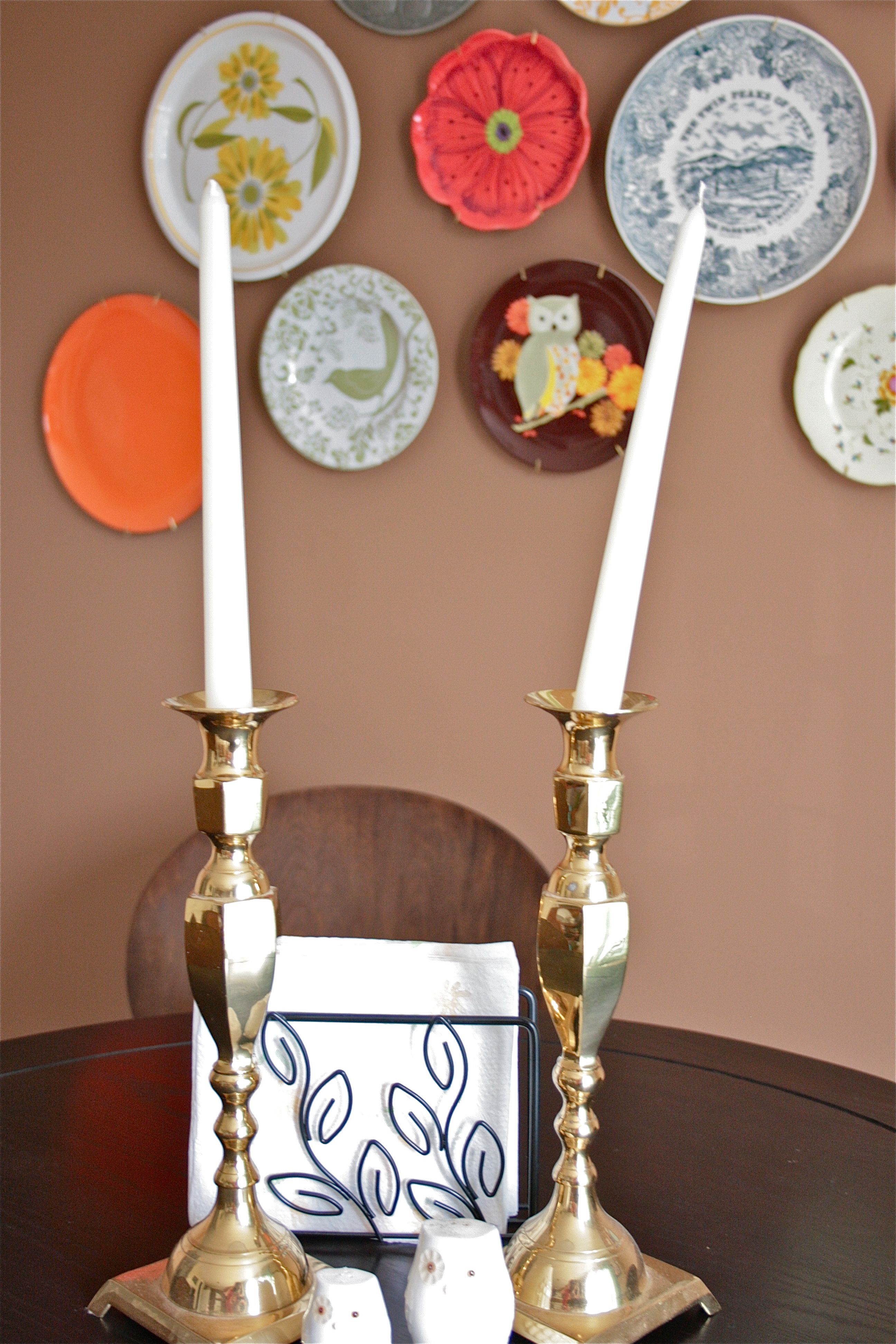 Like any gal, I’m a fan of candle-lit dinners. Stricking a match on two tapered candles at our dining room table can easily turn a normal meal into a special one, and we are all about making cheap meals at home seem like a date night out in this economy. We always have a little collection of them acting as a centerpiece at our kitchen table, but they were recently upgraded to the two lovely brass ones seen below – They came from my parents’ house after mom read my “Love of brass” post (seen here).