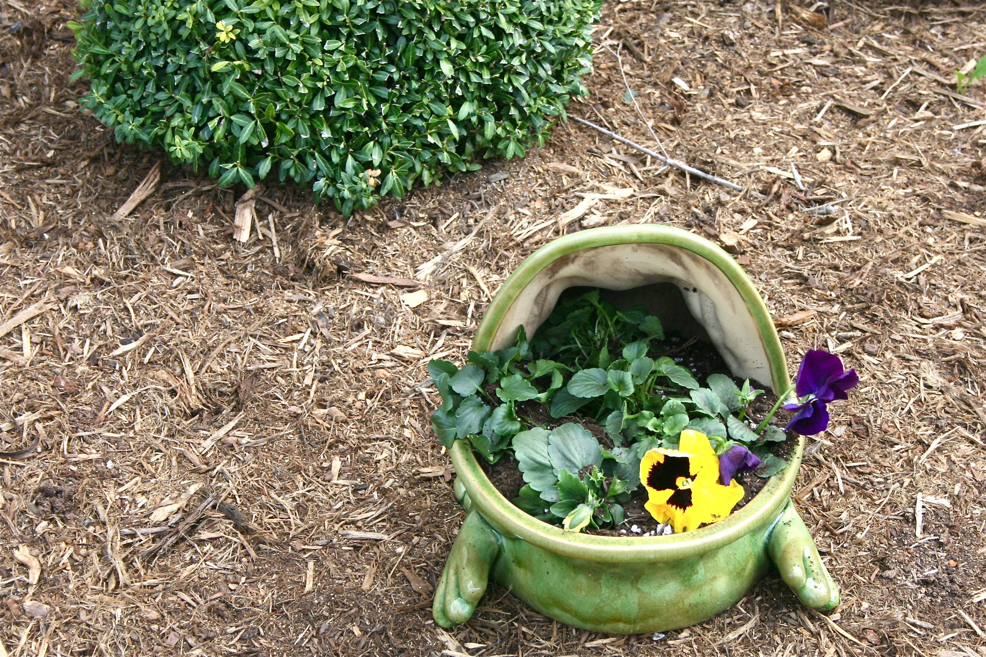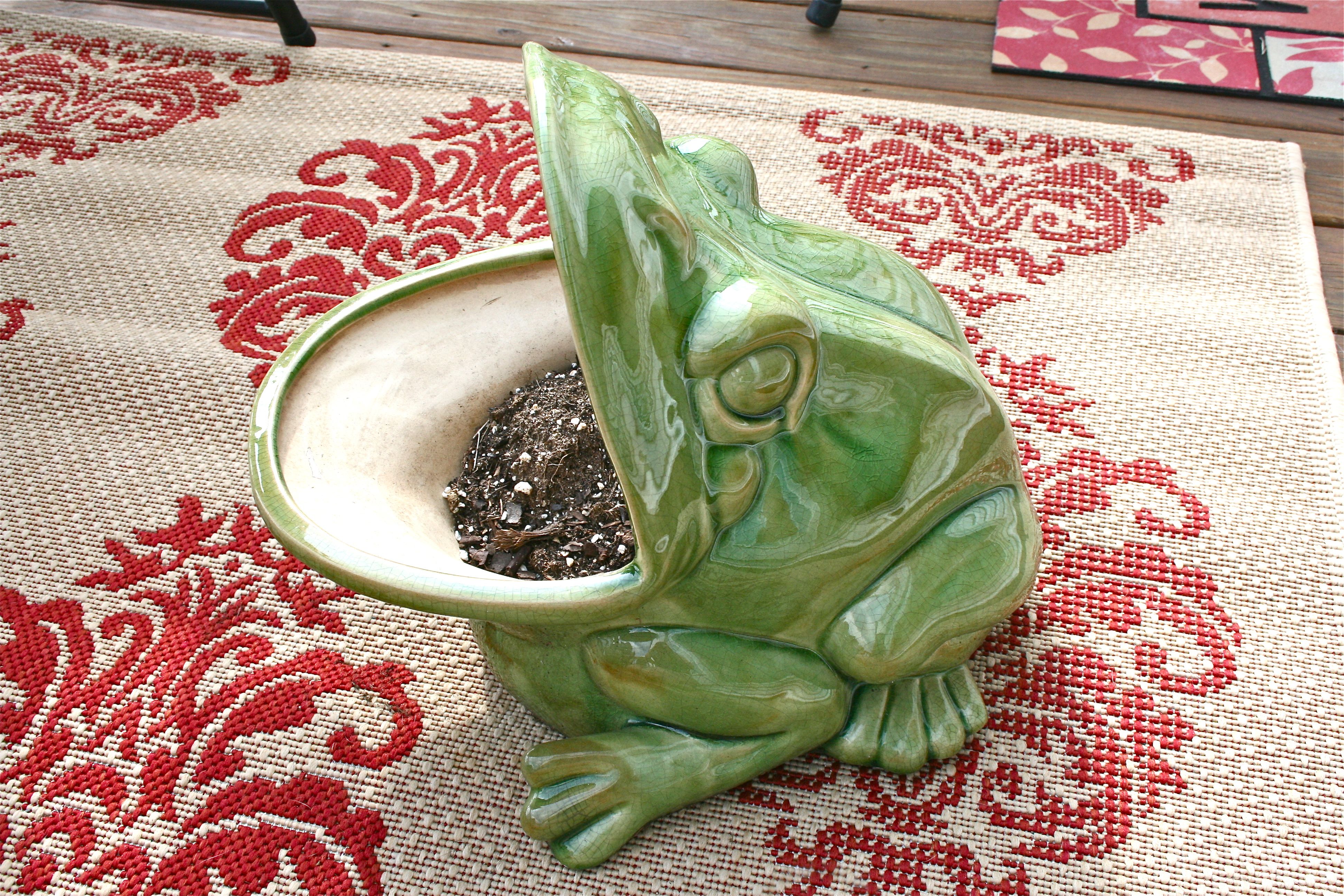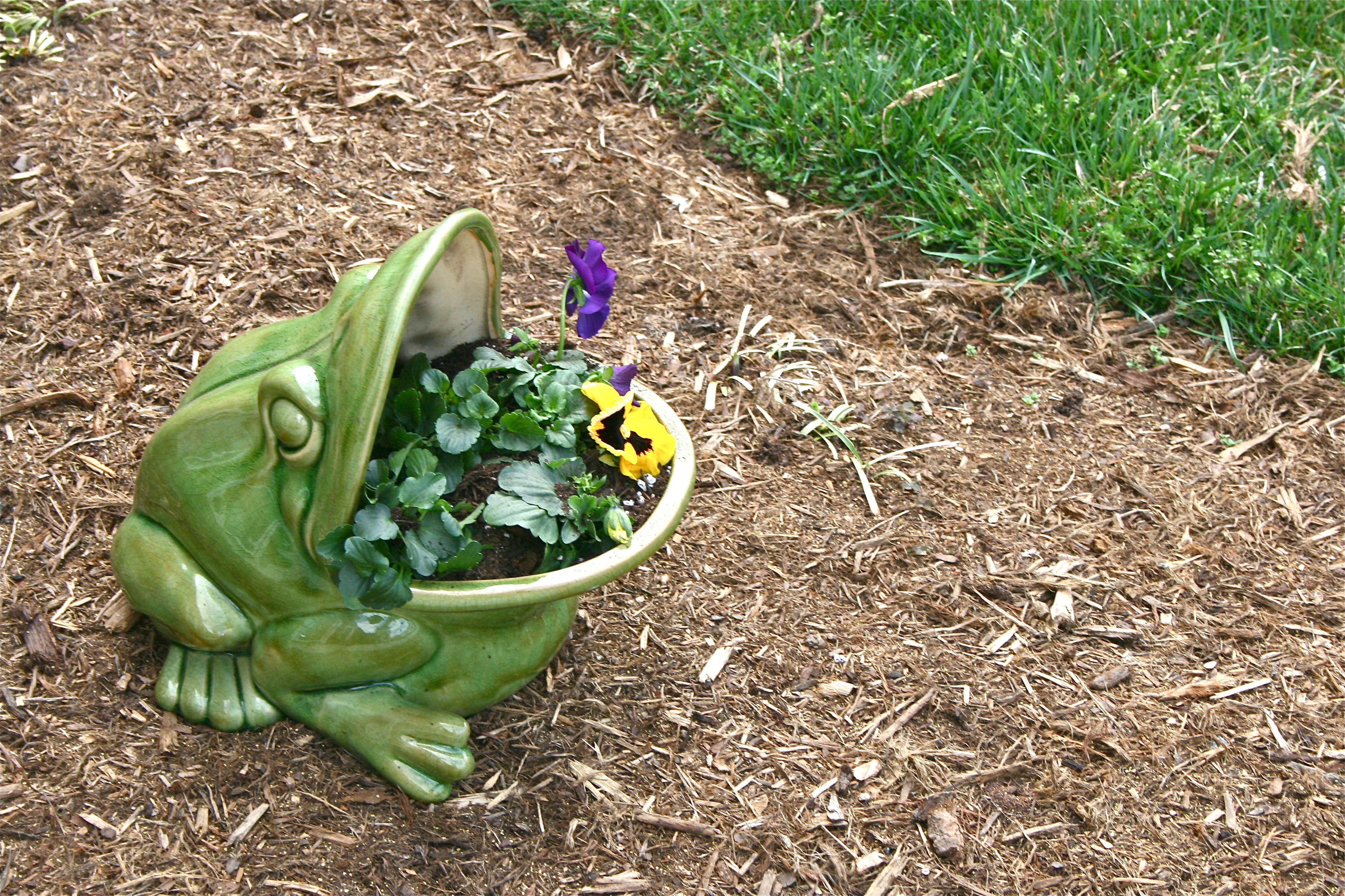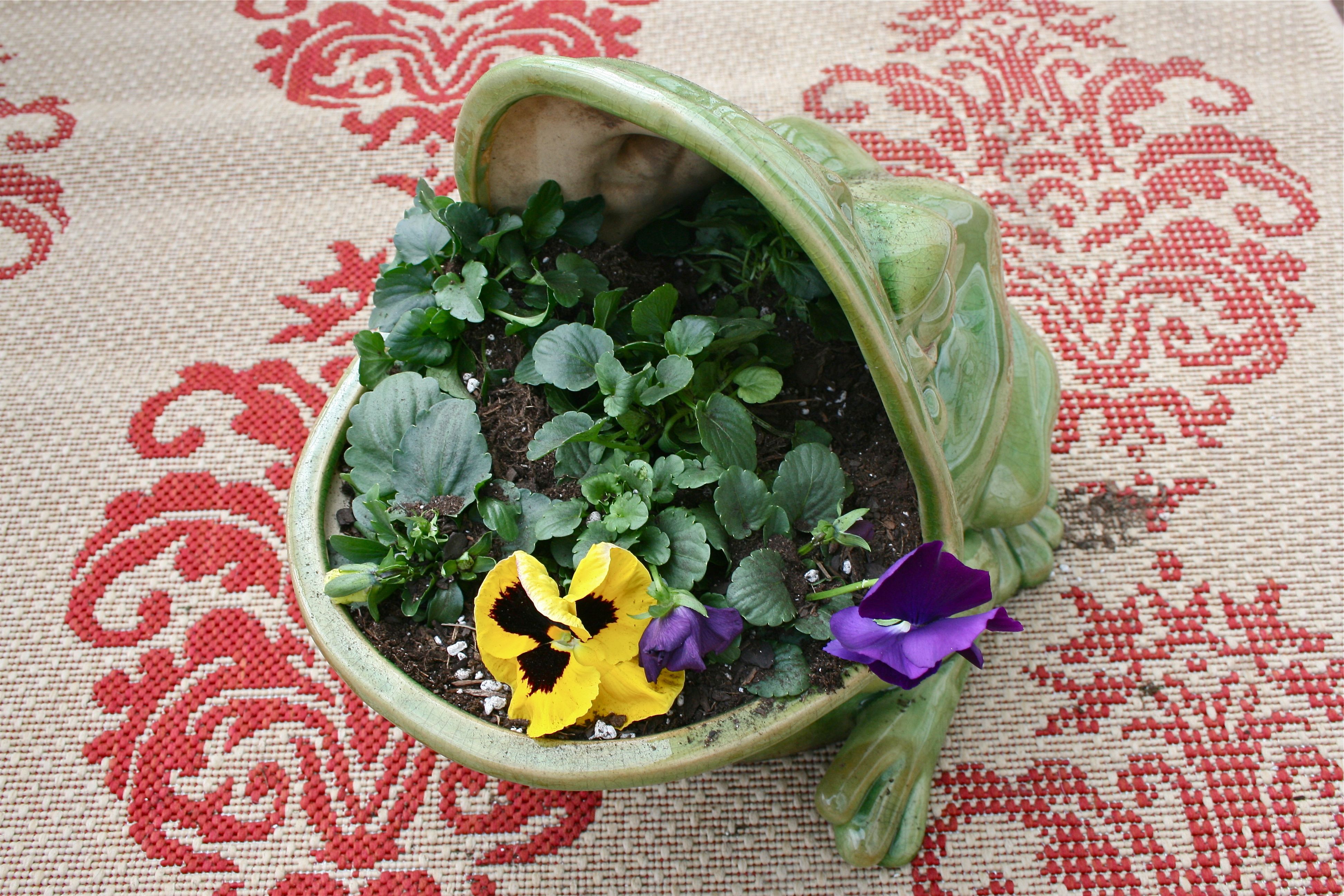 John and I picked up these two pots of pansies at the grocery store for under $10, planning to fill Mr. Frog’s wide-open jaws with them.