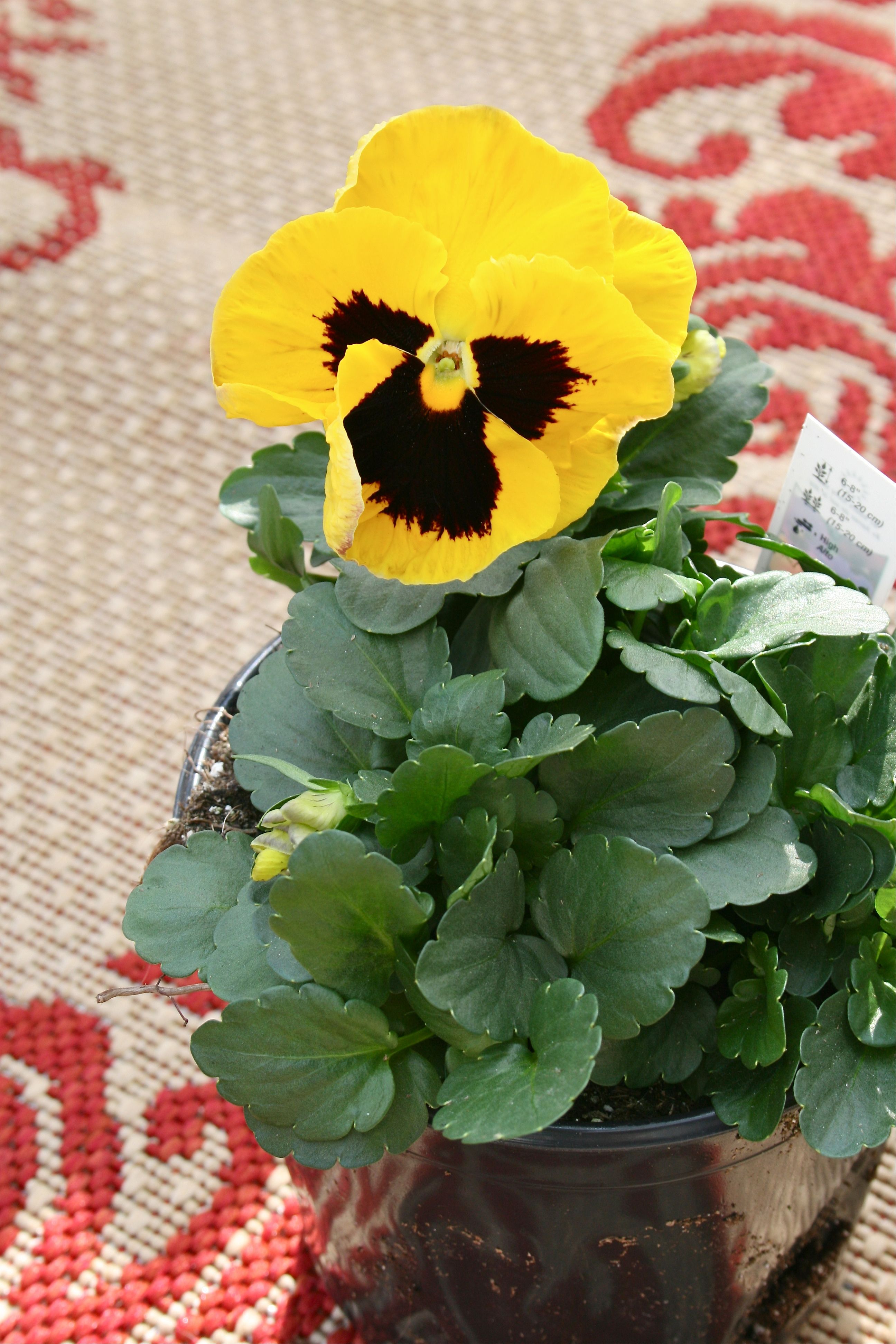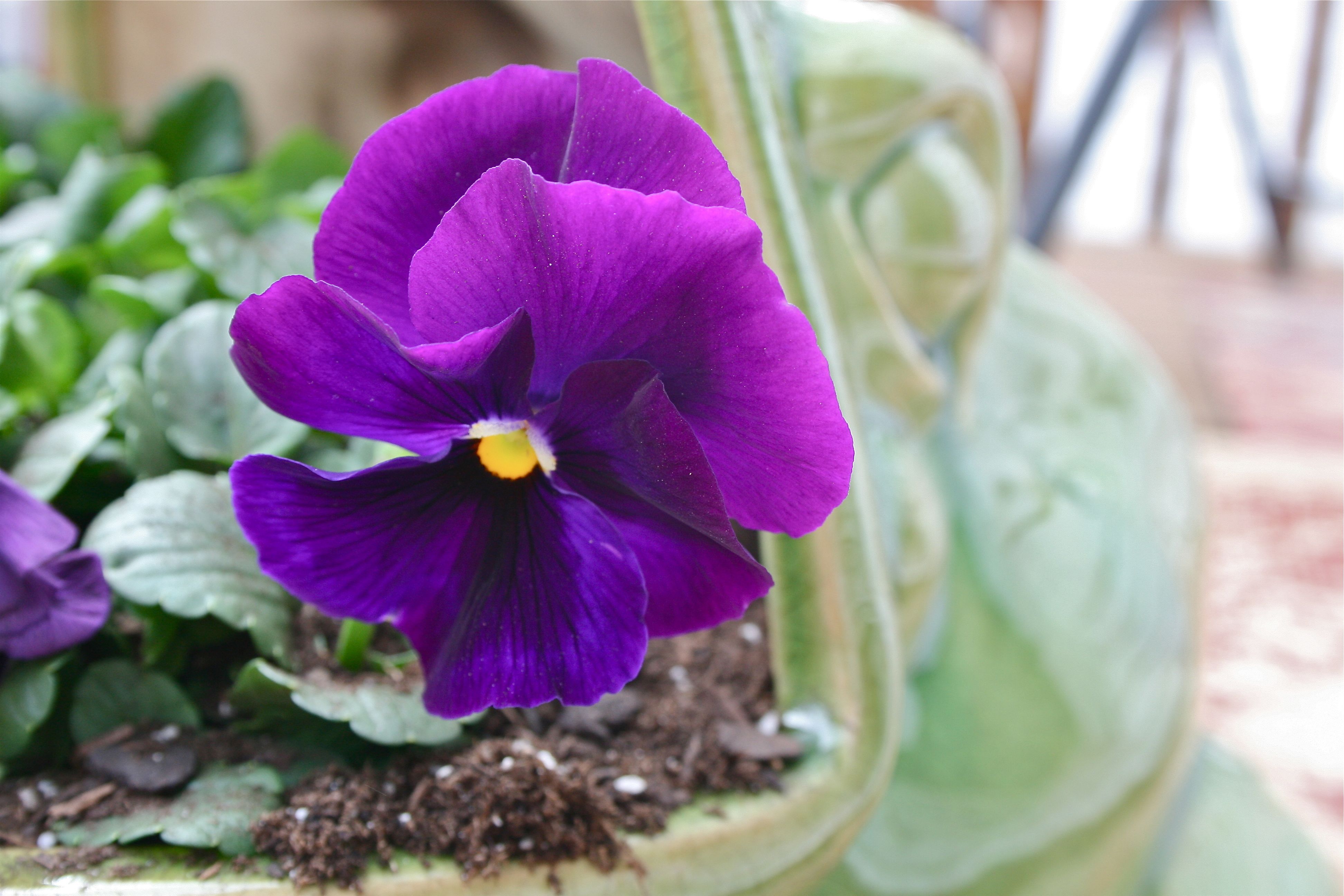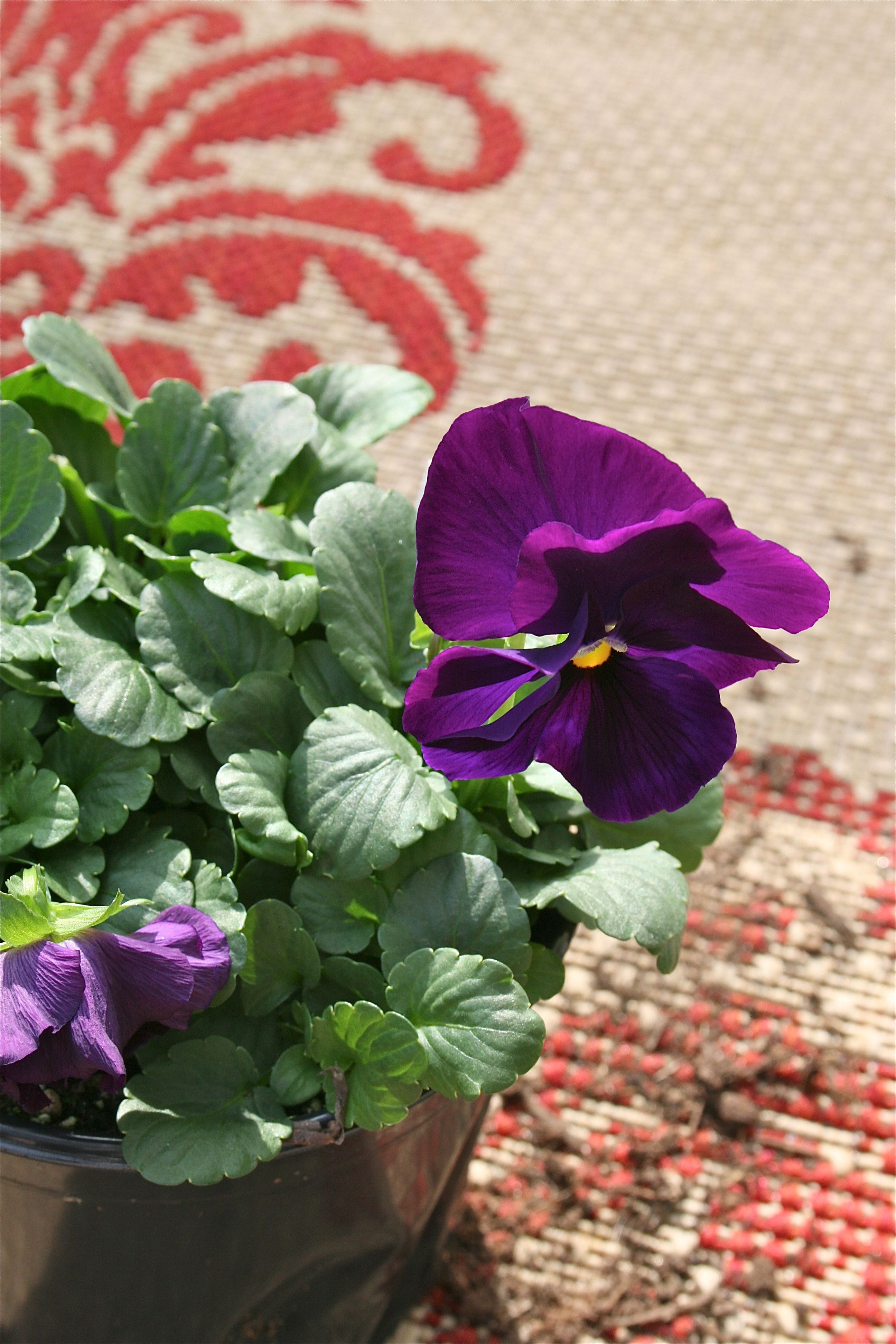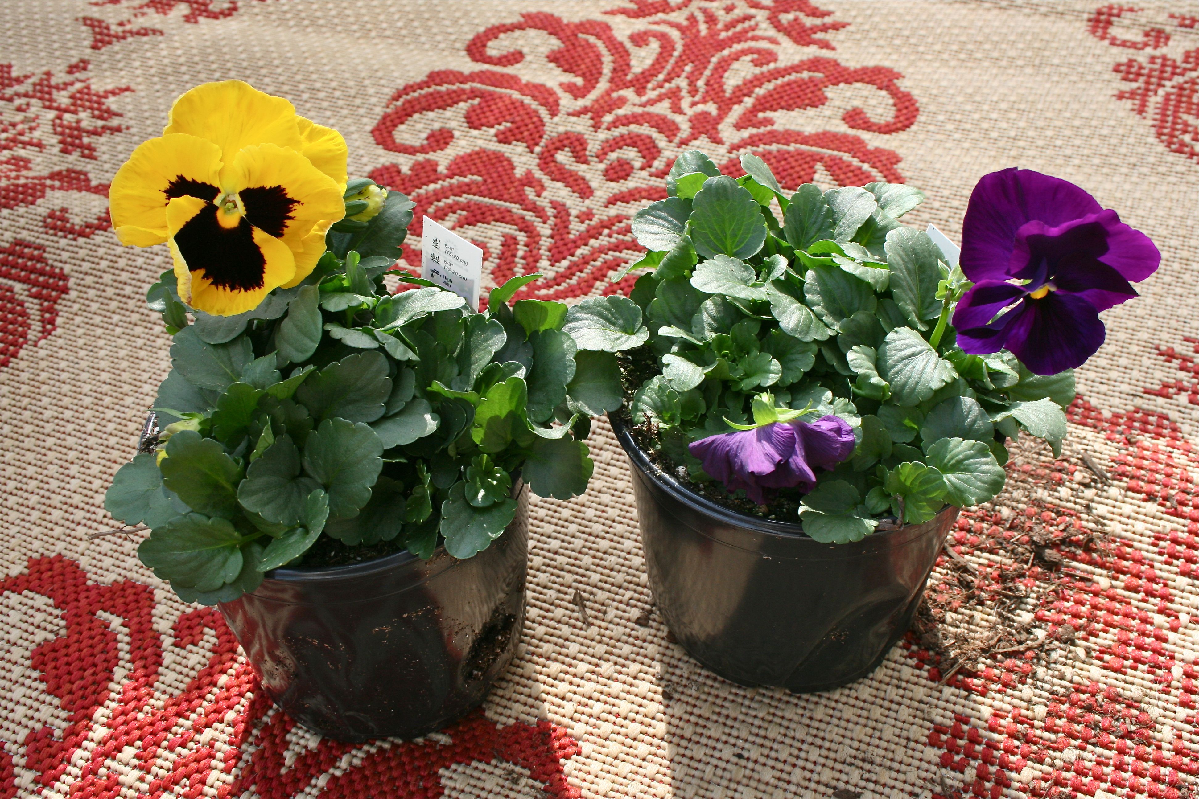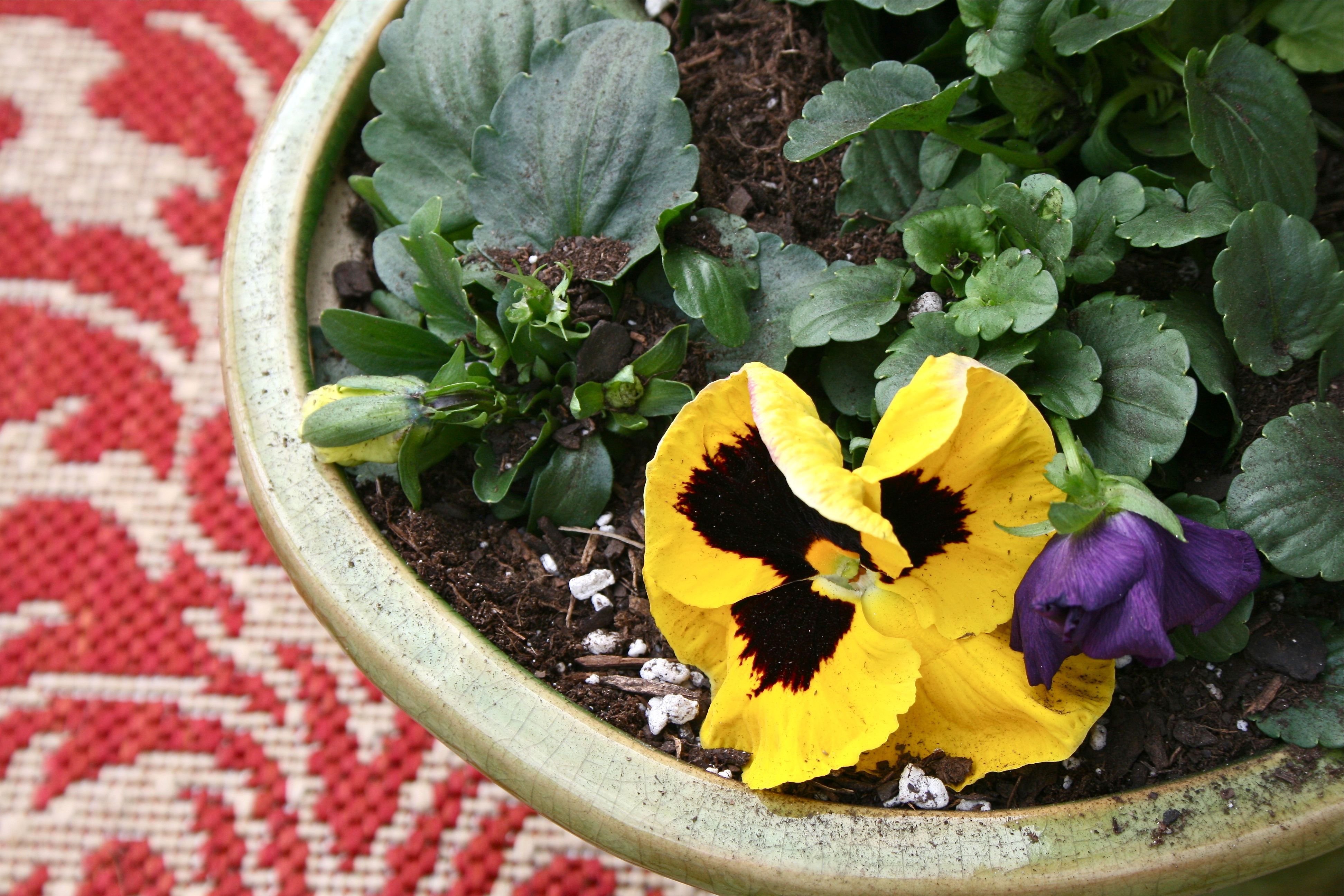 John and I picked up these two pots of pansies at the grocery store for under $10, planning to fill Mr. Frog’s wide-open jaws with them.