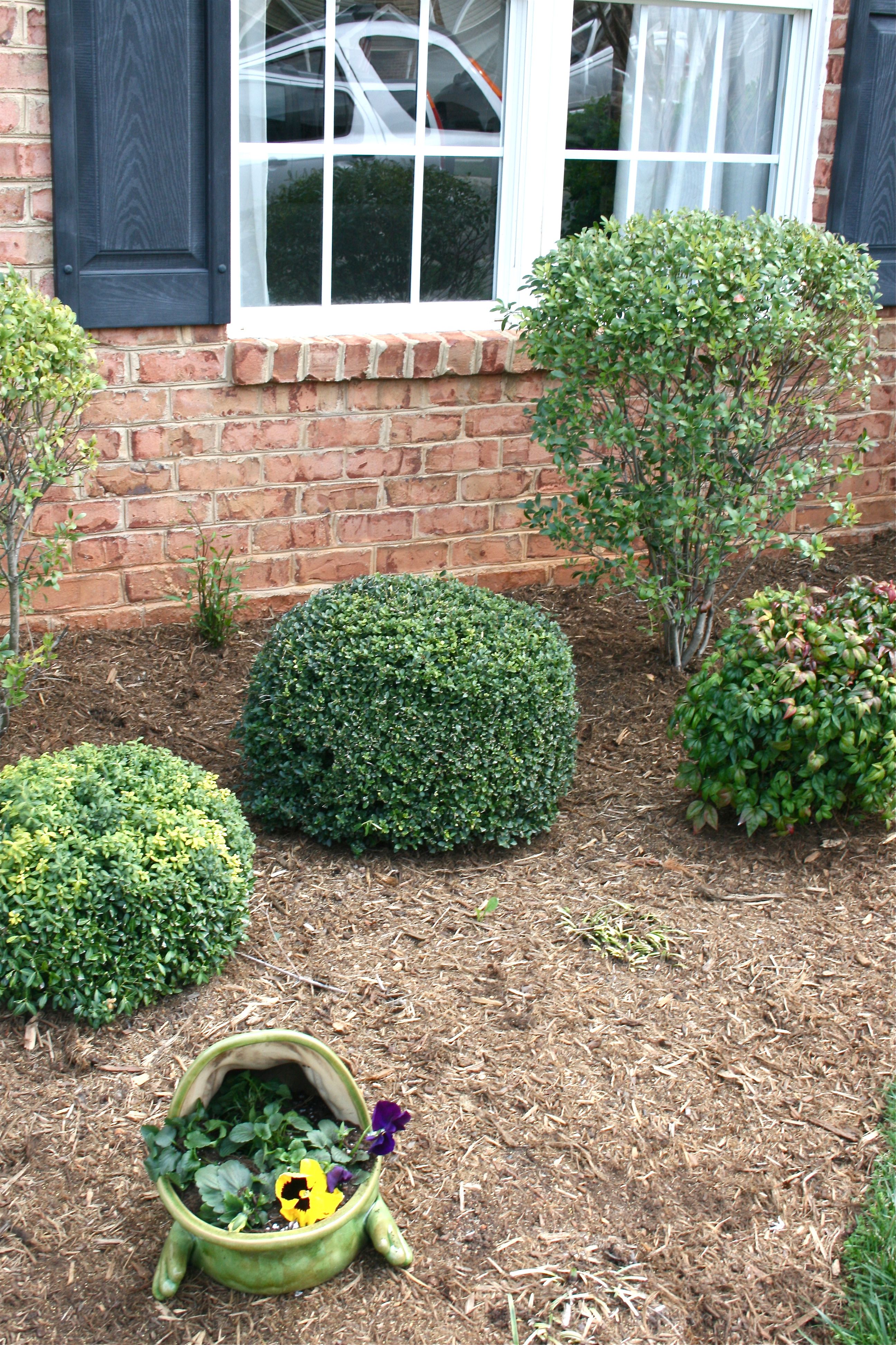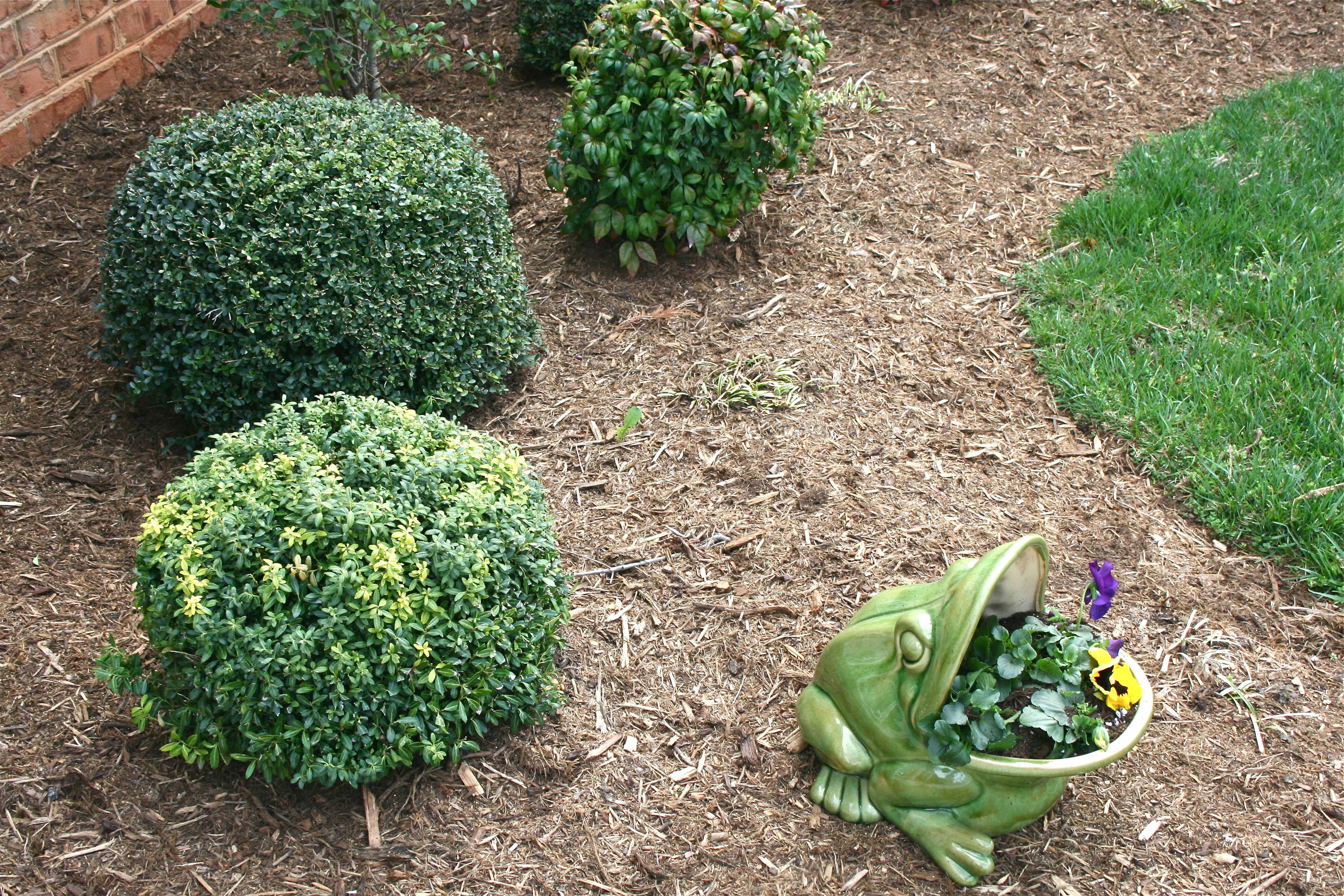 After admiring Mr. Frog and his new blooms, we trekked out front to situate him amongst his live-in green neighbors. As you can see, our bushes are a little worse for wear – They seem awfully threadbare to me. We are just coming out of winter, but do you guys have any suggestions for weak-looking bushes? Are they worth keeping? We have landscapers come out and take care of our lawn and plants every few weeks, so I’m quietly hoping that they will do something about it…