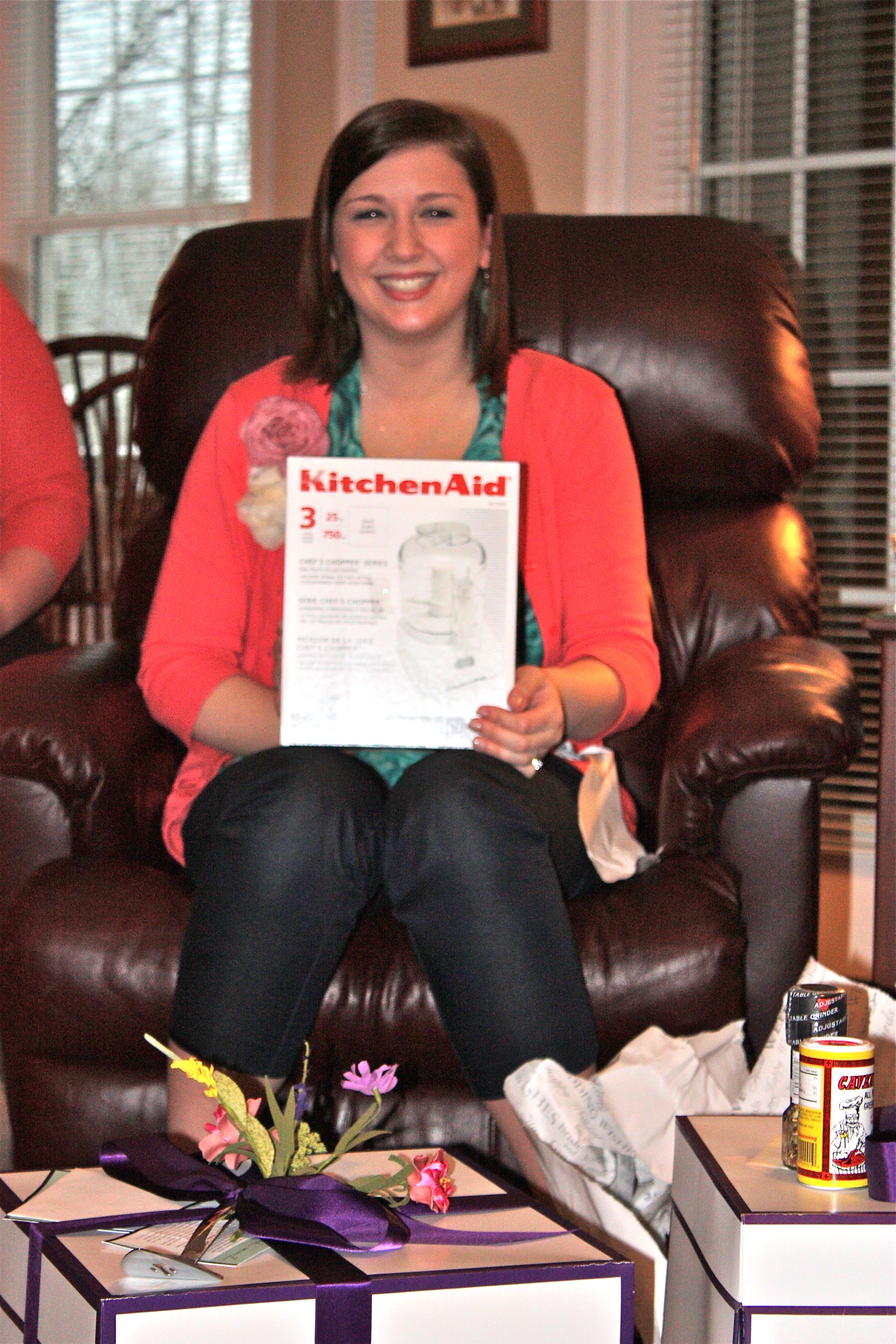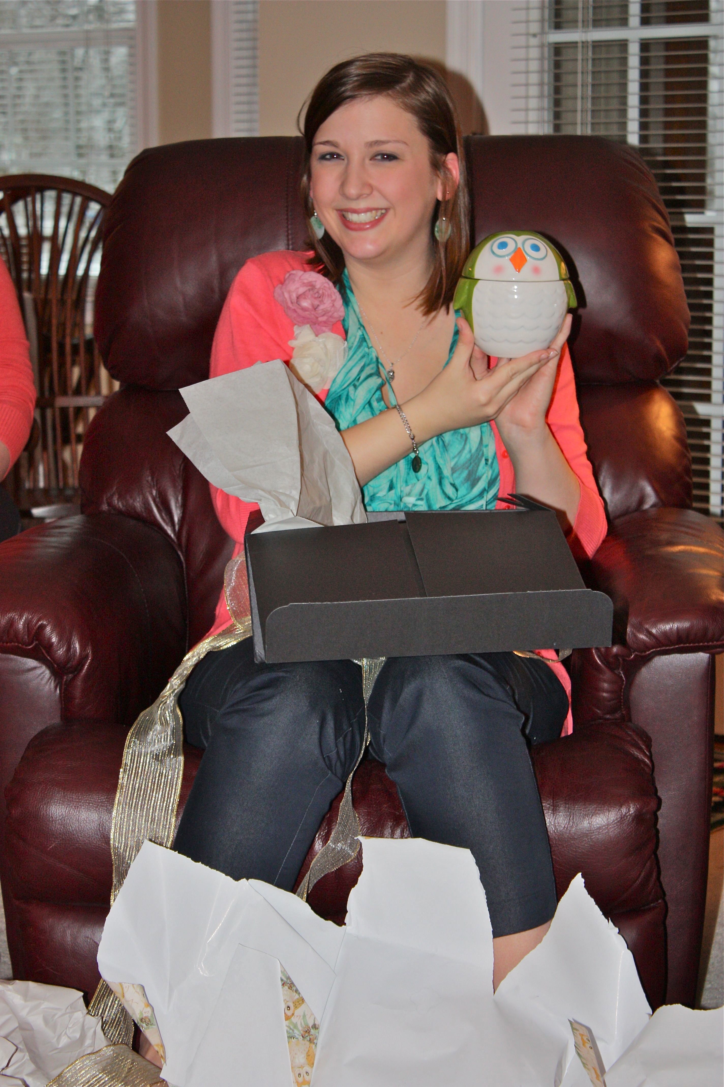…it was time for gifts – I will never be able to thank my friends and family enough for all of the amazing things I was given that day! The shower was kitchen themed so I received things like a white porcelain punch bowl, an owl measuring cup set (seen also here), a food chopper and cupcake tupperware.