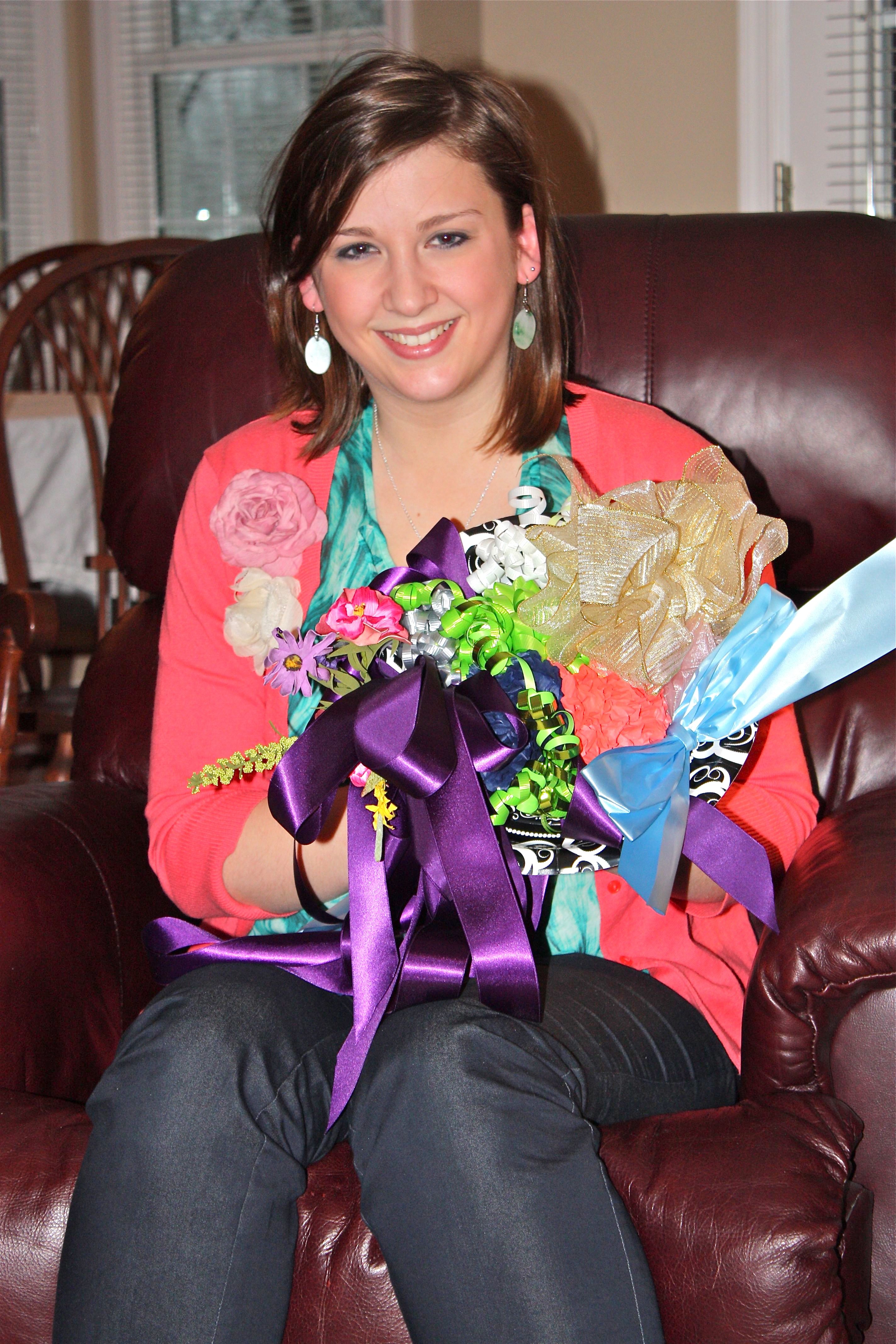 Even though we are not having a rehearsal dinner (we opted for a private ceremony with just us and immediate family members), my friends still wanted to follow the tradition of making me a bouquet from all the ribbons and bows taken from the gift boxes. Another fun memento from the afternoon.