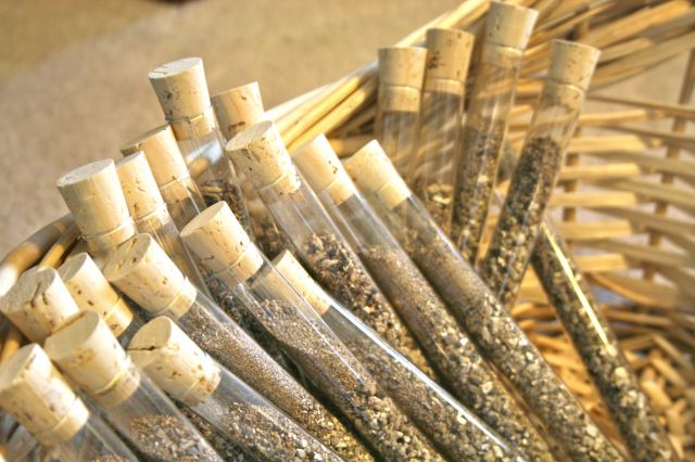 So pleased to have finally finished up our wedding favors. This project took a bit longer than originally planned, but I suppose that’s bound to happen when dealing with lots of fragile and tiny materials. When last I left you, we had completed 1/3 of the project, having filled the first round of test tubes with wildflower seeds.