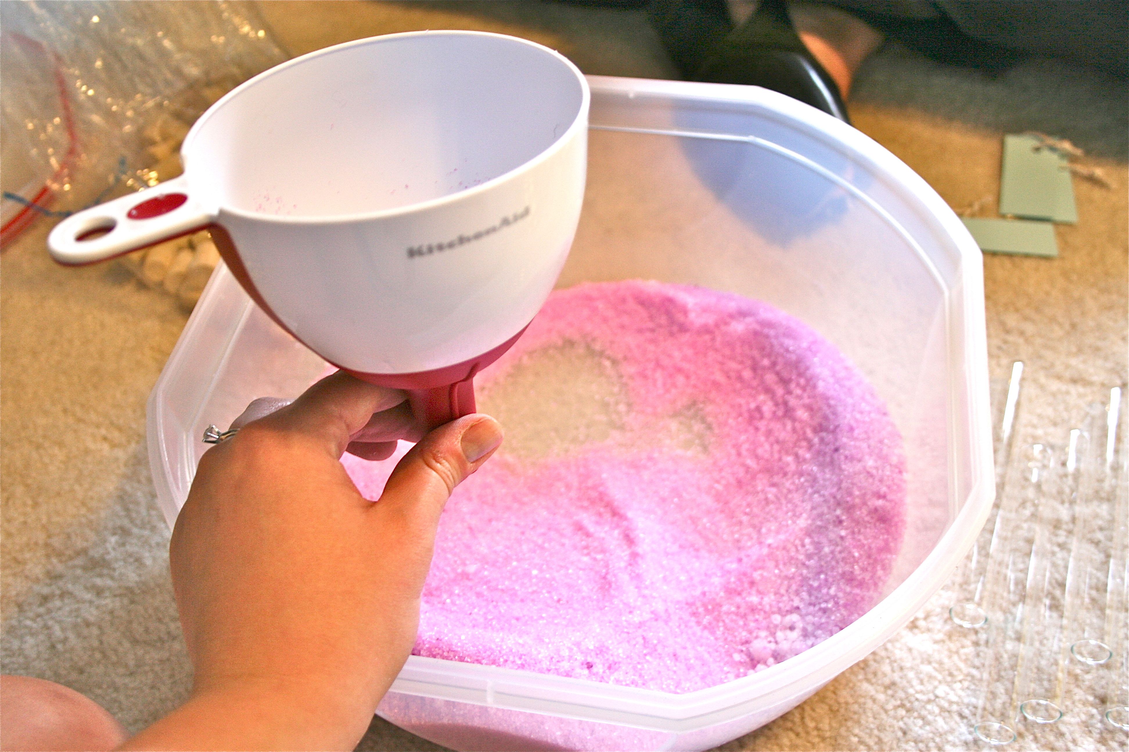 The other two batches of test tubes were to be filled with mini m&ms and lavender-infused bath salts (not together – m&ms + bath salts = yuckkkk). These two took a bit longer to complete because apparently mini m&ms are nearly impossible to track down (we finally found them at Sam’s) and I was waiting on mom to make the bath salts (I’ll share the recipe for that in a post after the honeymoon).