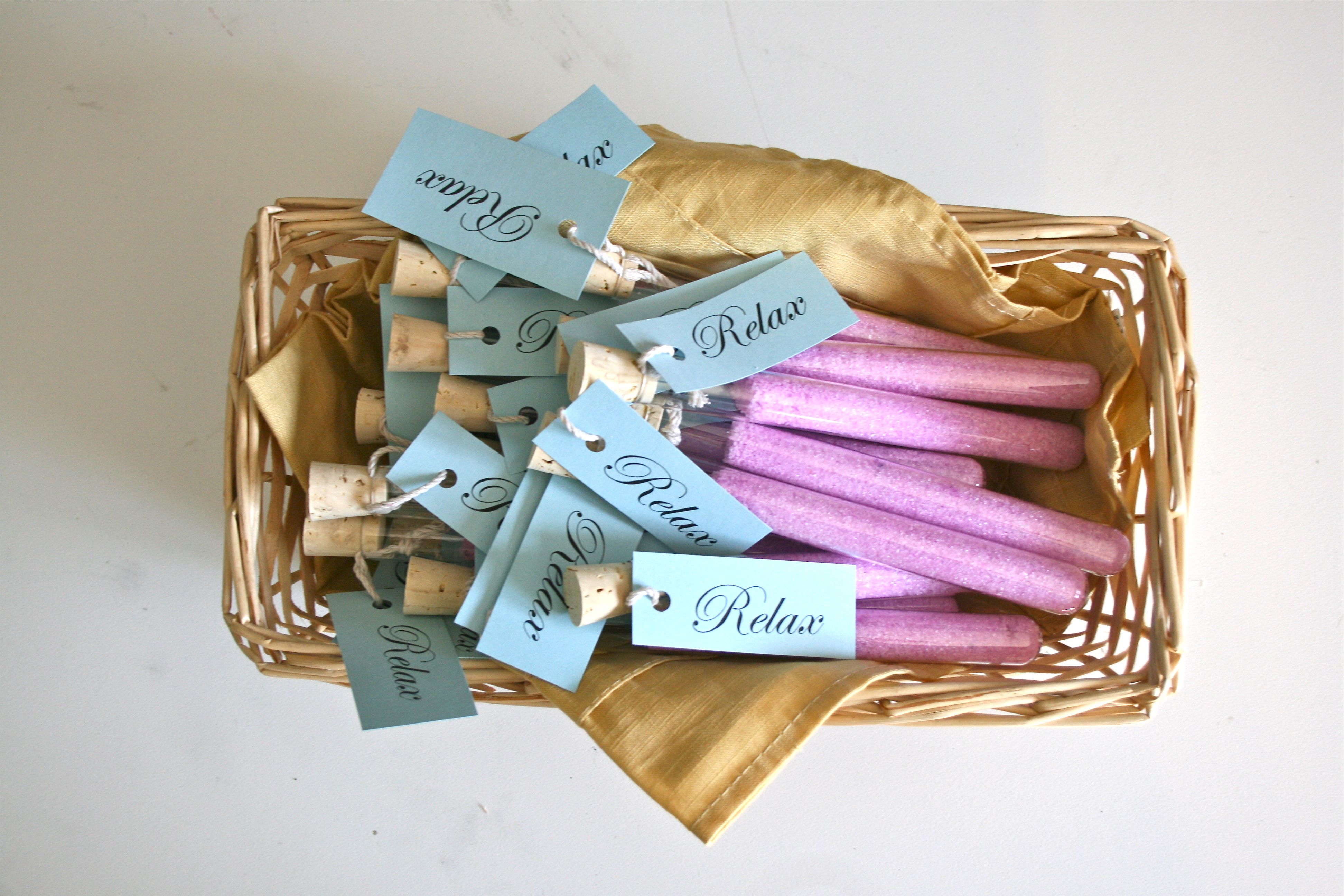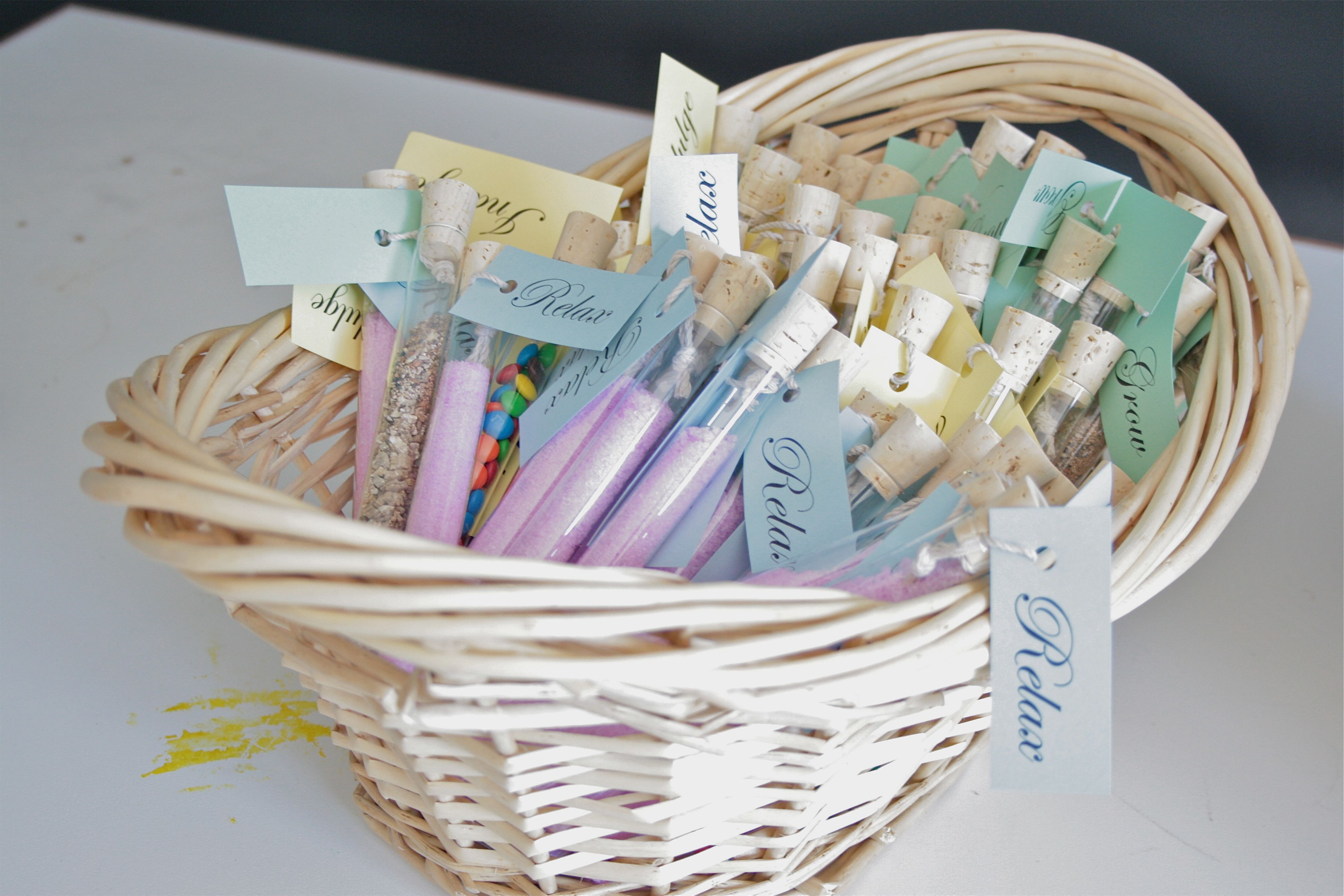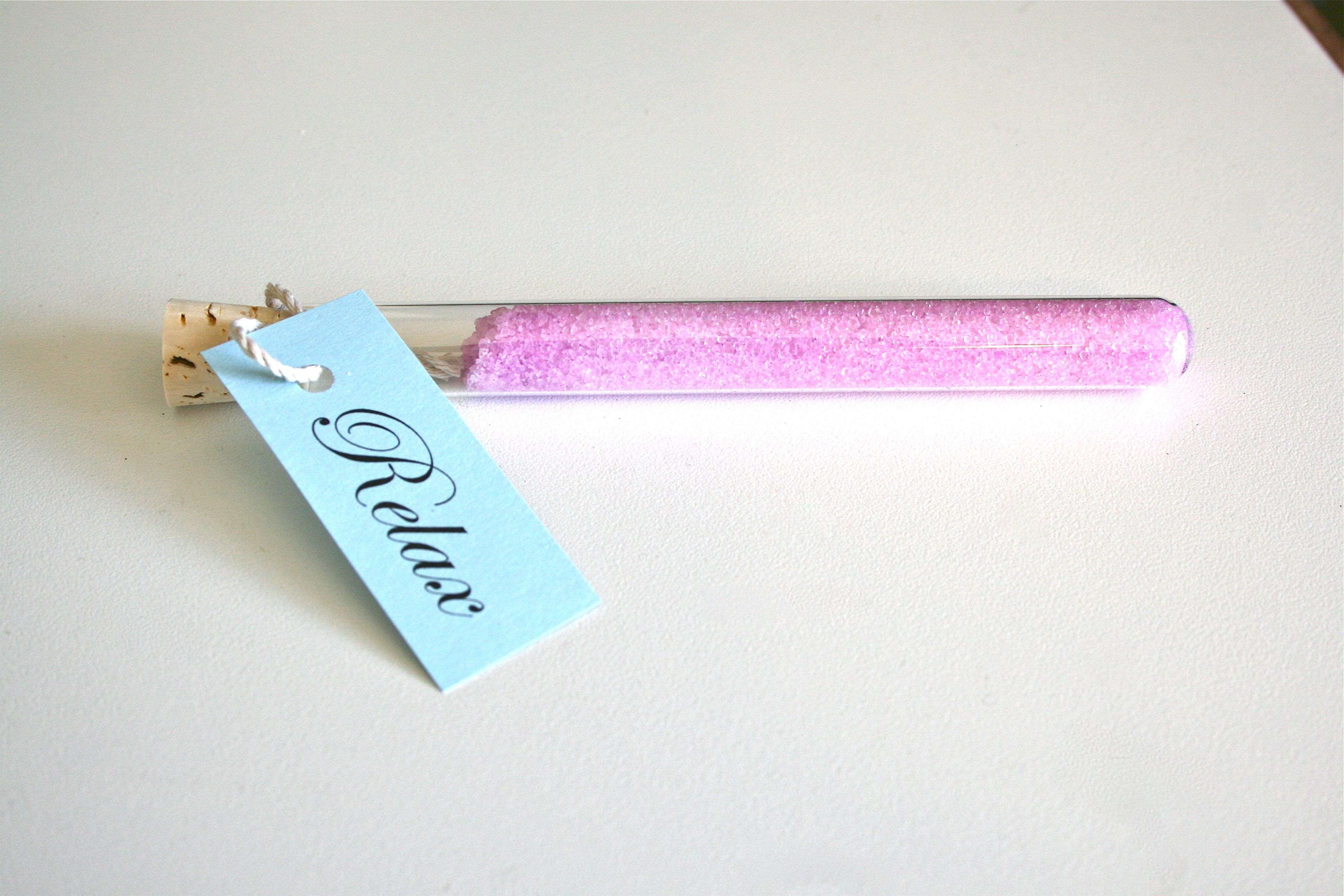 If you can’t quite read the swirly text via the computer screen, it says “Please take your pick! Grow a plot of wild flowers. Indulge in sweet candy pieces. Relax with lavender bath salts.” Also, I added a little note about the glass test tubes being fragile: “Please handle with care.”
