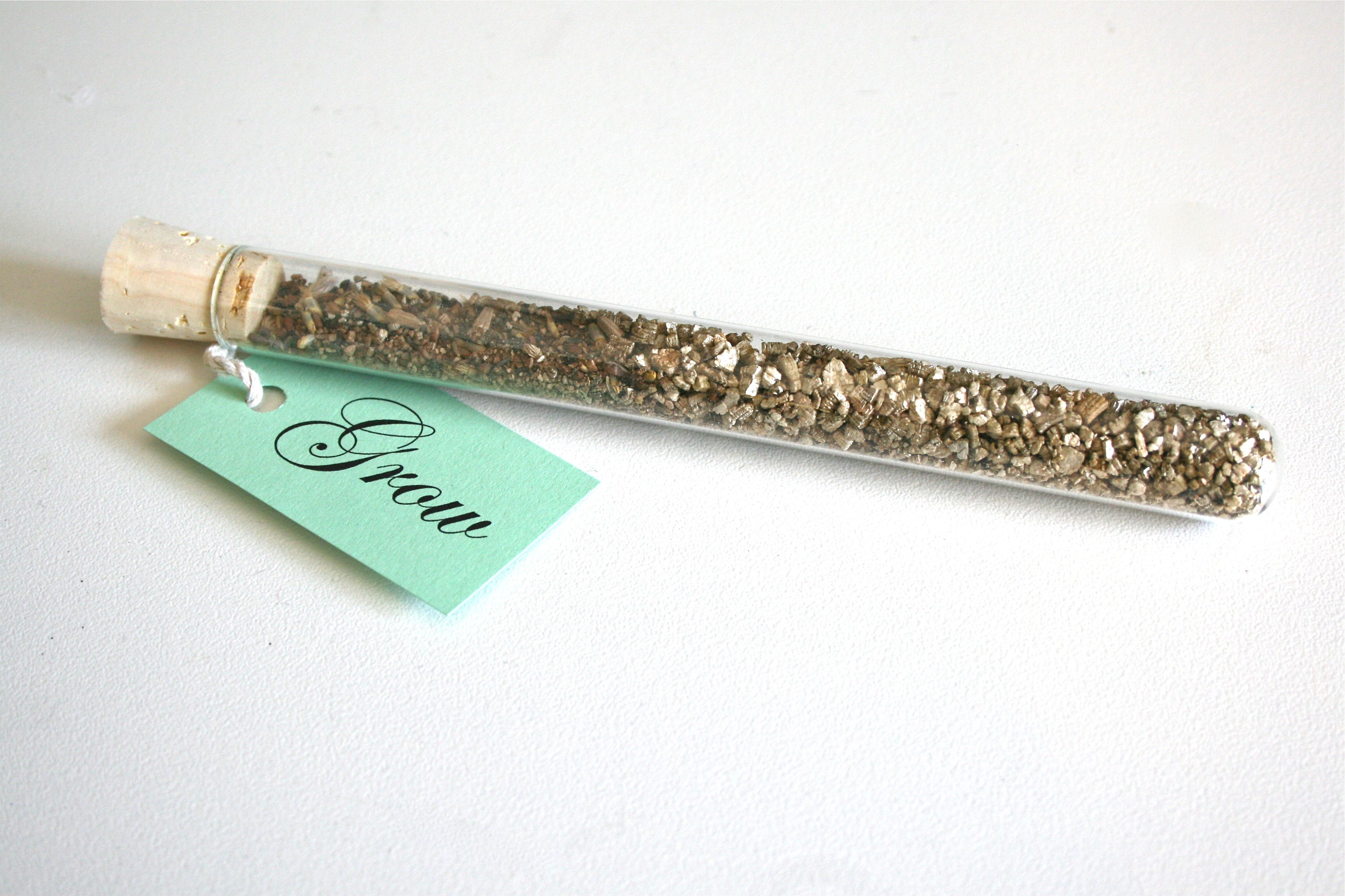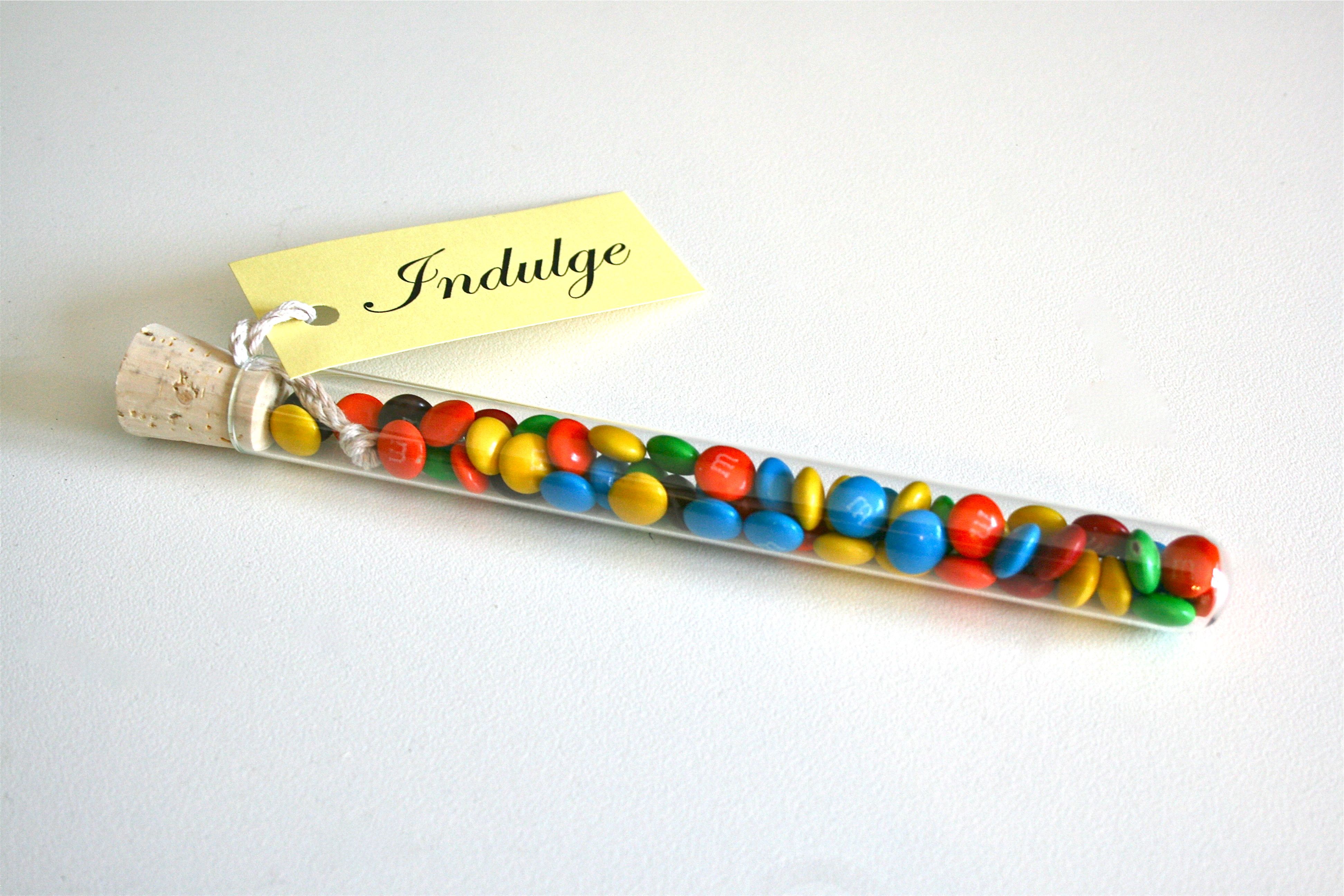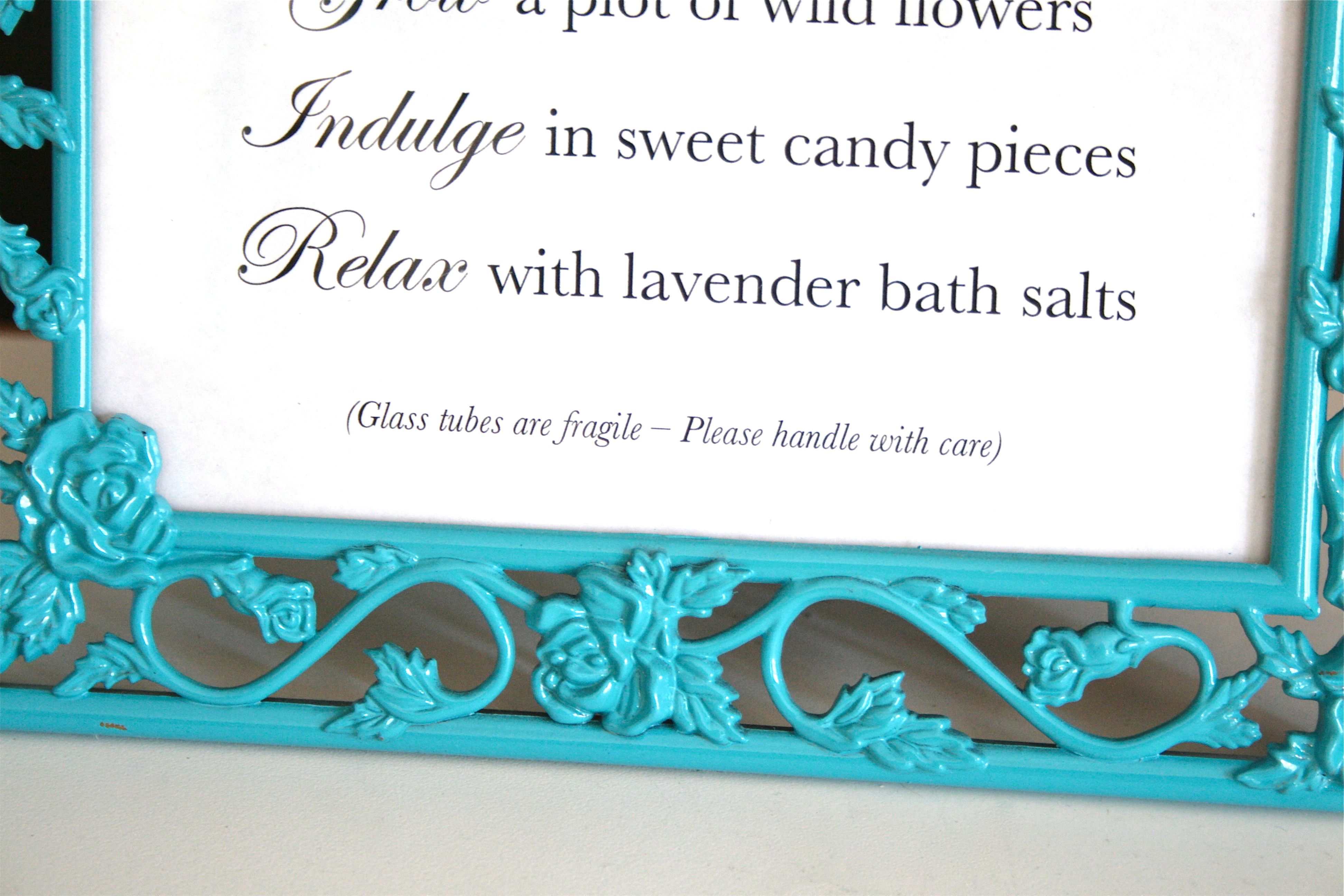 If you can’t quite read the swirly text via the computer screen, it says “Please take your pick! Grow a plot of wild flowers. Indulge in sweet candy pieces. Relax with lavender bath salts.” Also, I added a little note about the glass test tubes being fragile: “Please handle with care.”